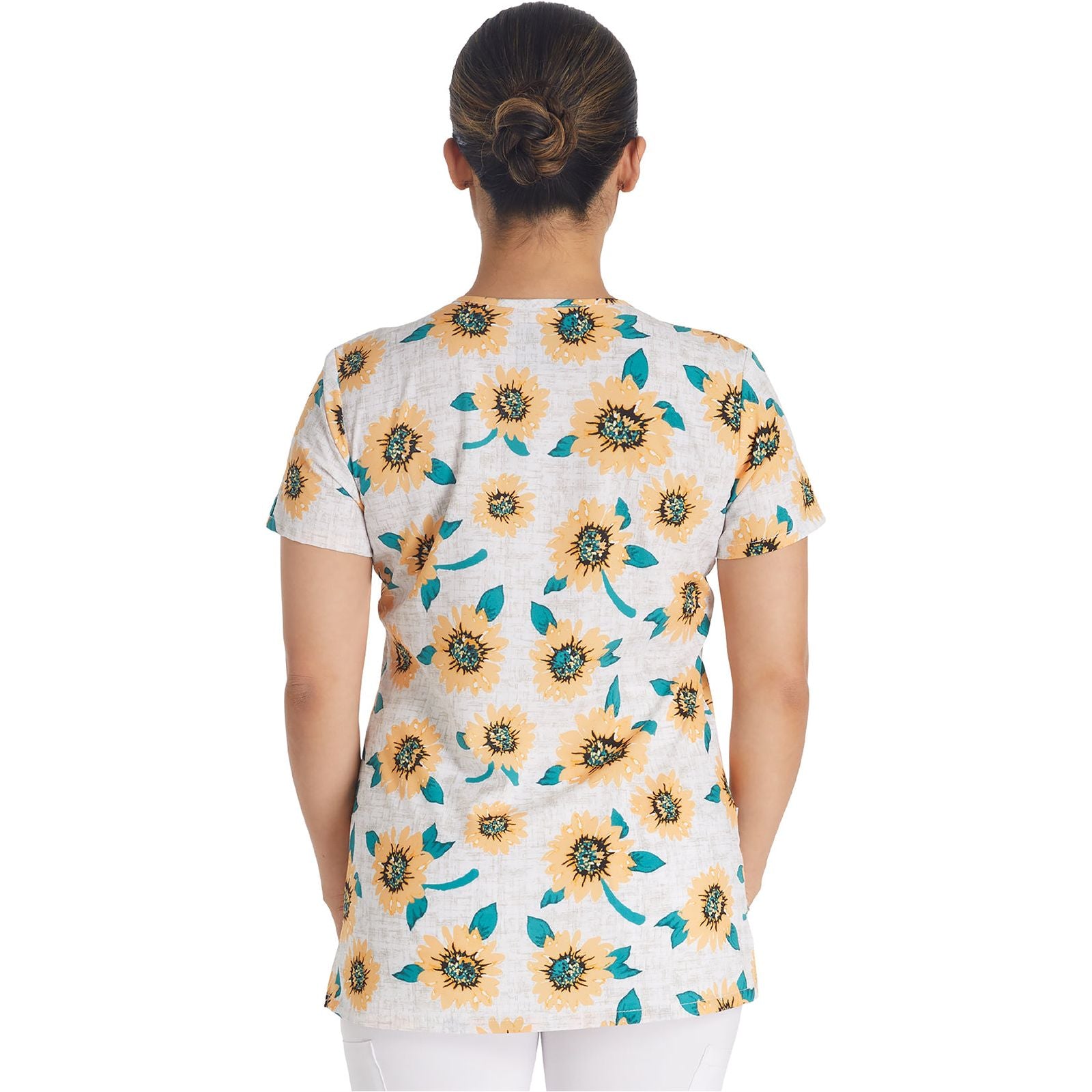 A V-neck print top features two front patch pockets and side vents for ease of movement. Center back length: 27".