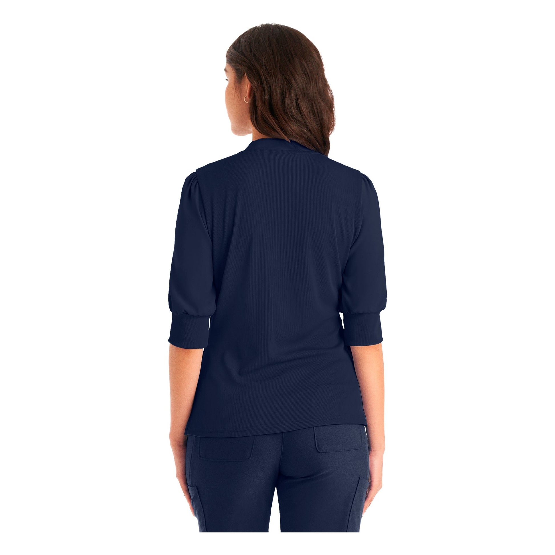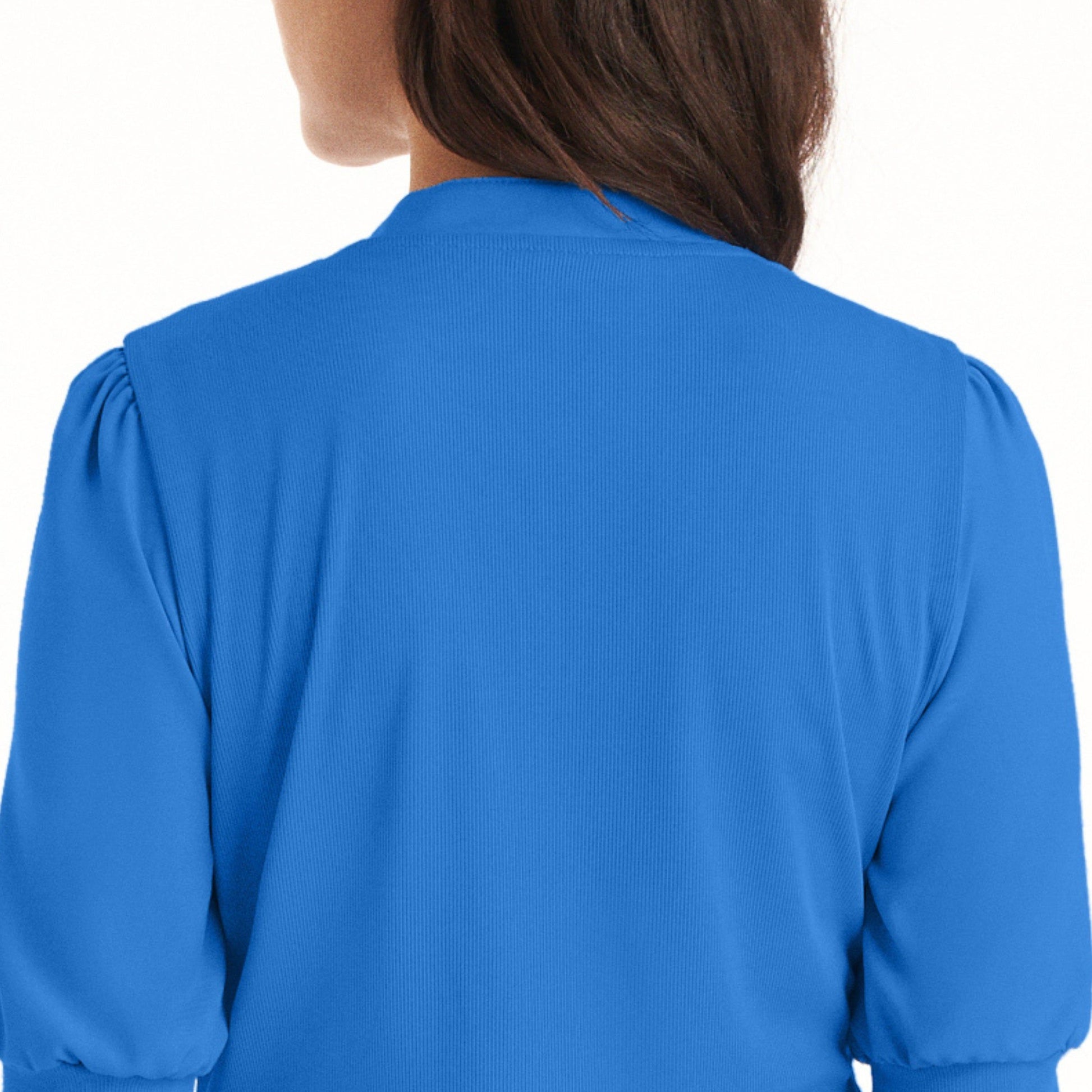 Mix media Contemporary Fit top with puff sleeves that are finished with rib knit cuffs for stretch and mobility. A rib knit body provides next level comfort as you move throughout your day. Features a faux button placket, side vents, 1 chest pocket, and 2 side welt pockets to hold any additional items you may need.