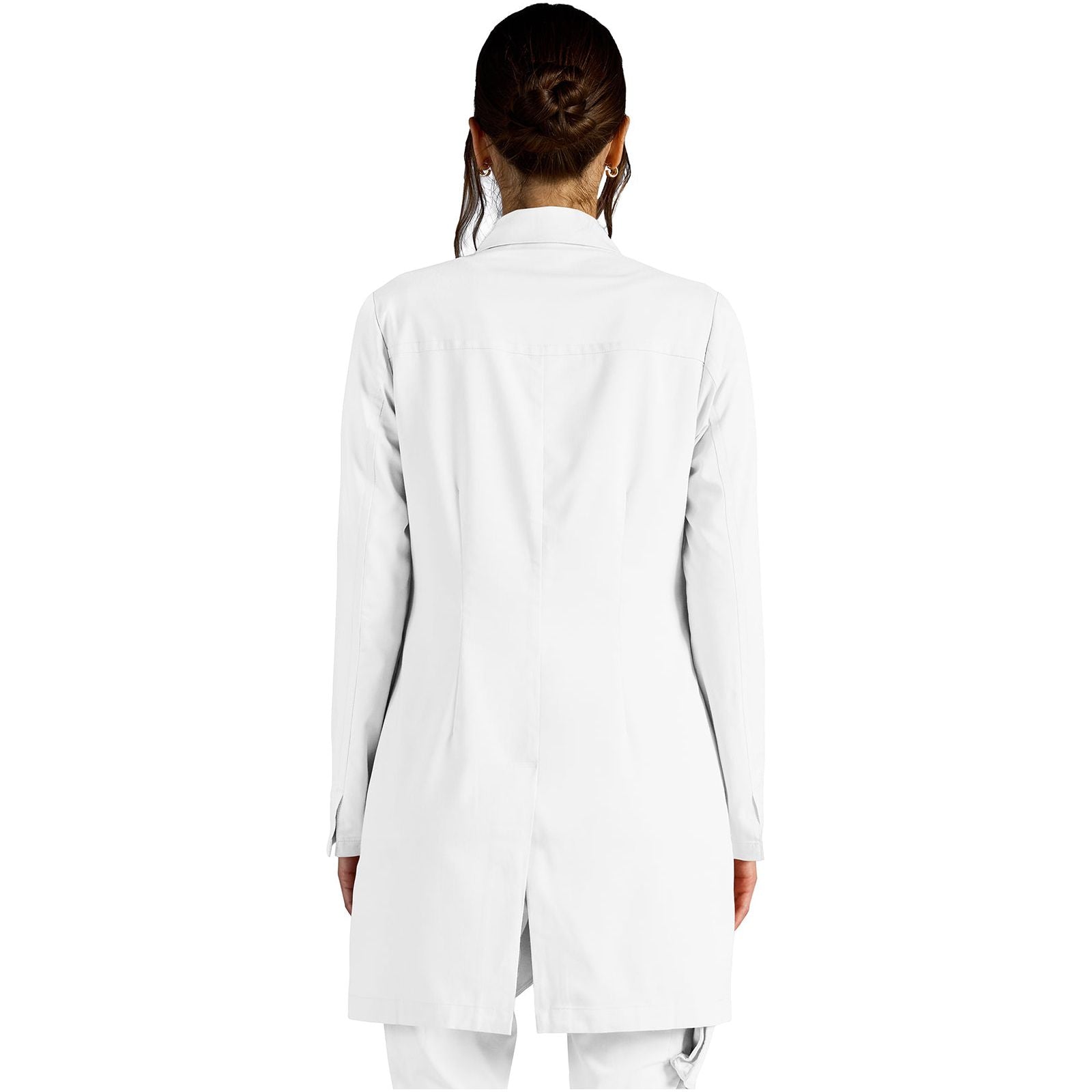 The Modern fit Vera lab coat from Healing Hands x Dr. Kwane features a three-button closure with a rounded notch collar and rounded hem. Healing Hands logo buttons add a sophisticated touch. There are five pockets for organized storage: two front patch pockets, one hidden cell pocket, and two inside welt pockets. A back yoke provides a better fit across the shoulder while a back kick pleat gives more freedom of movement for longer strides and hurrying from appointment to appointment. There are front bust darts and back darts for fit and shaping. Side entry slits provide easy access to pants pockets. Signature Healing Hands lapel pin. Center back length: 34"