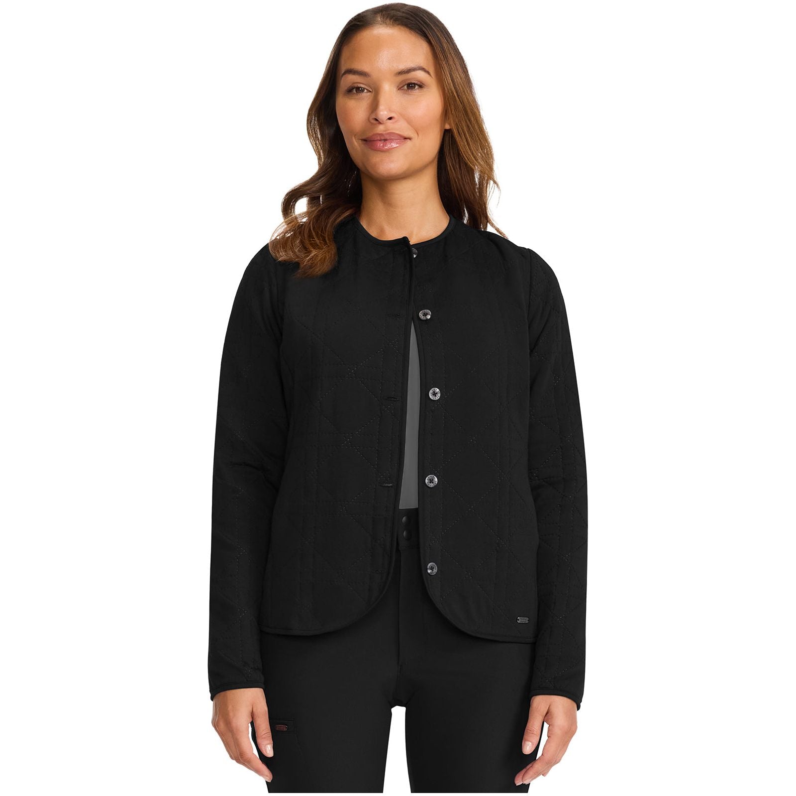 A lovely layer for cooler temps or chilly shifts, this chic new cardi is the ultimate elevated essential. With quilted, breathable fabric and both inner and outer pockets, its classic button-down design can be worn alone or over scrubs.