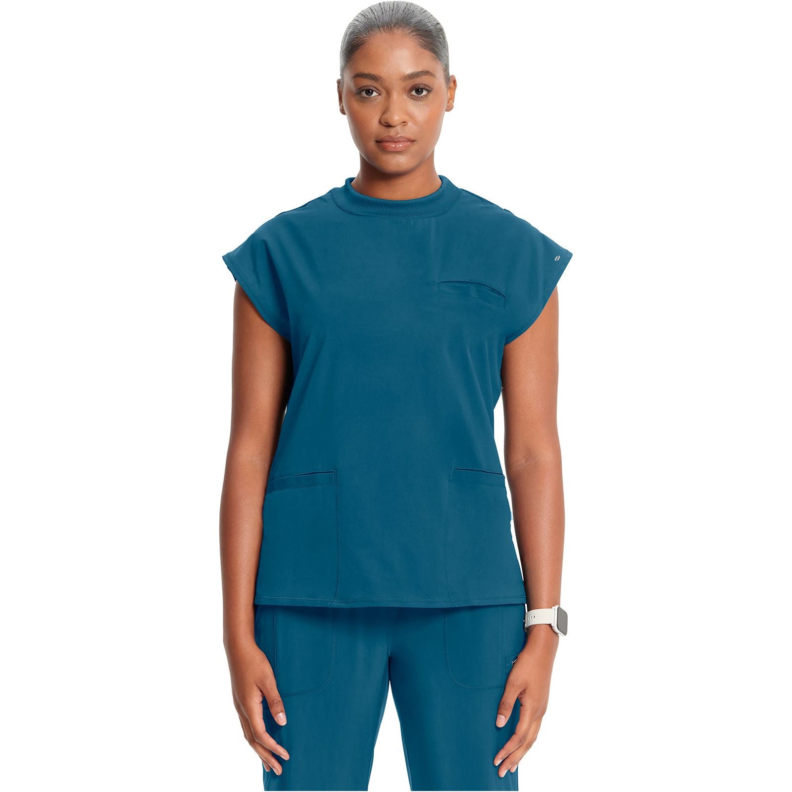 This Contemporary fit mock neck top features dolman sleeves and a rib-knit back panel. There are four pockets: one chest welt pocket, two front welt pockets, and one hidden utility pocket on the wearer's right side. Other features include a curved high-low hem and side vents. Rib-knit trim on the mock neck completes the look. Center back length (size Small): 27 ½"