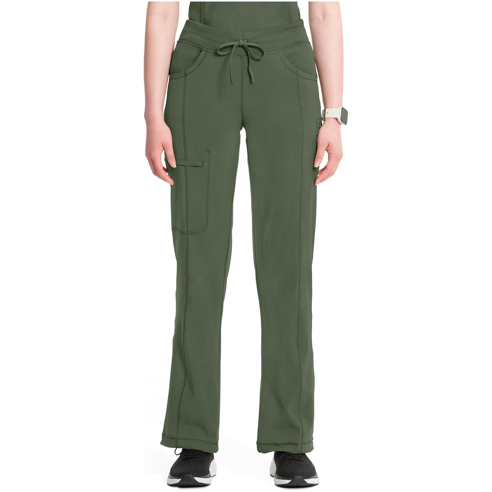 A Contemporary fit, low rise, straight leg pant features an elastic knit waistband and adjustable drawstring. Also featured are rib knit front and back yokes, angled front pockets, front leg seams with a zip closure cargo pocket, one back patch pocket, a bungee instrument loop below left pocket, a bungee cord with a toggle at the leg hems for adjustability and coverstitch detail throughout. Inseam: 31" The comfortable stretch poplin fabric and super stretchy rib knit is the perfect combo for healthcare professionals.