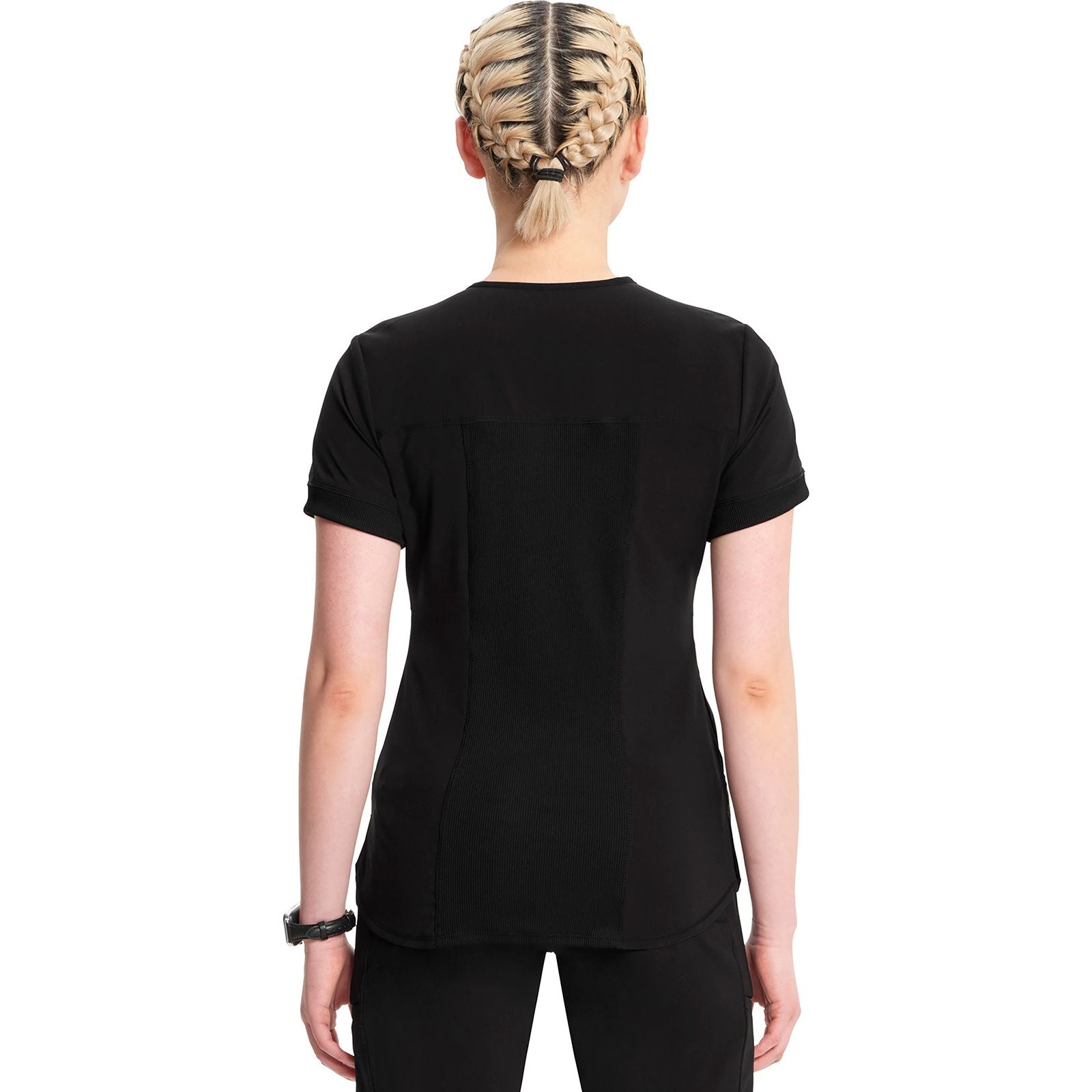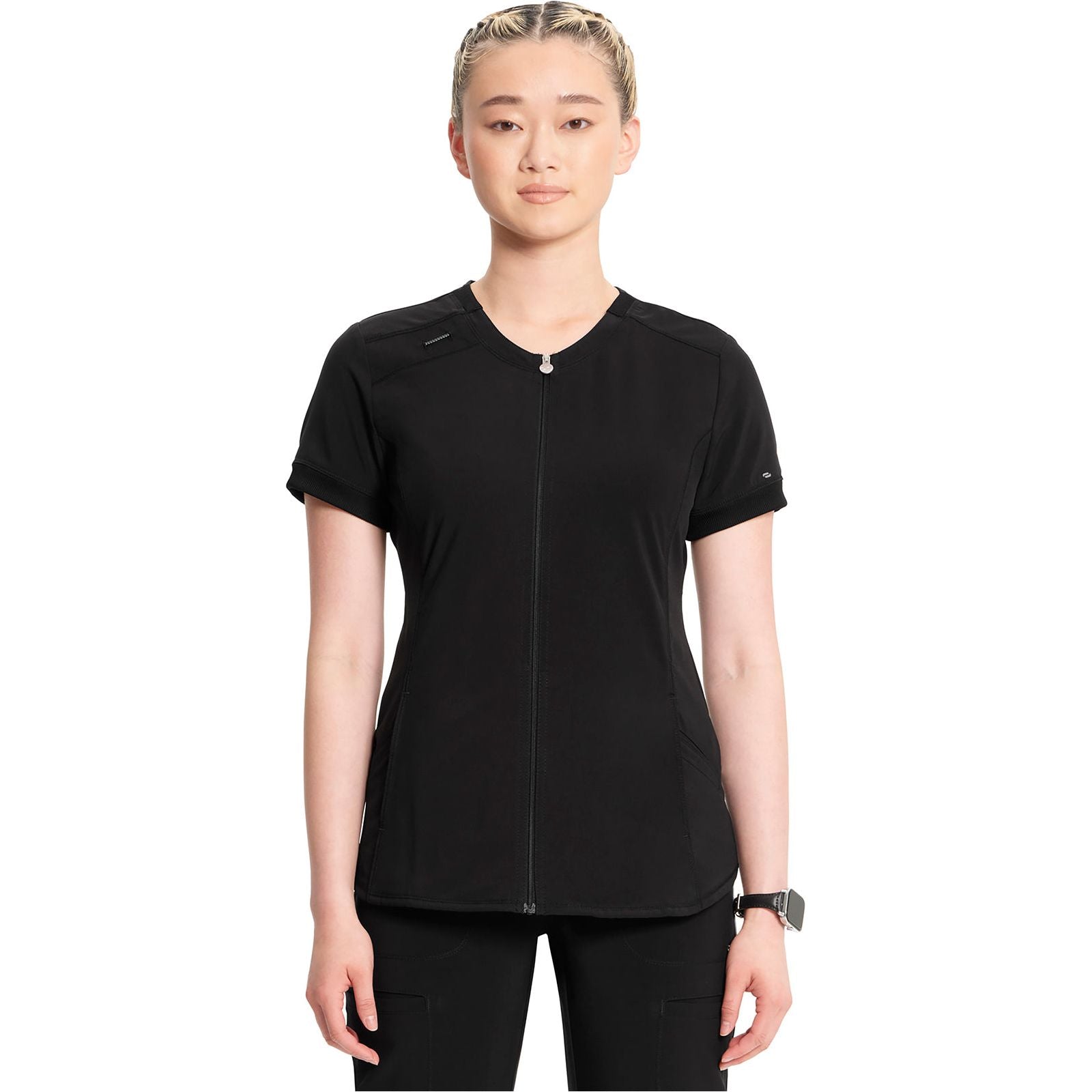 Add a touch of modern polish to your medical wardrobe with this flattering mixed media V-neck top, finished with exposed zip styling for subtle edge. Touches of rib-knit at the neck, cuffs, and center back panel provide comfort and flexibility, in addition to side vents that allow for greater ease of movement. The style also features a shirttail hem, front welt and in-seam pockets for storage, and princess seaming to create a slim silhouette. Contemporary fit. Center back length: 26". The comfortable stretch poplin fabric and super stretchy rib-knit is the perfect combo for healthcare professionals.