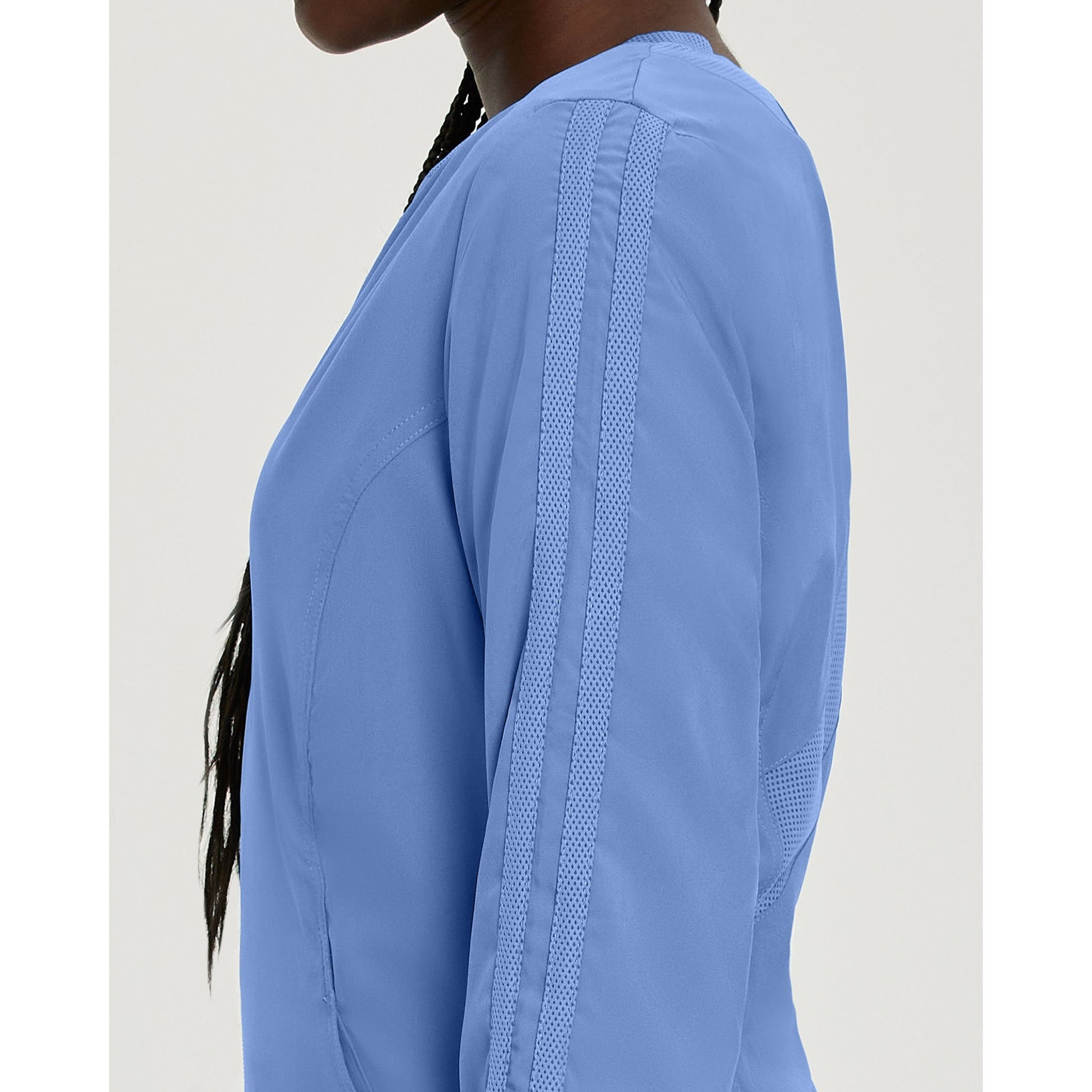 The FIT women's warm-up scrub jacket features a 4-way super stretch for maximum comfort and flexibility. This quick-dry fabric pulls moisture to the surface so your skin feels dry through your most active shifts. This crew neck scrub jacket has a mesh collar, arm cuffs, and detailing, a zip-front closure, and a mesh back for ventilation. Please Note: All sale items are final sale. No exchanges or refunds will be accepted on these items.