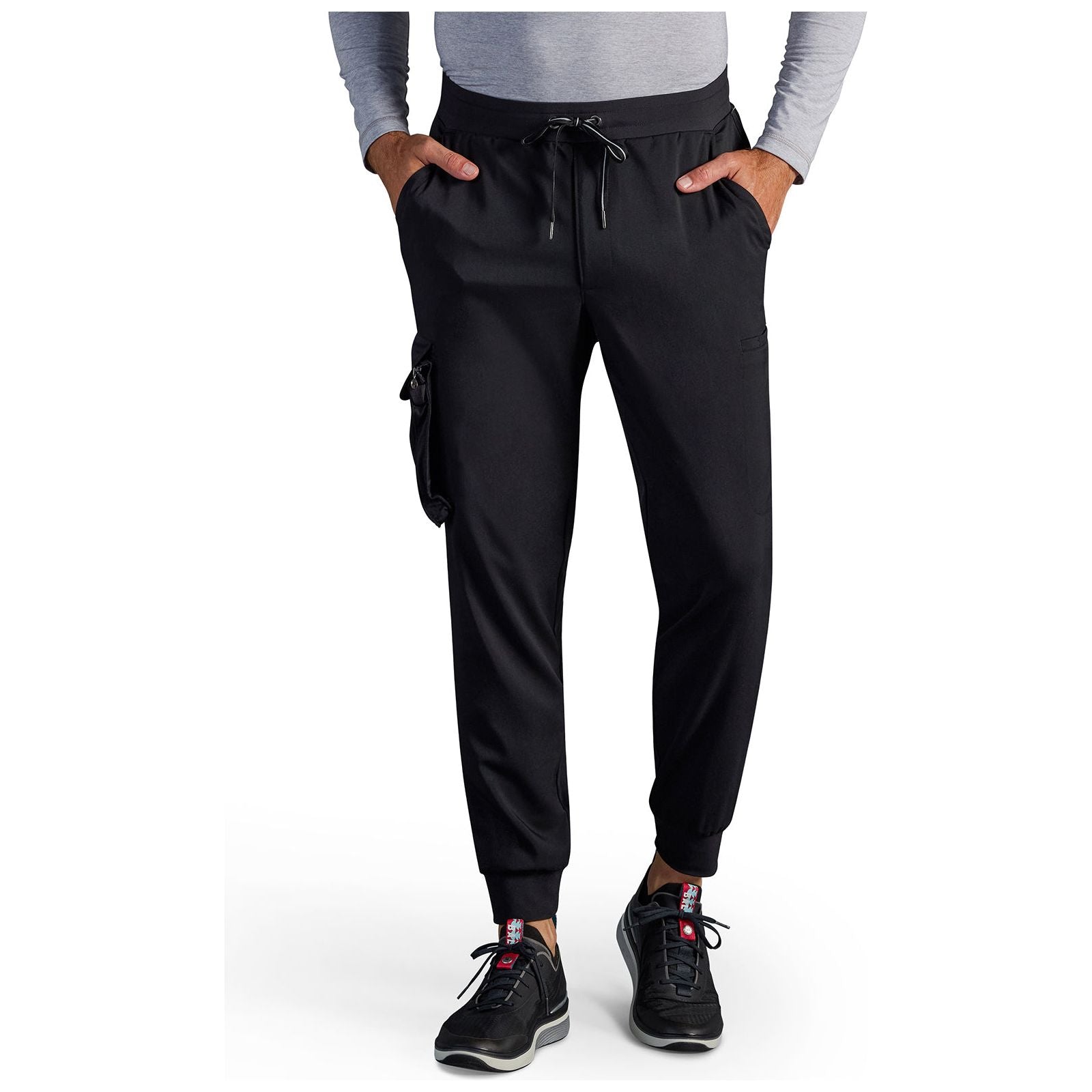 Soft woven scrub fabric on the front plus a stretchy full knit back equals one very stylish Men's scrub jogger. This pant also has a unique detail: a detachable pocket for on-the-go storage. The Healing Hands x Dr. Kwane Men's Vernon mid rise zip fly scrub jogger features an elasticized waistband with a drawstring for adjustability and security. There are seven pockets for organized storage: two front slant pockets, two welt cargo pockets, and two back welt pockets. Detachable pocket on wearer's right side converts into a bag. A back yoke provides a better fit. The mixed media design continues with dyed-to-match knit back panels and knit cuffs. Modern fit. Tapered jogger leg, 10" leg opening. Inseam: 29"