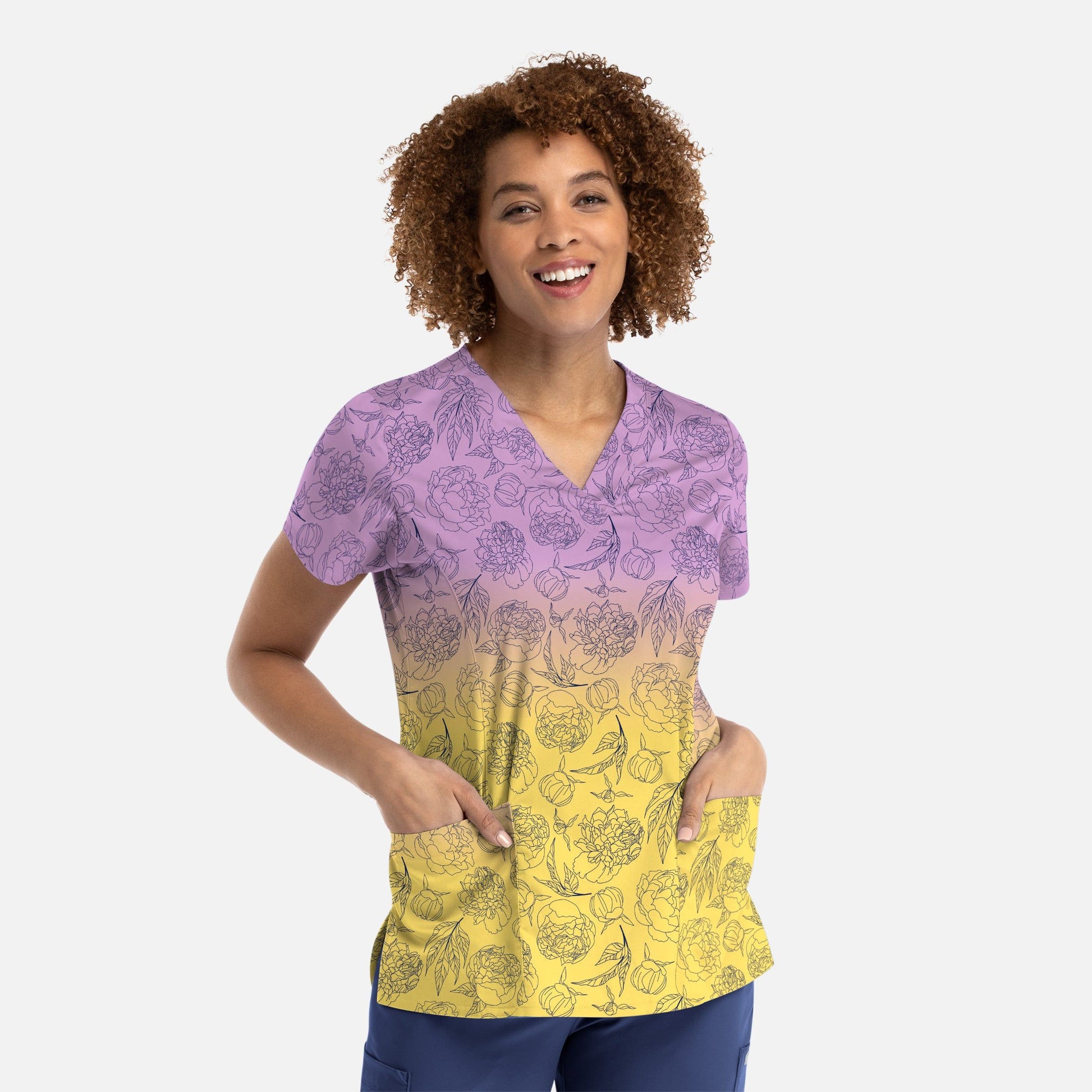 Printed curved v-neck top Front princess seams and back darts for added style and shape Two slant patch pockets with inner cell pocket Solid contrast at back facing Side vents265 body length size small