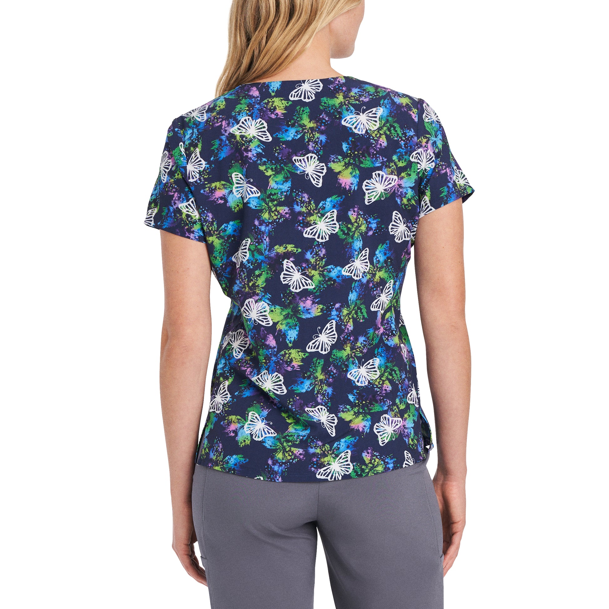 This Contemporary Fit v-neck top features 2 front pockets and a shirttail hemline to easily be worn tucked or untucked. Front and back princess seams for a flattering contoured shape and fit.