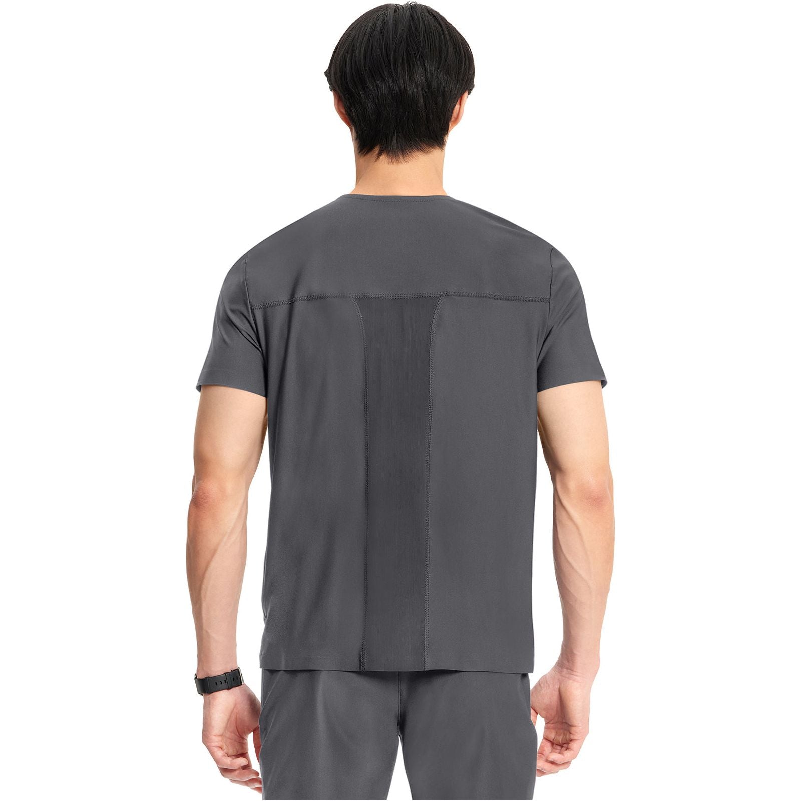 This men¿s knit scrub top is made of a nylon and spandex blend that looks and wears like woven fabric offering both comfort and durability. Cool crossover construction at the bottom point of the v-shape. There are three pockets to store supplies: one chest pocket with contrast colored rubber-tipped zipper pull and two side seam pockets. Mesh overlay on front panels and center back panel add style points and stretch. Bonded hems for a clean finish. Coverstitched seams for added detailing. Men's Contemporary Slim fit. Center back length (size Medium): 27"
