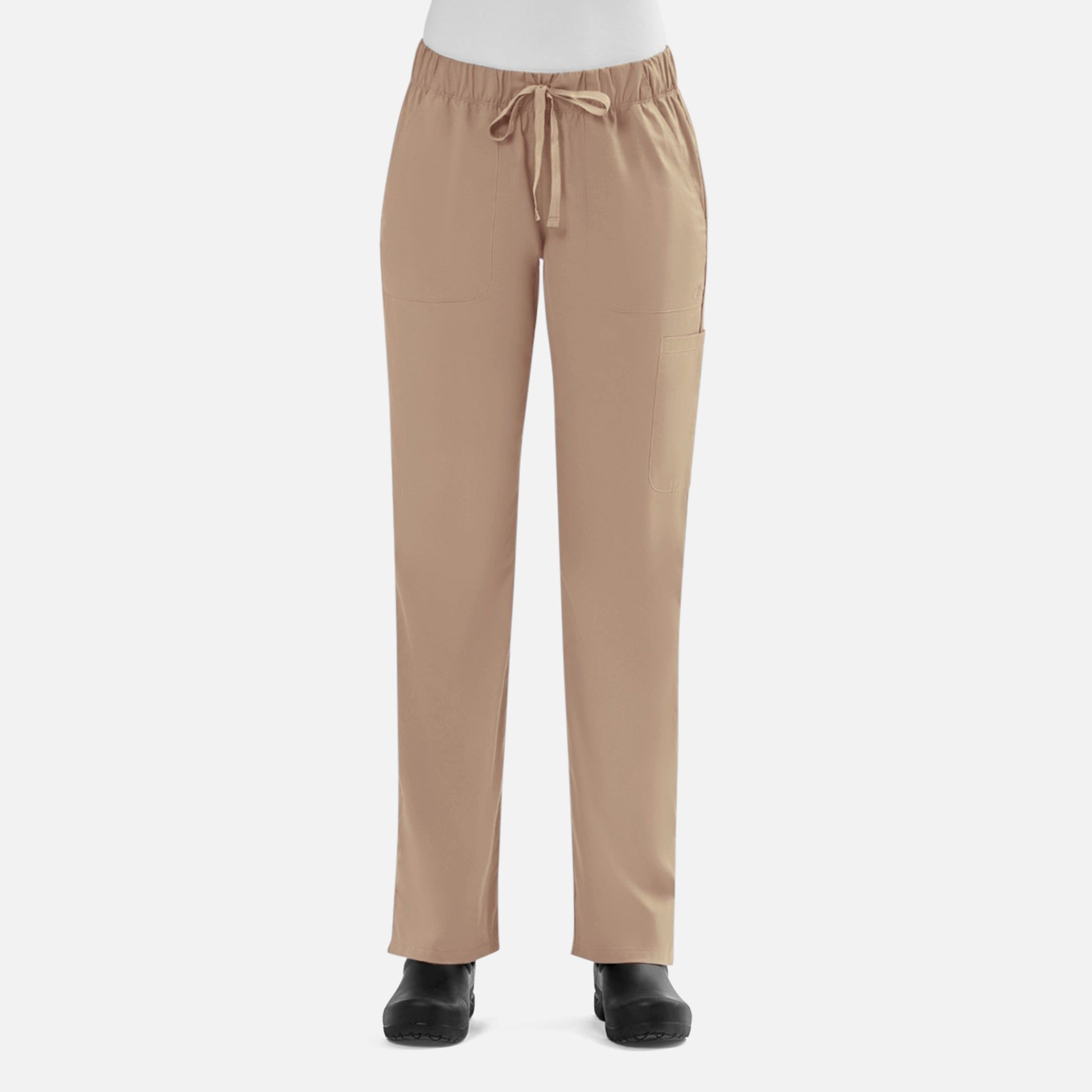 Ladies tapered leg pant with wide full elastic waistband with dyed-to-match drawstring Two front slant patch pockets One cargo pocket One back patch pocket Floral prints at inner backside vents