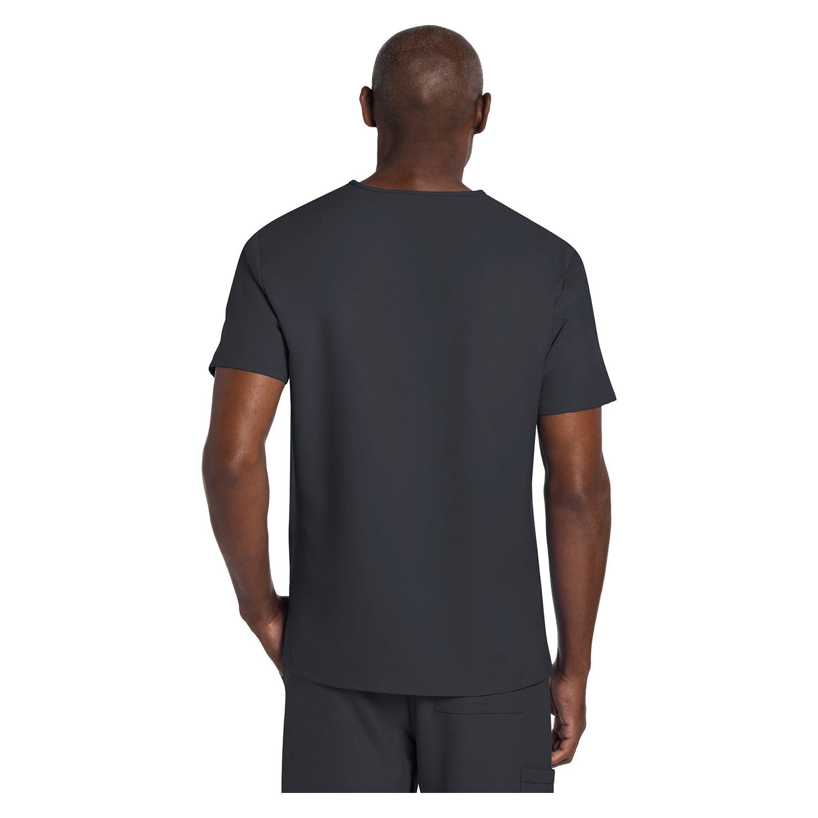 This Men's fit v-neck top features two roomy patch pockets with reverse trim at the pocket top. The are side vents for ease of movement and decorative topstitching for added style. Men's fit. Center back length: 28. 1/2"