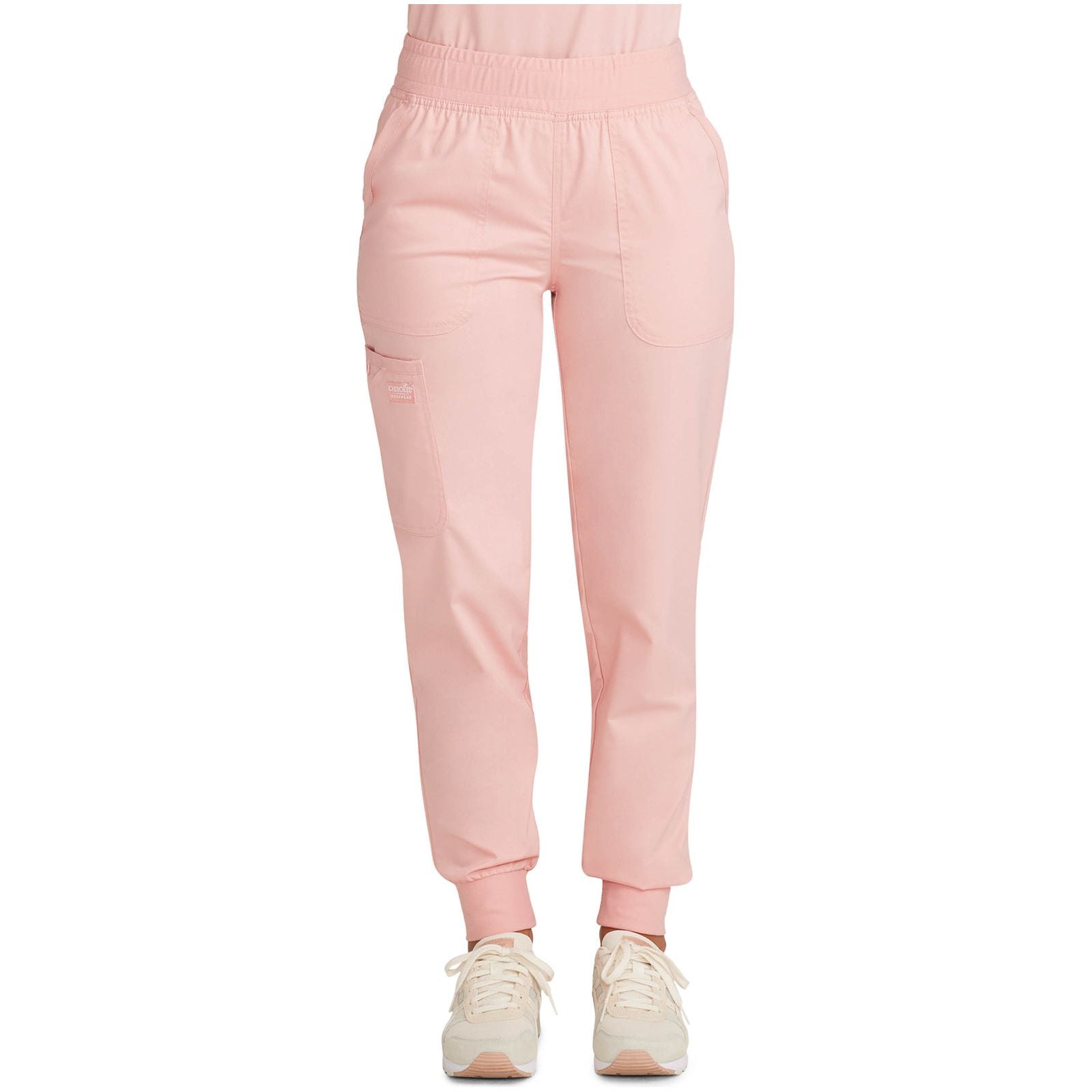 This Modern Classic fit mid rise pull-on jogger has an encased elastic knit waistband with interior drawstring. There are five pockets: two front patch pockets, a double cargo pocket with a bungee ID badge loop, and one back patch pocket. The pant also features a tapered leg and knit cuffs. Leg opening: 9 1/2". Inseam: 28 1/2"