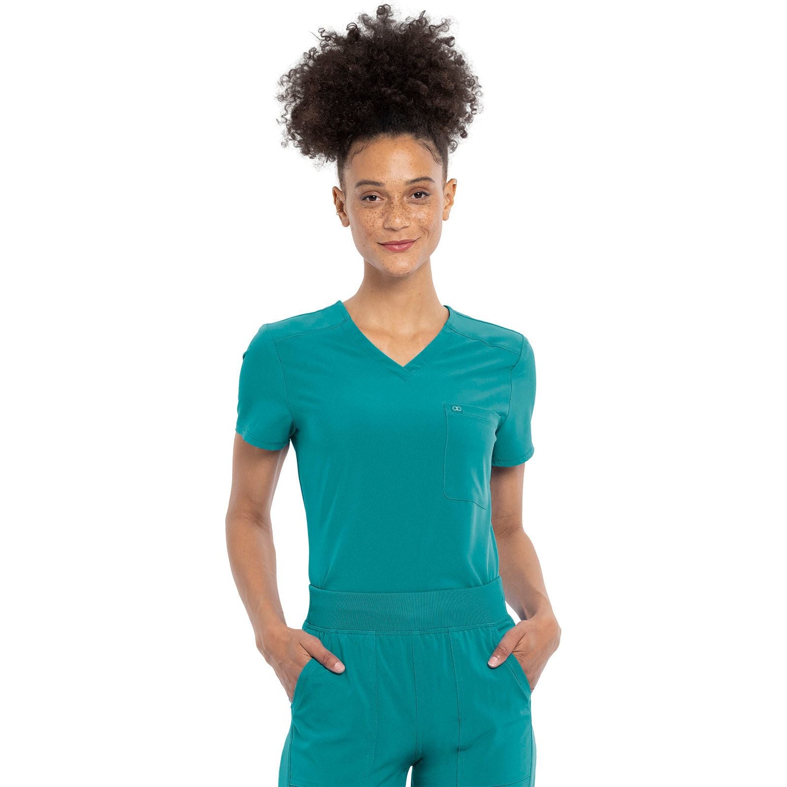 This Contemporary fit V-neck top has rib-knit insets at the neckline. Other features include front and back yoke seams plus front and back princess seams. There is a chest pocket on the wearer's left side. A center back rib-knit panel provides extra comfort and stretch. A shirttail hem and side vents complete the look. This style looks great tucked in or untucked. Center back length: 26"