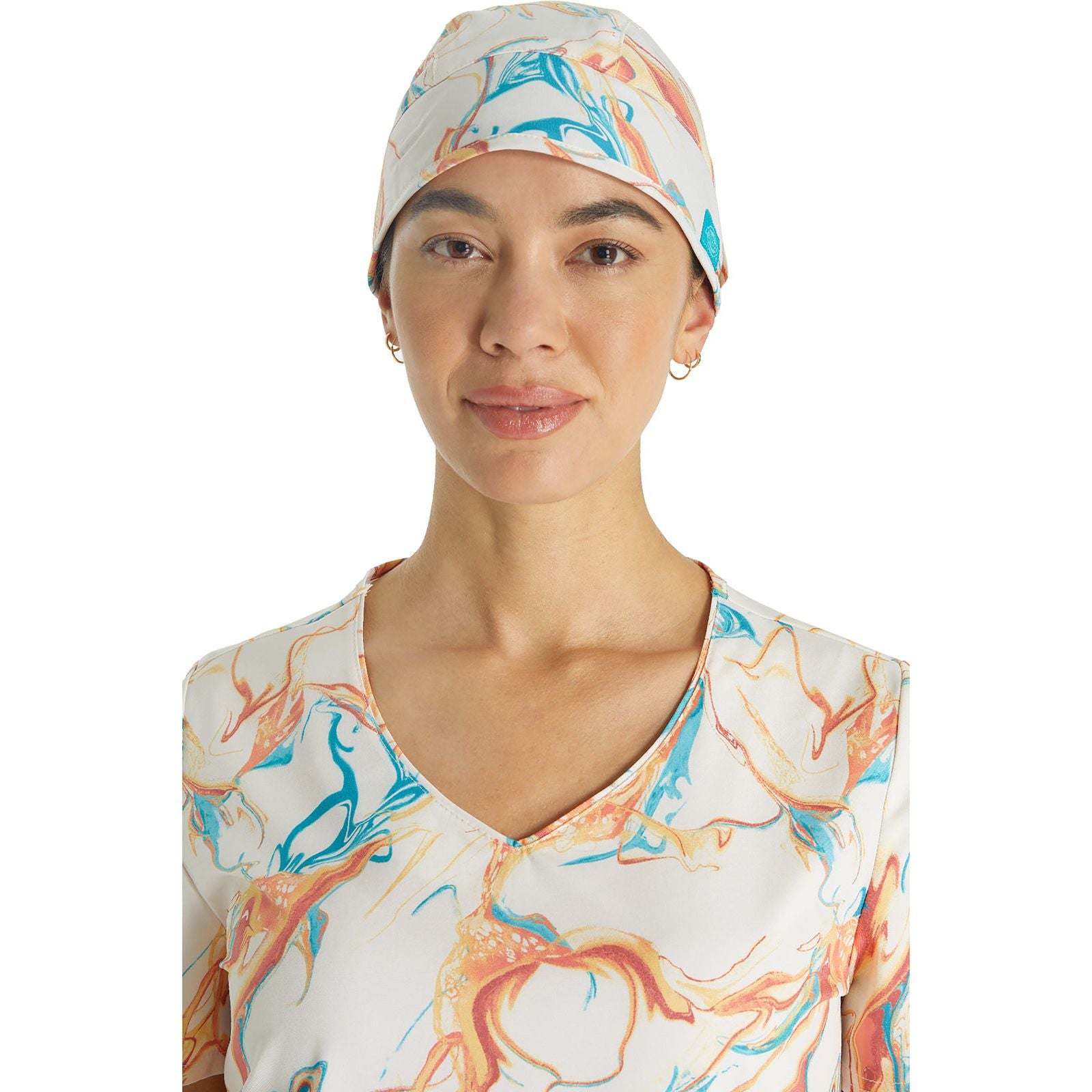 This adjustable print scrubs hat features snap tabs by ears to comfortably hold a protective face mask in place. (Mask sold separately.) Hat includes terry-cloth sweatband for comfort and contoured seaming with back elastic and tie for a better fit. Unisex fit.