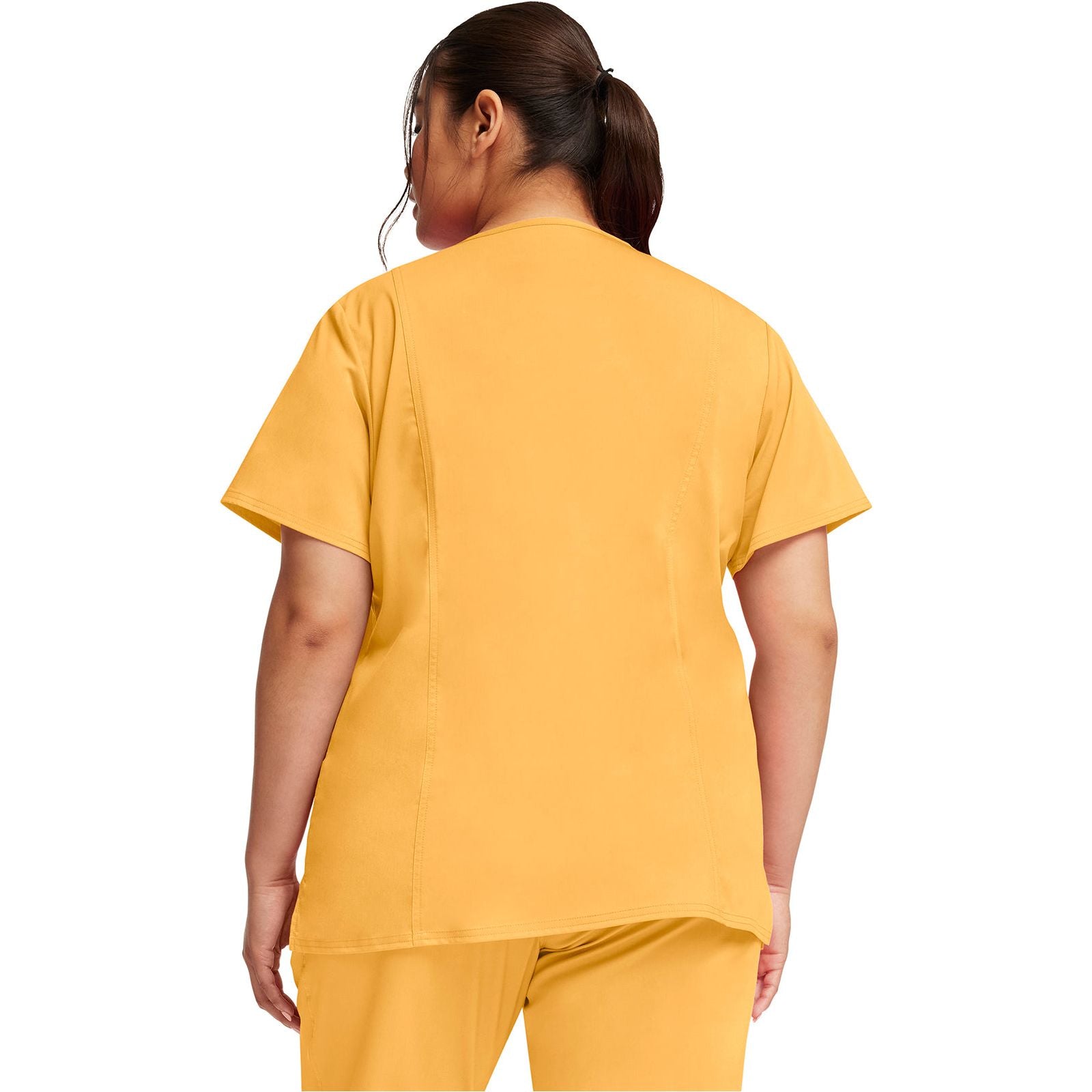 A Modern Classic fit V-neck top features patch pockets, an instrument loop, pencil stitch, logo label with bungee loop, back princess seams, and side vents. Center back length: 27"