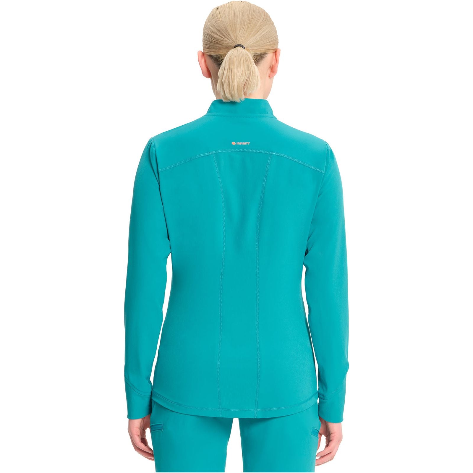 A Contemporary fit, sporty zip front jacket features front and back shoulder yokes, front princess seams with flat piping, hidden pockets with a zipper closure and a logo zipper pull. The back panel, collar, cuffs and waistband are made in a stretch rib knit for extra comfort. Coverstitch detail throughout. Center back length: 26". The comfortable stretch poplin fabric and super stretchy rib knit is the perfect combo for healthcare professionals.