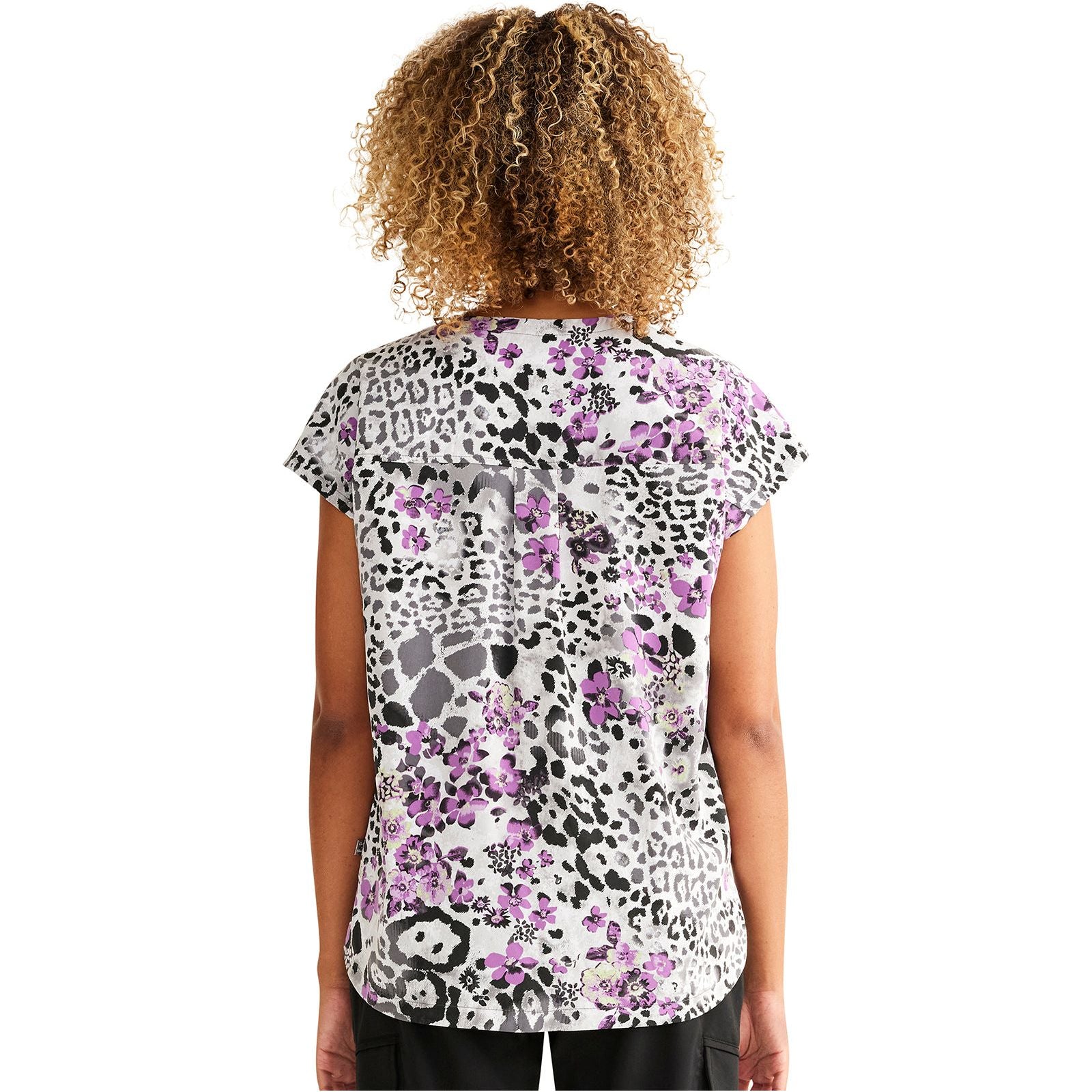 This Relaxed fit dolman sleeve v-neck print top has a partial zip at the center front, a back yoke seam with a box pleat, and two side welt pockets. Other features include side vents and a rounded hem. Center back length: 26".