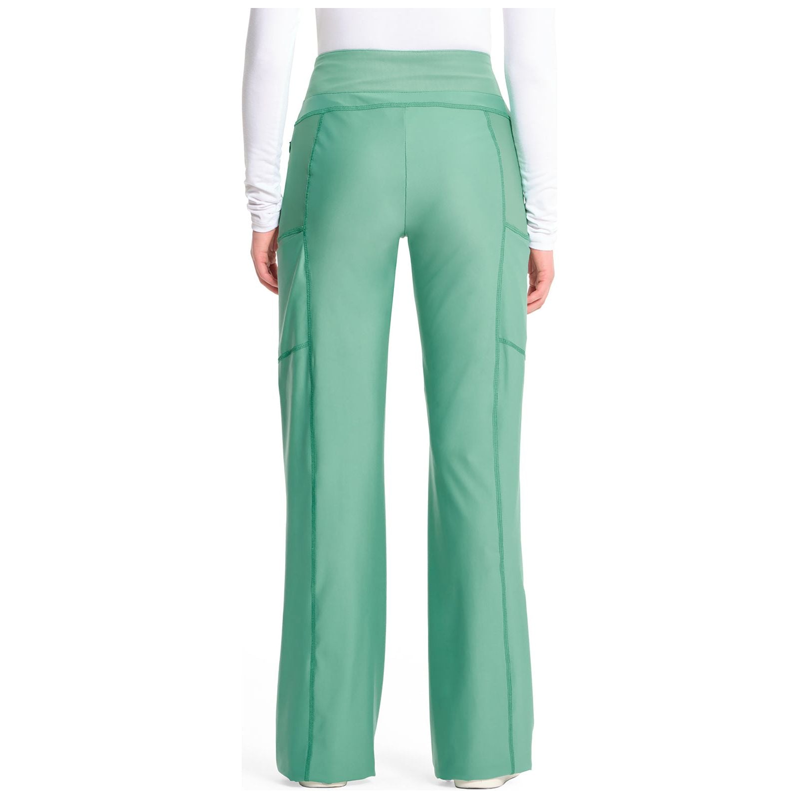 Supreme comfort without sacrificing professionalism. This mid rise knit pull-on trouser pant is made of a nylon and spandex blend that looks and wears like woven fabric. Reinforced-elastic waistband with crossover design for security and style. The are five pockets for organized storage: two side seam zipper pockets, two cargo pockets (pen/instrument slot on right cargo), and one back zipper pocket on wearer's right back yoke seam. Center front leg seams and shaped leg panels. Tonal mesh overlay on waistband and leg panels. Back yoke for a better fit. Coverstitched seams finish this scrub pant. Contemporary Slim fit. Wide leg, 21 ½" opening. Inseam: 31"