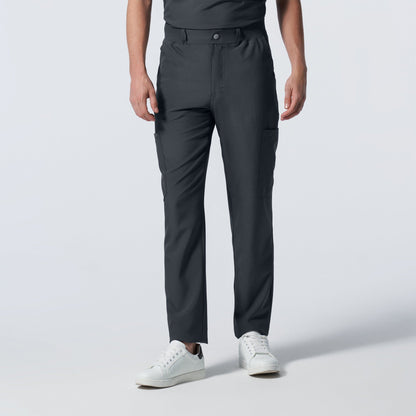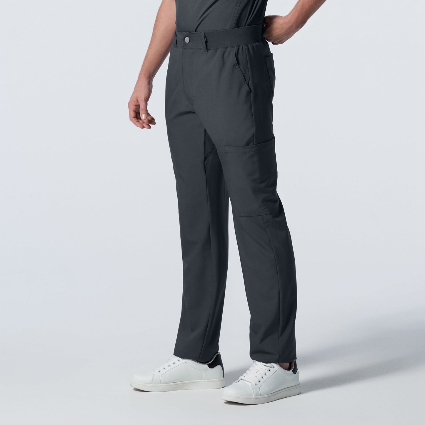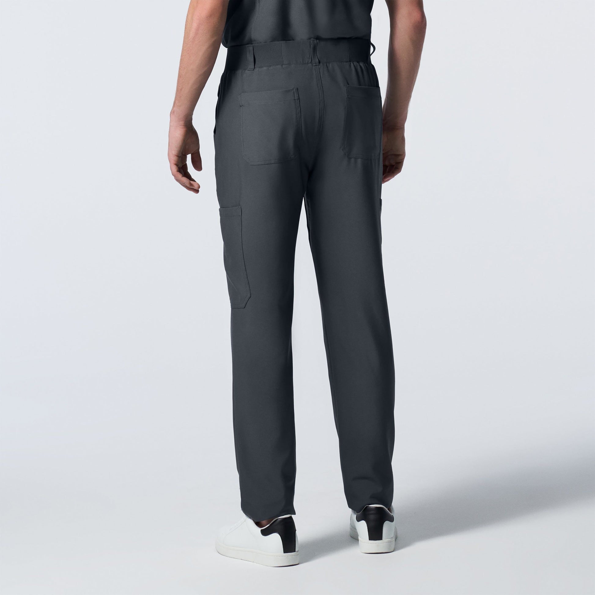 These versatile Men's fit, zip fly, tapered leg pant have a stretchy rib knit waistband with an internal adjustable drawstring, for comfort and security. This pant also provides a generous amount of storage that meets the demands of your busy workday with 2 front pockets, 2 Cargo pockets, 2 Back pockets and a bonus hidden front money clip pocket and a hidden back zip pocket.