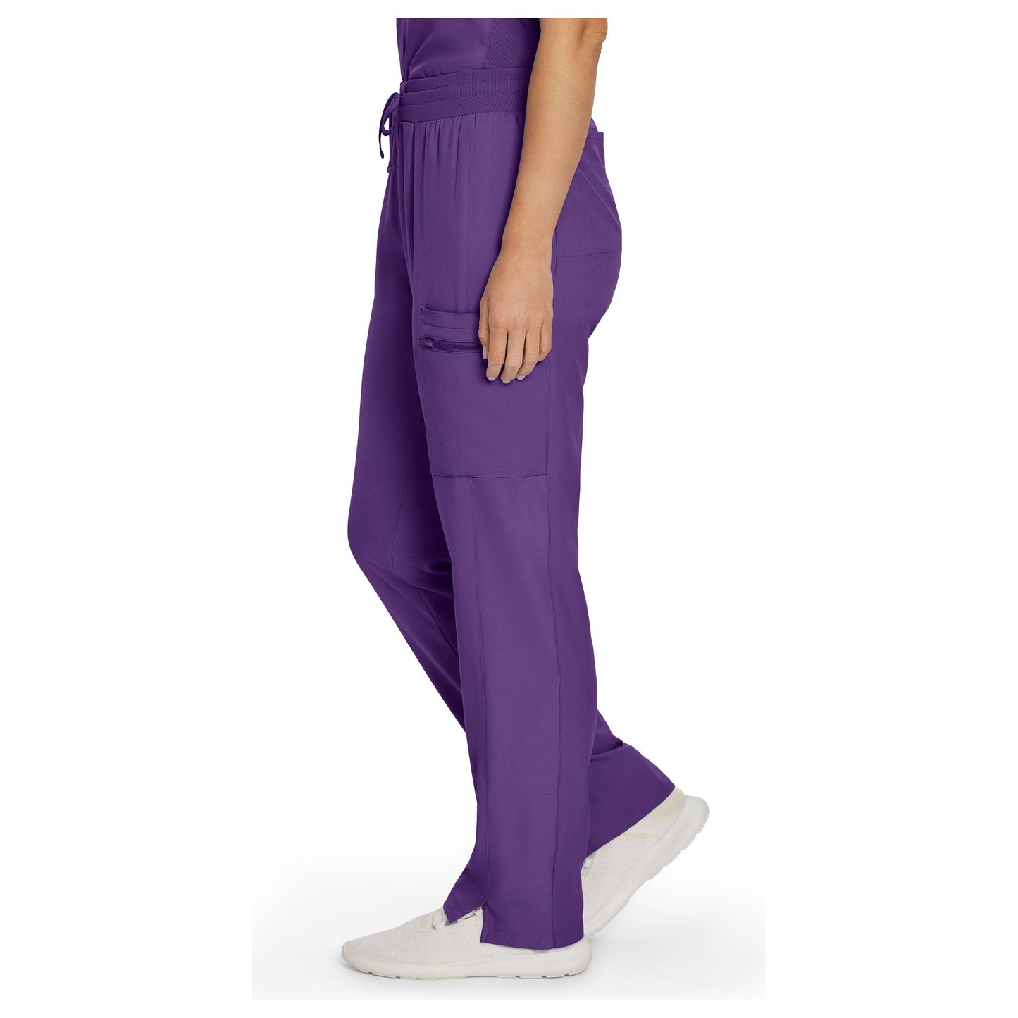 These women's mid-rise straight-leg scrub pants feature a soft rib-knit waistband with a convertible drawstring that can be tied inside or outside the waist, giving you the ability to adjust your look as you see fit. Our modern tailored fit flatters your shape, while our moisture-wicking super stretch fabric provides the comfort and flexibility your work requires throughout the day. Seven pockets, including hidden hip pockets and a secure zip cargo pocket keep your essentials within easy reach.