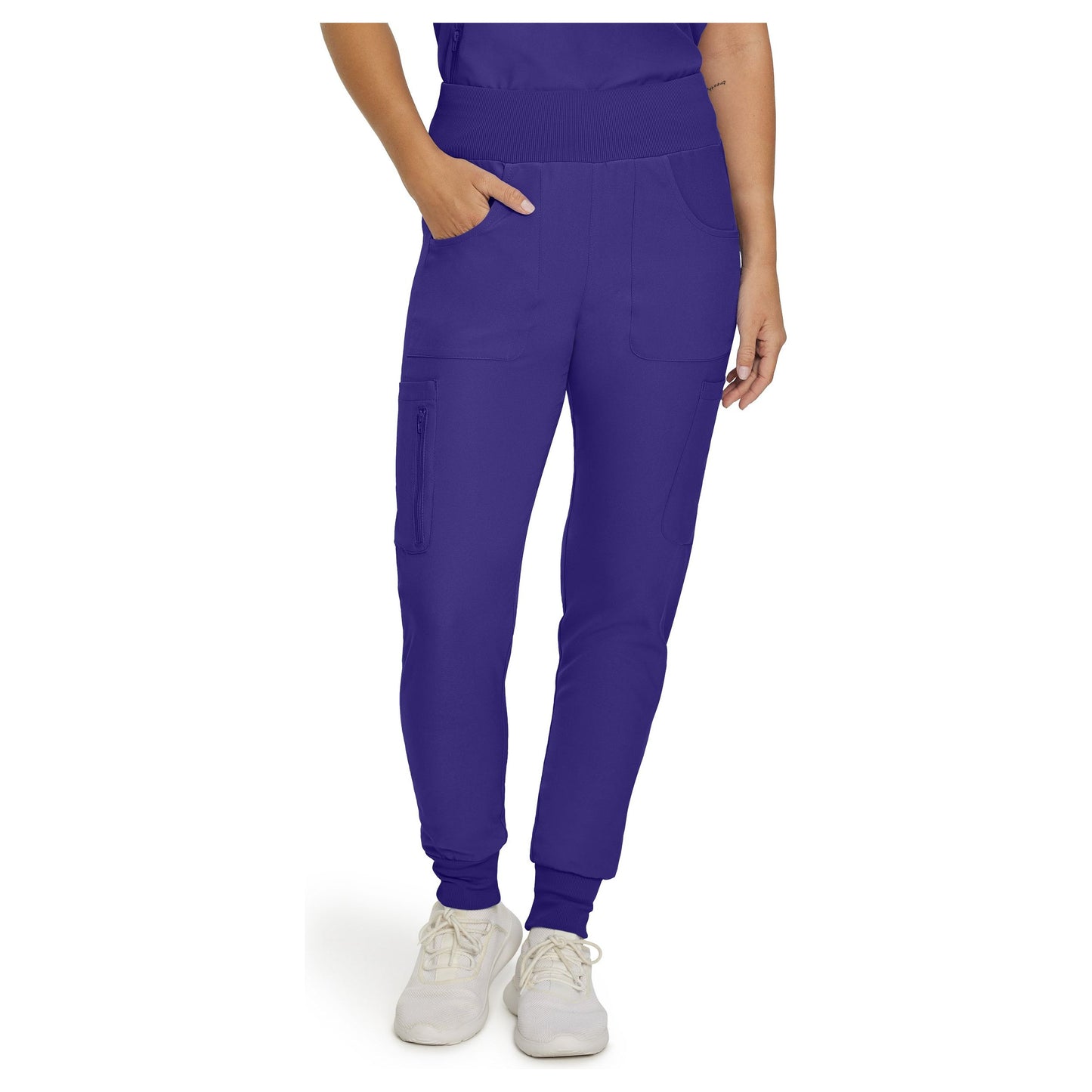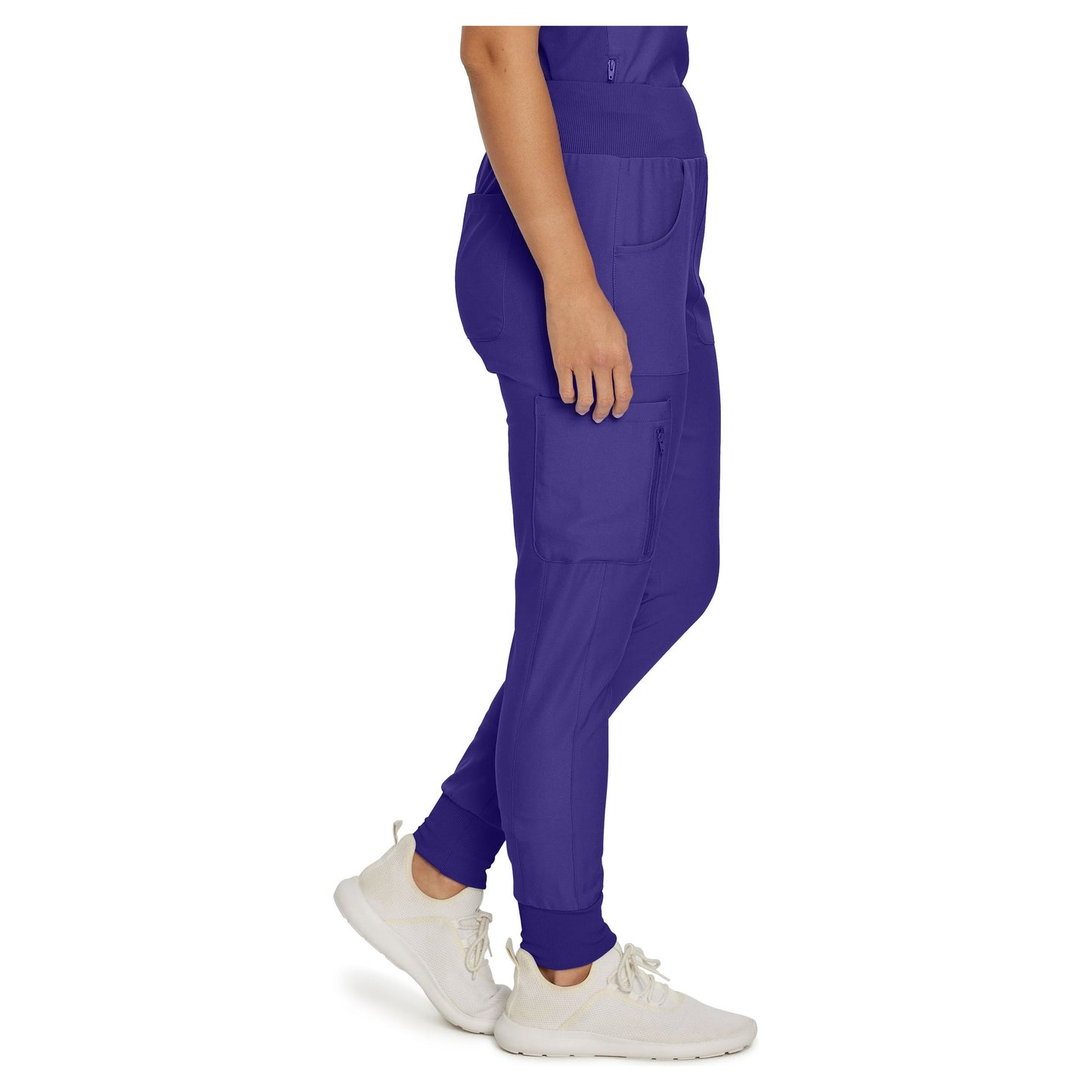 These women's mid-rise jogger scrub pants feature a stretchy rib-knit waistband with an internal drawstring for a clean look with an adjustable fit. Soft, comfortable rib-knit leg cuffs and hidden rib-knit panels down the inseam of the pant legs allows for ample freedom of movement. Our modern tailored fit flatters your shape, while our moisture-wicking super stretch fabric provides the comfort and flexibility your work requires throughout the day. Seven pockets, including a secure zip cargo pocket keep your essentials within easy reach.