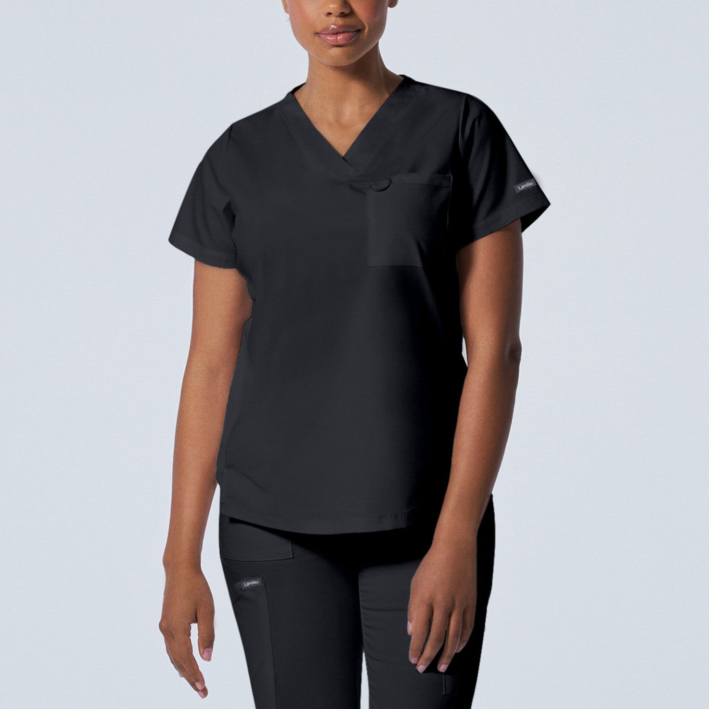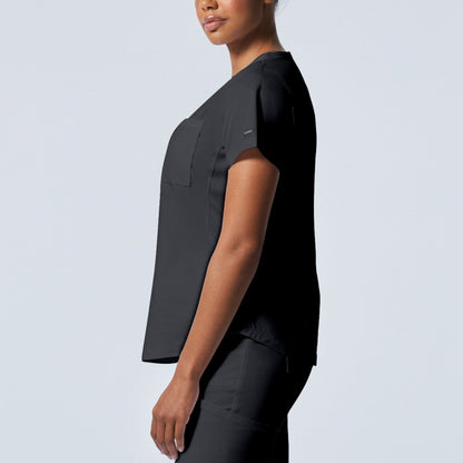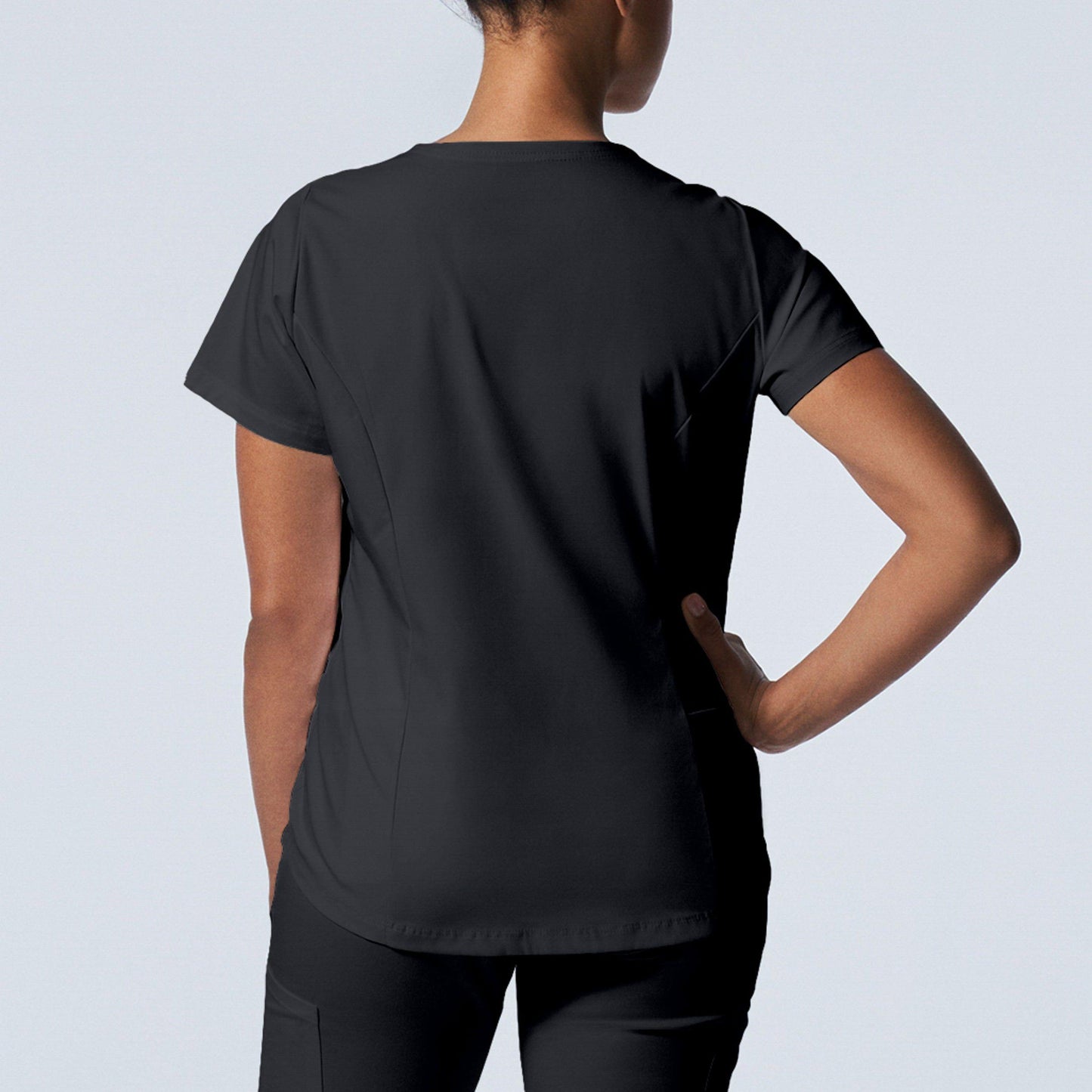 A Modern Fit, V-neck top with princess seams, and features rib knit side panels to provide comfort as you move through out your day. With a front chest pocket and a additional back side pocket to hold additional items, it can be worn untucked, half tucked, or fully tucked.
