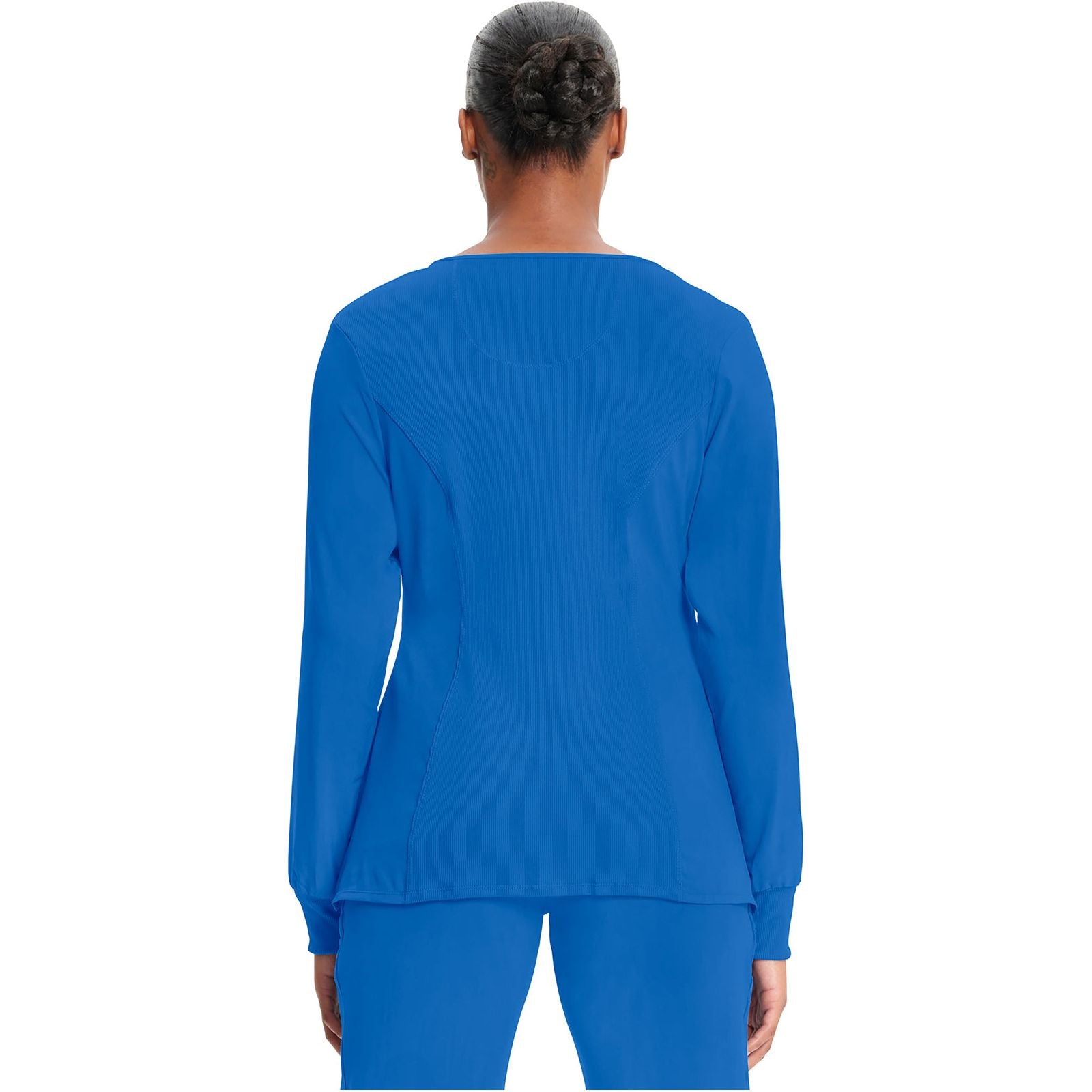 This Contemporary fit, long sleeve round neck top has front yoke seams and a bungee ID badge loop at the right shoulder. There is rib-knit at the center front neckline inset, center back panel, and sleeve cuffs. Other features include front and back princess seams with self-strapping along the front seams. There are a total of three pockets: two front patch pockets and one interior cellphone pocket on the right. Side vents complete the look. Center back length: 26"