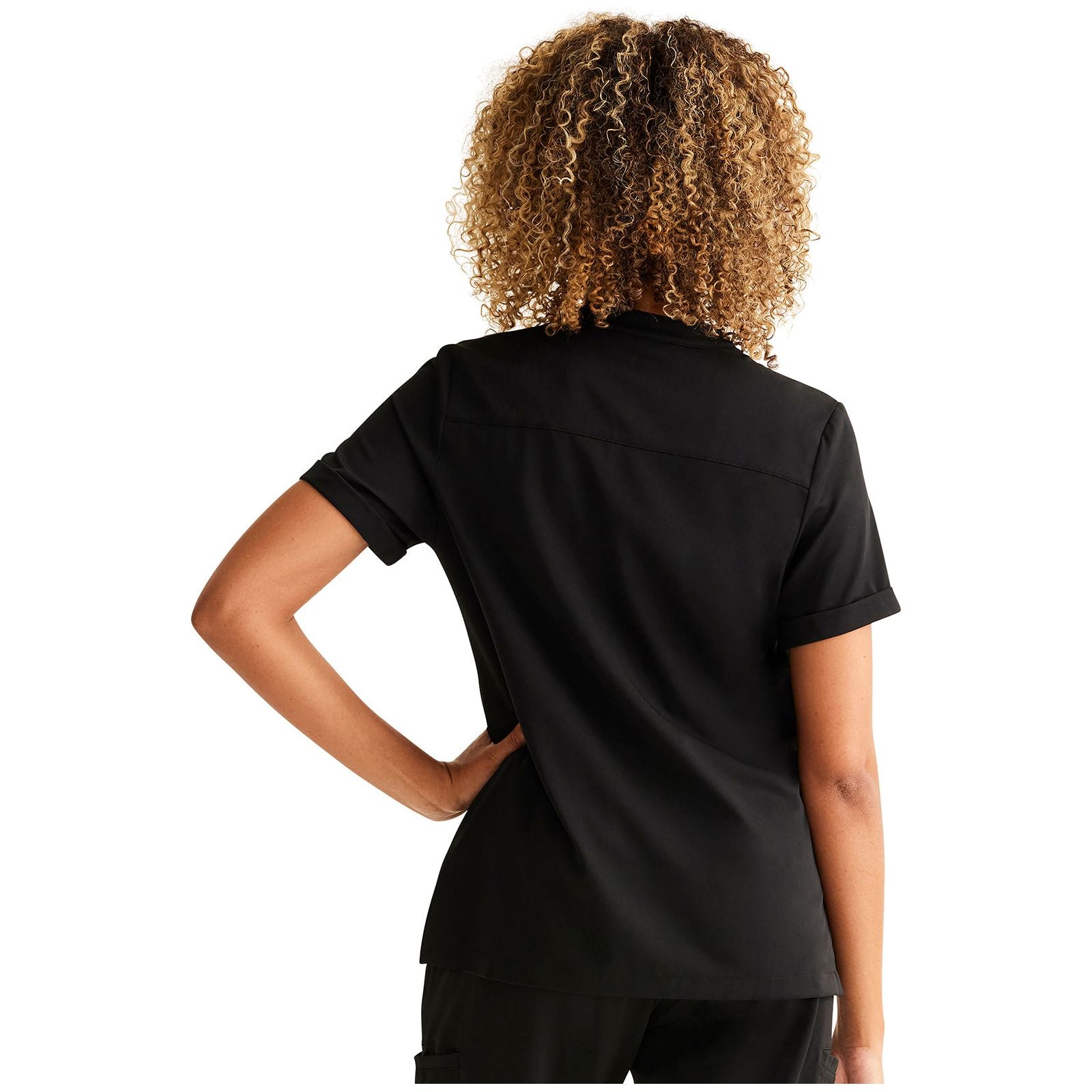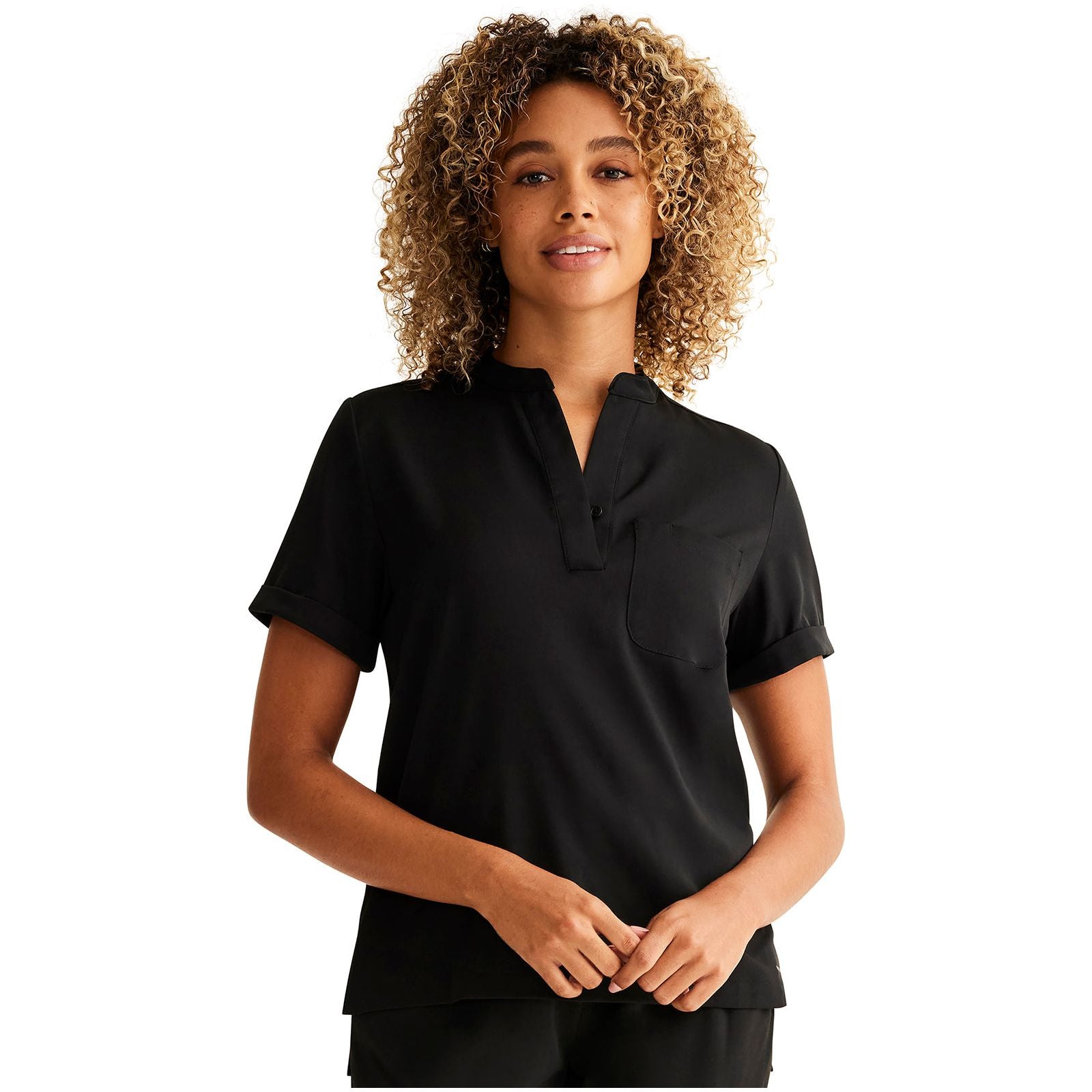 This Macy Top is crafted with the ideal blend of soft yet durable fabric. It features 1 chest pocket and a stylish Mandarin collar with a half placket. The high-low hem and side vents allow for ease of movement, while the French cuffs and Modern fit create a flattering silhouette. Center back length: 25".