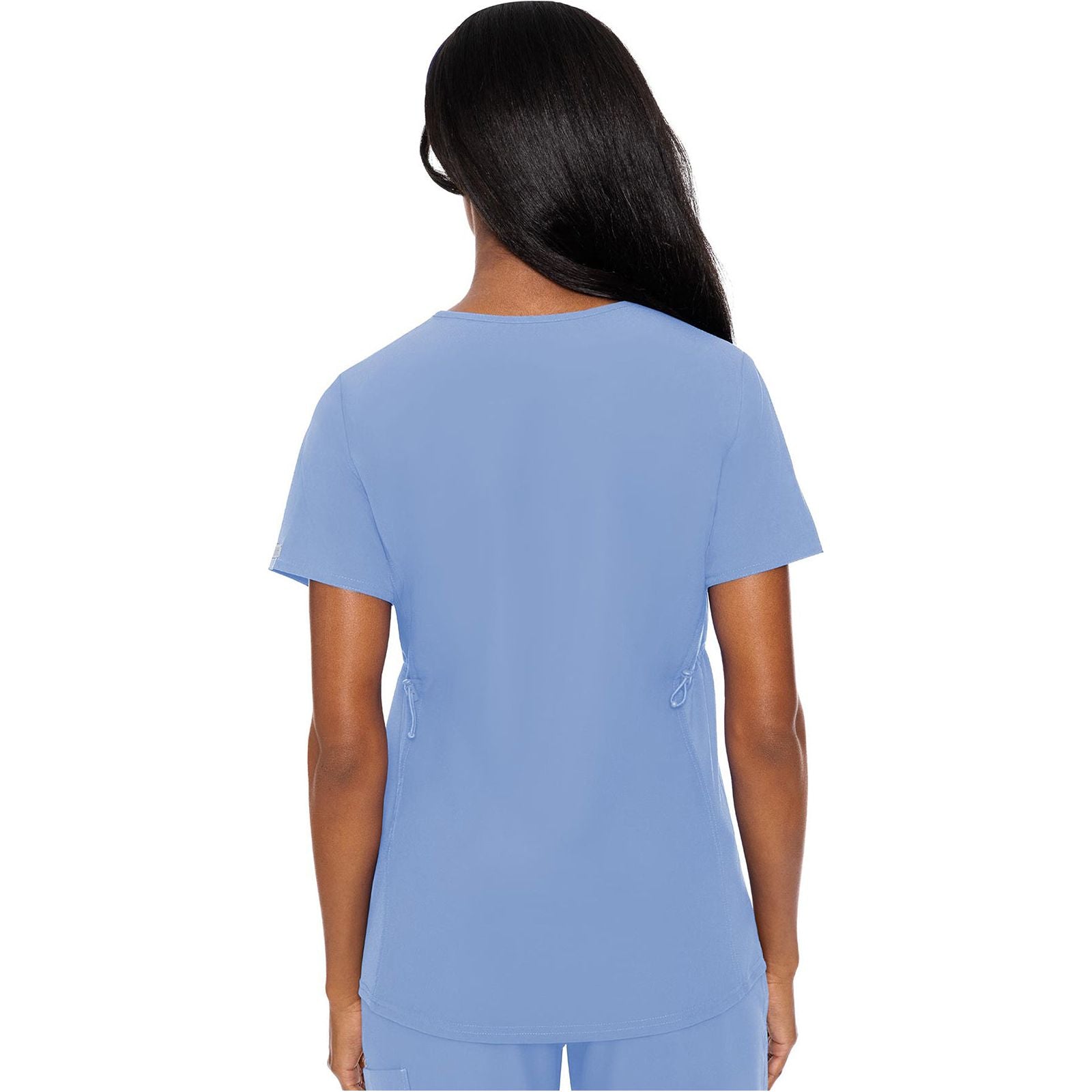 This Maternity fit v-neck top features two patch pockets for storage, comfortable and stretchy dyed-to-match jersey knit side panels, and a curved hem. The sides feature encased elastic with a toggle for adjustability. Center back length: 26"