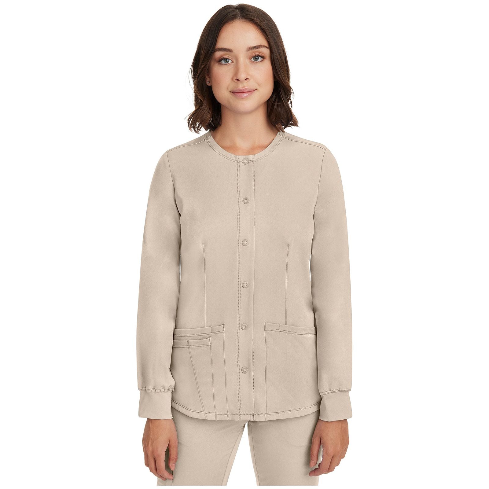 MEGAN JACKET-Round Neck Snap Button Front Jacket with 4 Pockets & 1 Media Pocket | The Megan Jacket features four pockets, including a mesh cell phone pocket, a scissor pocket, and dedicated space for your pen.