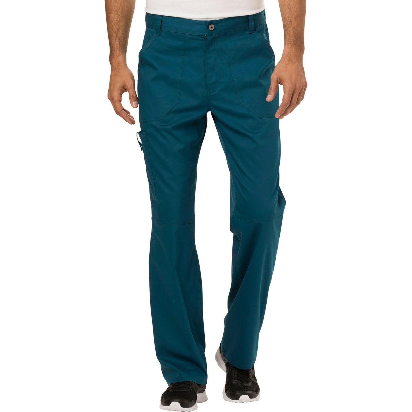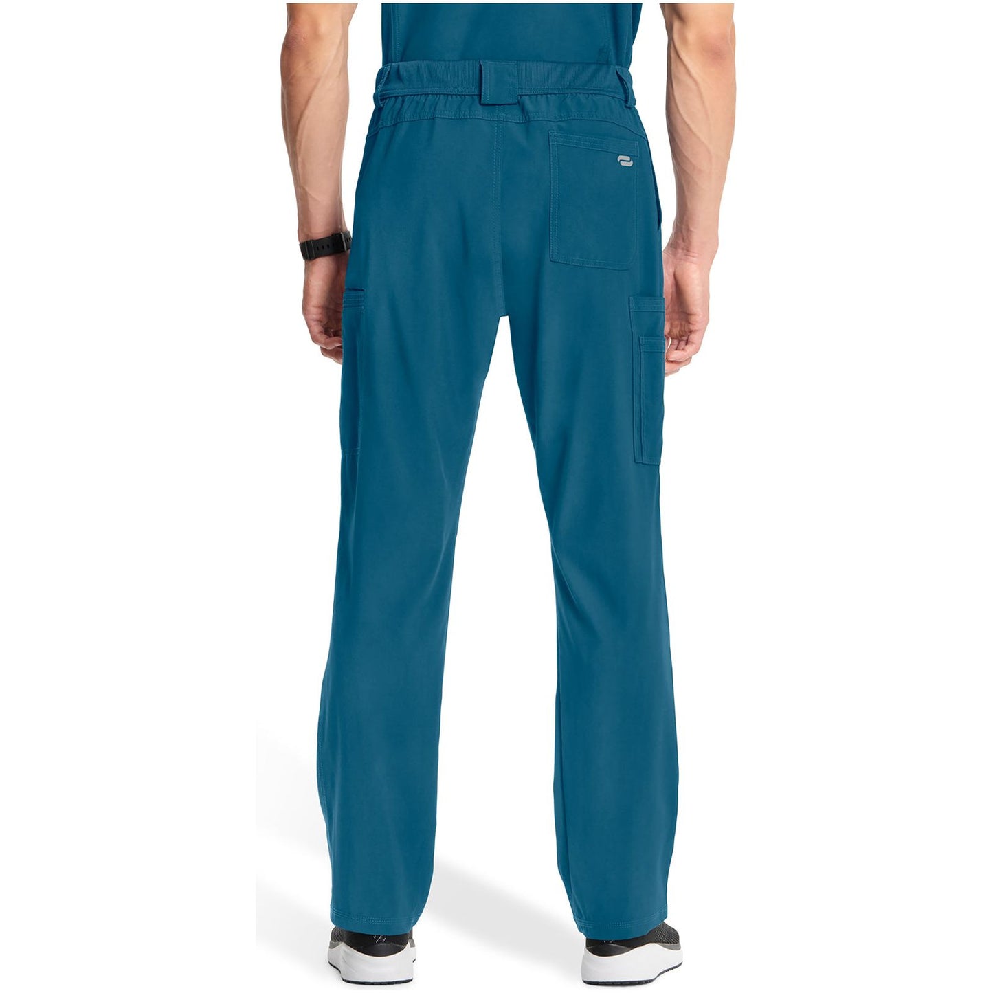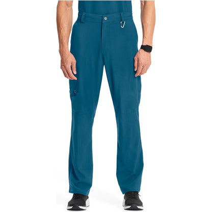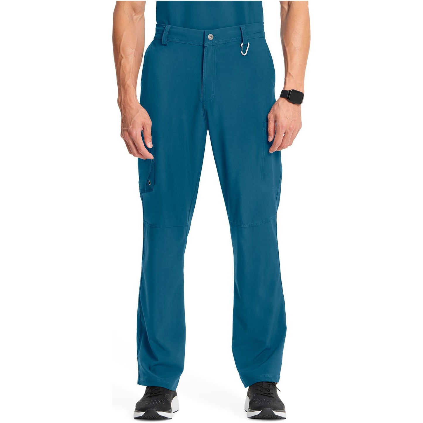 A Men's Modern fit tapered leg pant features an inside functional drawstring, back elastic waistband with rib-knit, five belt loops, a zip fly with button closure and a hidden inseam gusset for extra ease. Also featured are two front angled pockets, a right double cargo pocket with bungee loop and grommet, left welt cargo pocket, back patch pocket and knee seams. Inseam: 32"