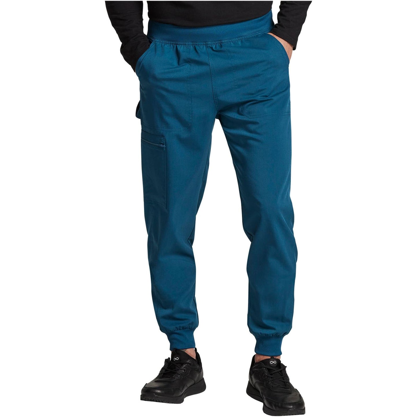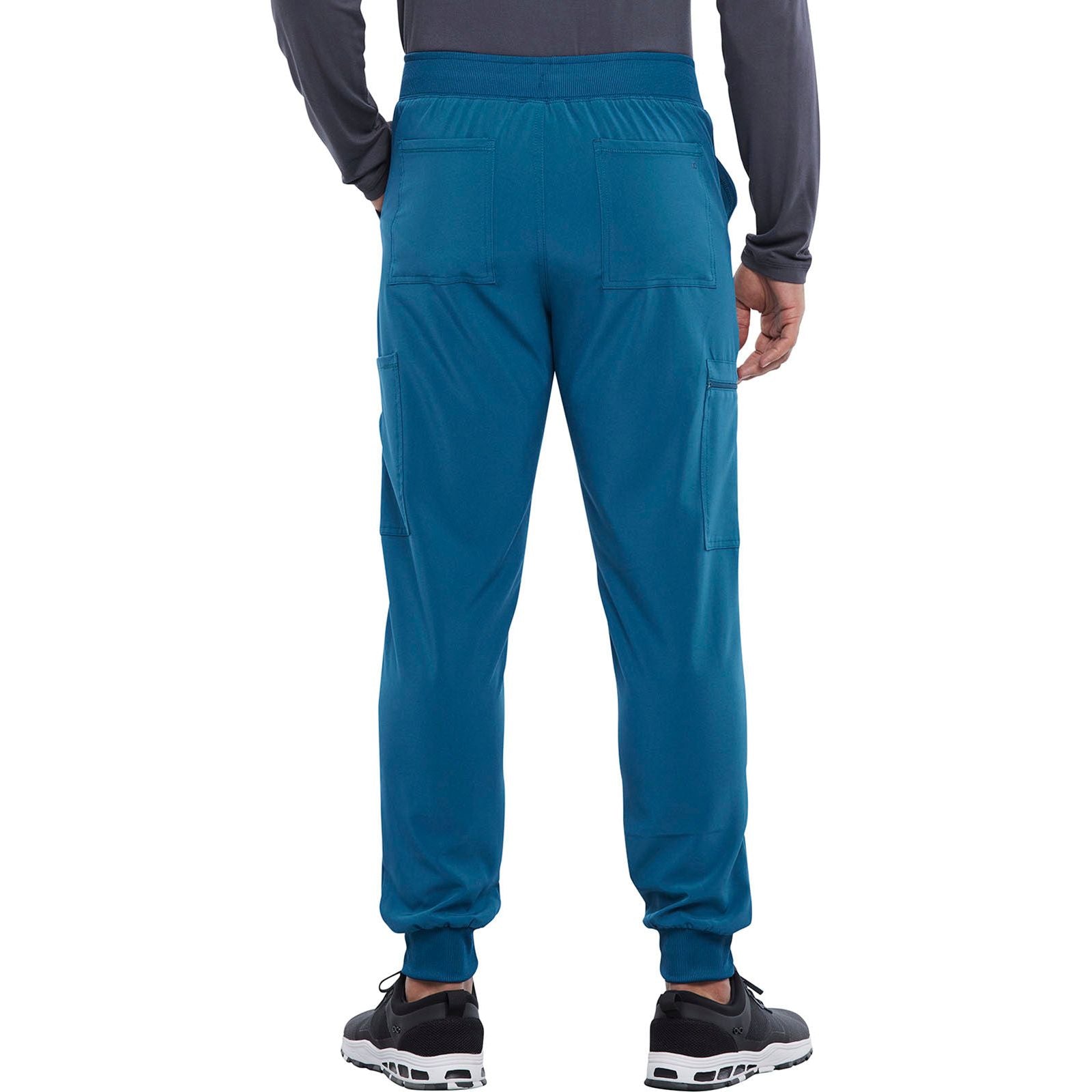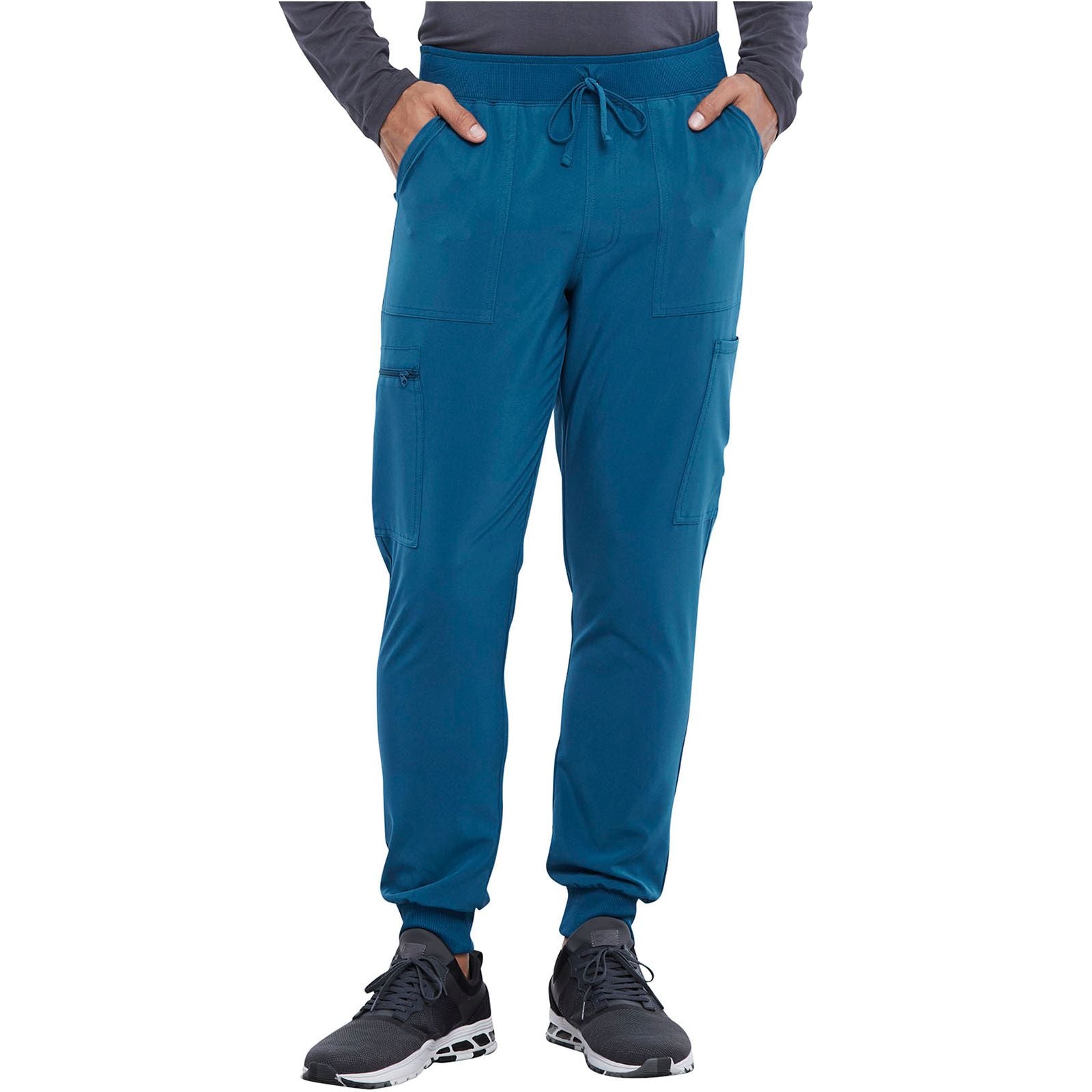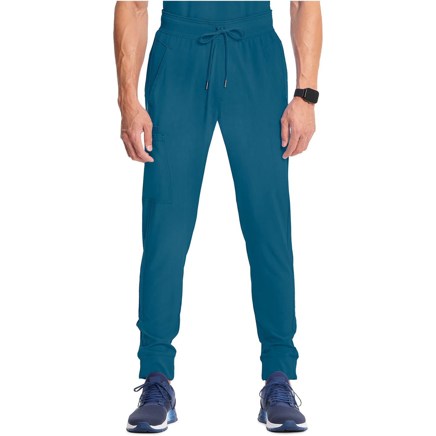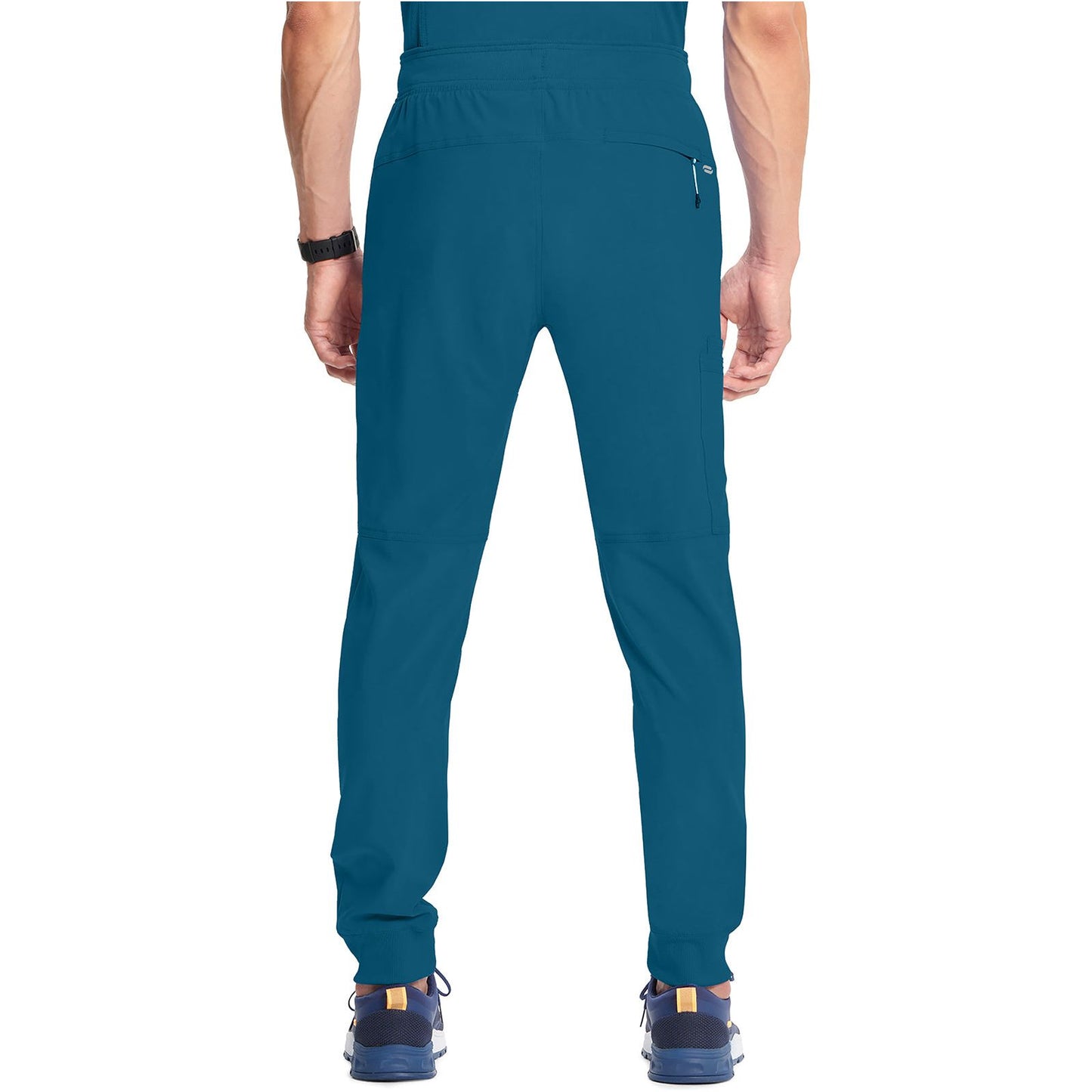 Stylish and super comfortable, this Men's Modern fit jogger features a mid rise, five pocket styling including three zip pockets to keep your items secure plus a cargo pocket with cell phone pocket, and rib knit cuff at back hem. As an added detail, the waistband offers a fun pop of color inside while remaining soft and comfortable on the skin. These joggers are a great piece that can transition from work to everyday life. Leg opening: 10 1/2". Inseam: 31". The comfortable stretch poplin fabric and super stretchy rib knit is the perfect combo for healthcare professionals.