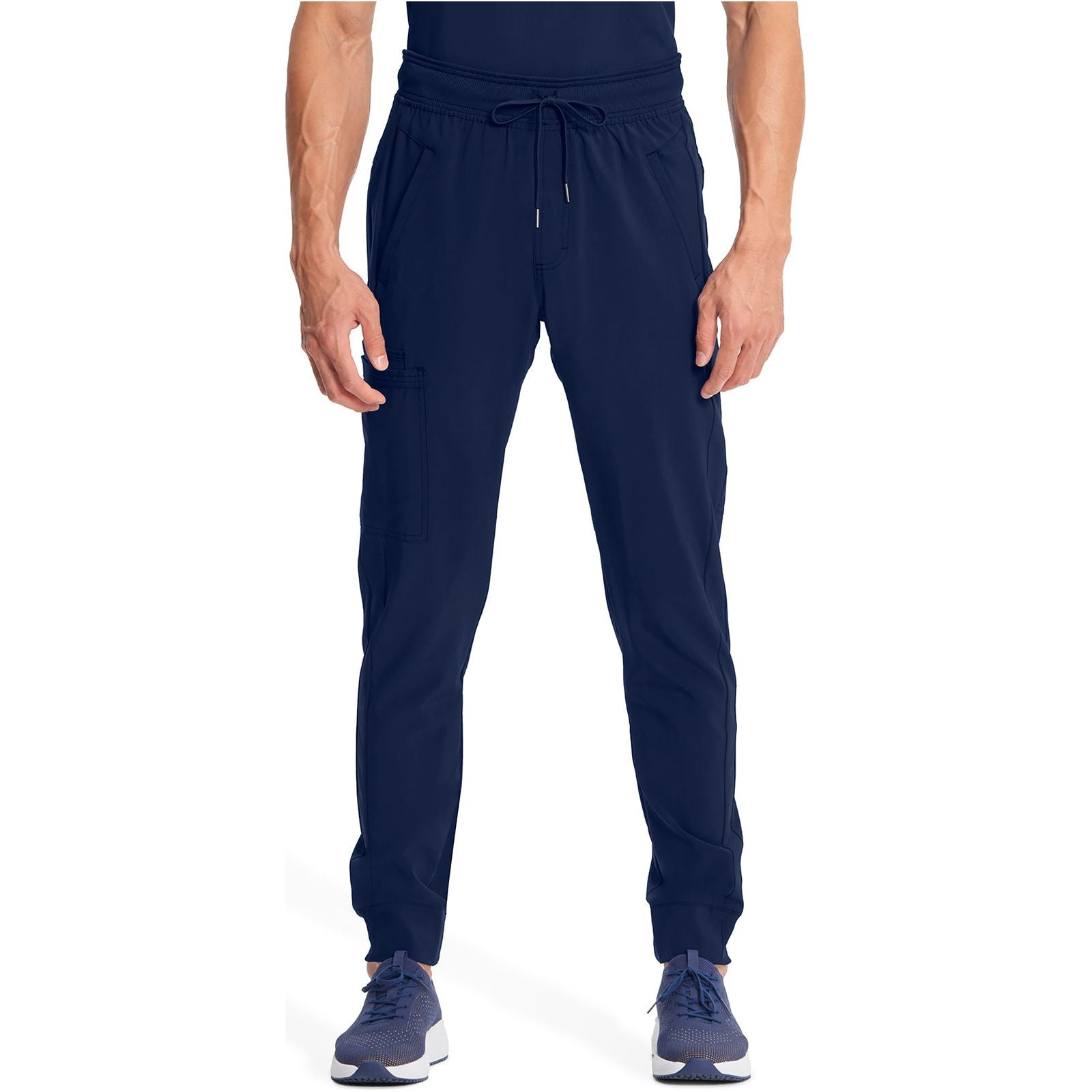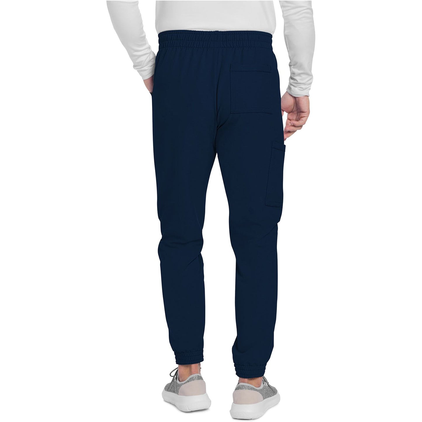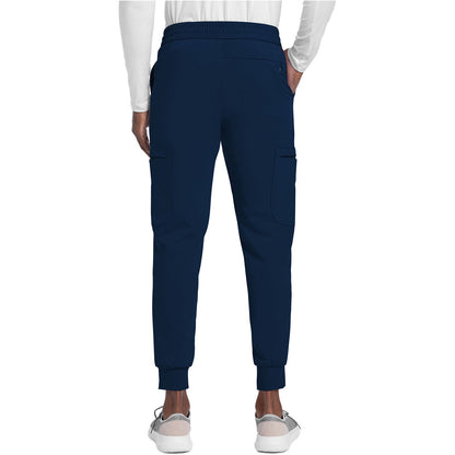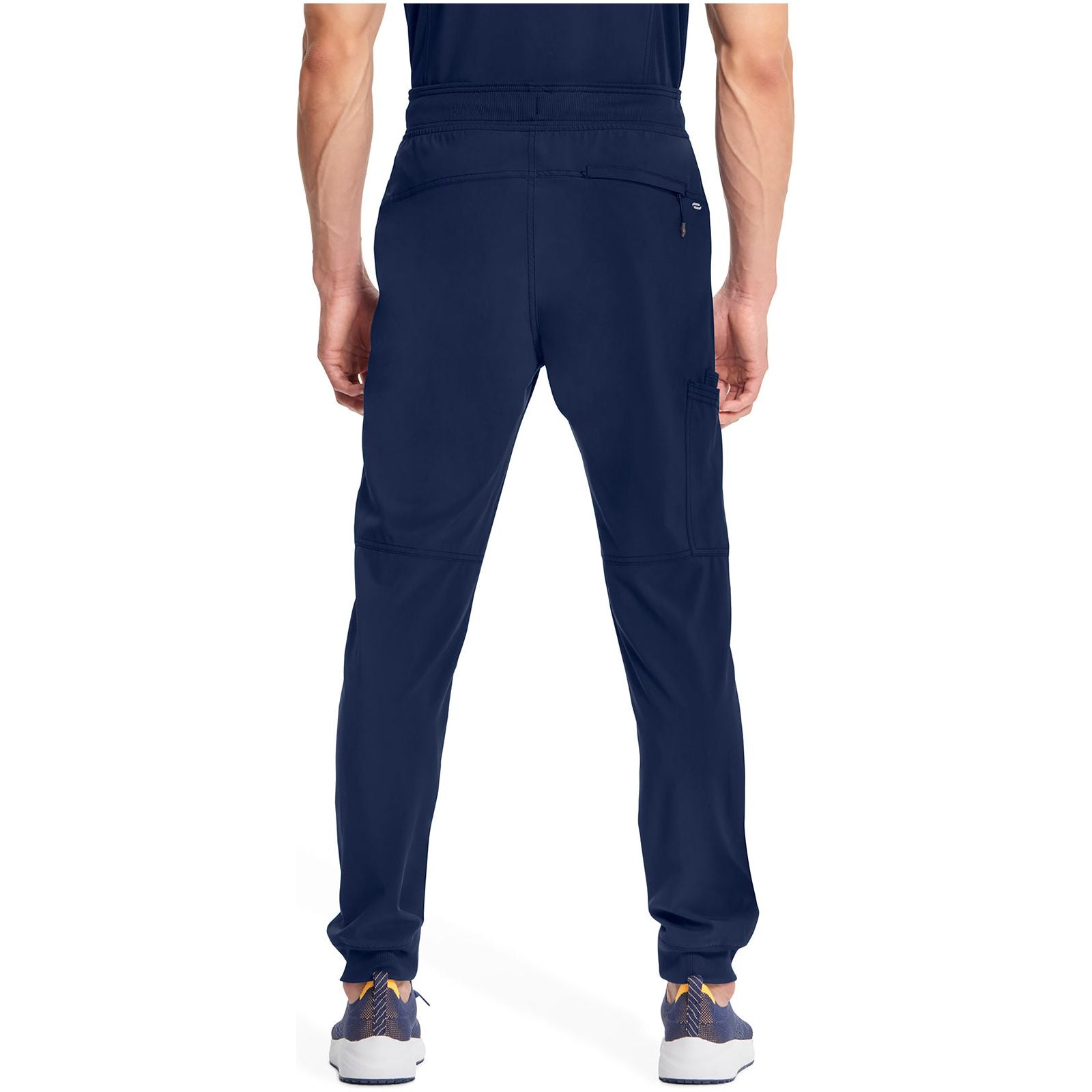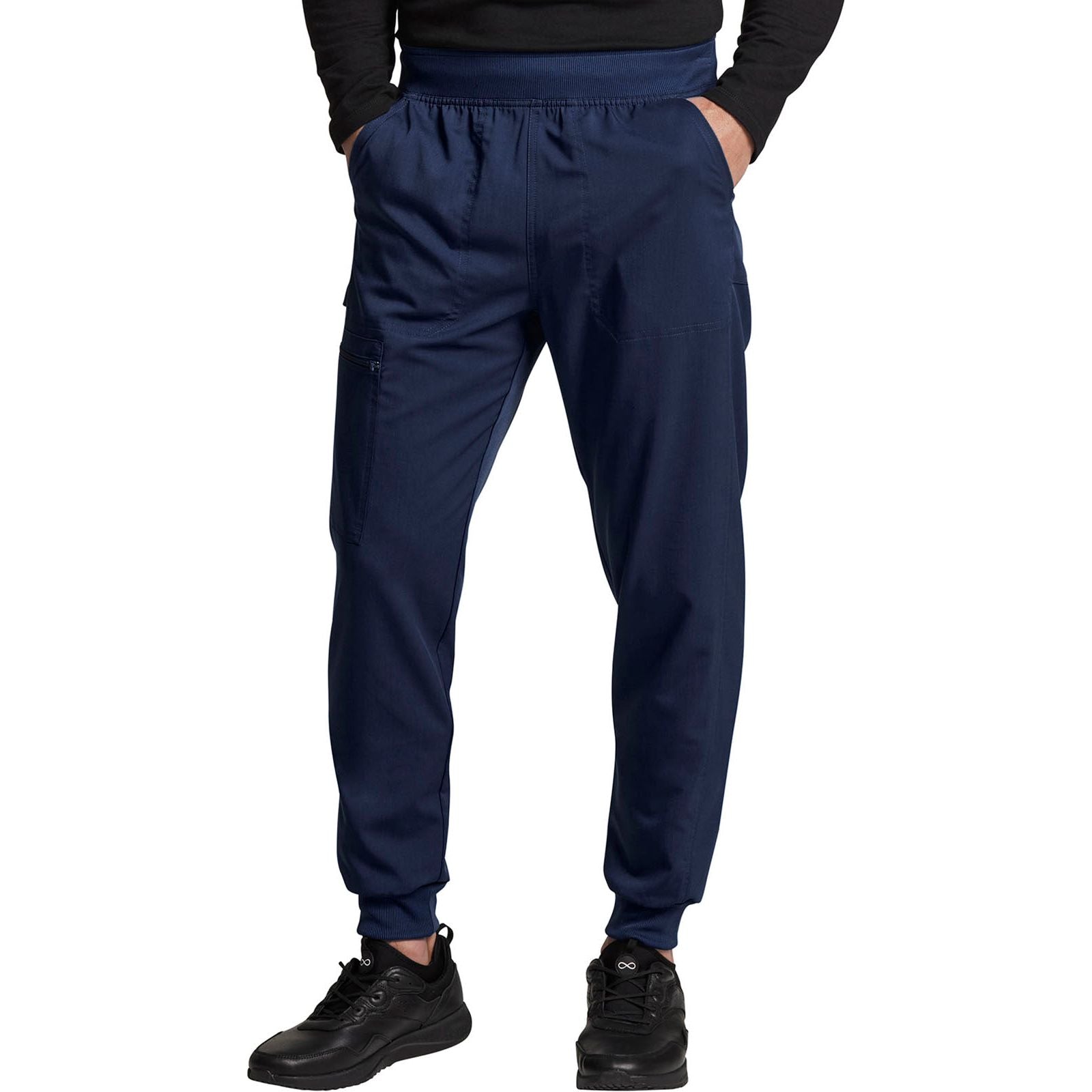 Stylish and super comfortable, this Men's Modern fit jogger features a mid rise, five pocket styling including three zip pockets to keep your items secure plus a cargo pocket with cell phone pocket, and rib knit cuff at back hem. As an added detail, the waistband offers a fun pop of color inside while remaining soft and comfortable on the skin. These joggers are a great piece that can transition from work to everyday life. Leg opening: 10 1/2". Inseam: 31". The comfortable stretch poplin fabric and super stretchy rib knit is the perfect combo for healthcare professionals.