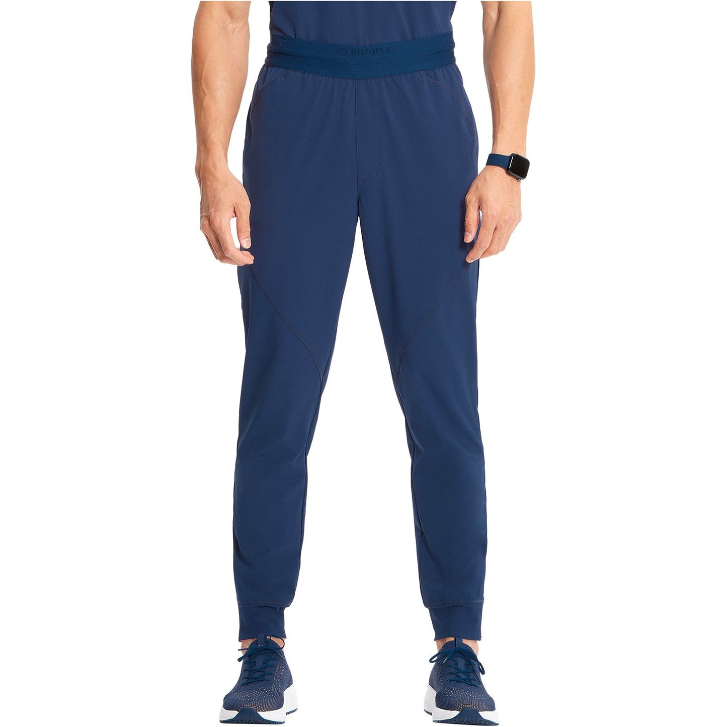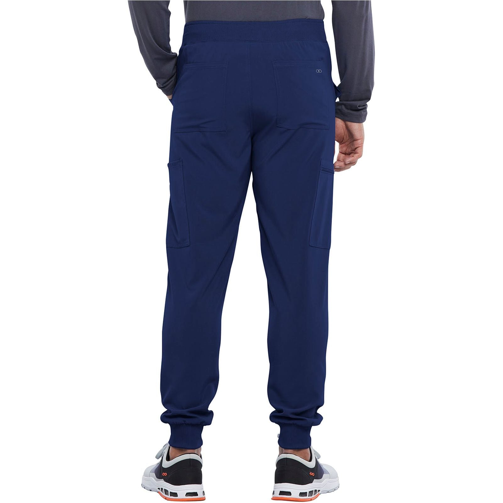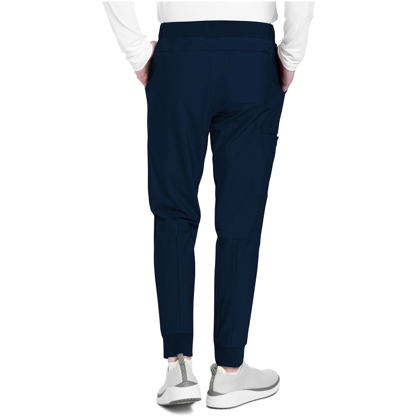 Stylish and super comfortable, this Men's Modern fit jogger features a mid rise, five pocket styling including three zip pockets to keep your items secure plus a cargo pocket with cell phone pocket, and rib knit cuff at back hem. As an added detail, the waistband offers a fun pop of color inside while remaining soft and comfortable on the skin. These joggers are a great piece that can transition from work to everyday life. Leg opening: 10 1/2". Inseam: 31". The comfortable stretch poplin fabric and super stretchy rib knit is the perfect combo for healthcare professionals.