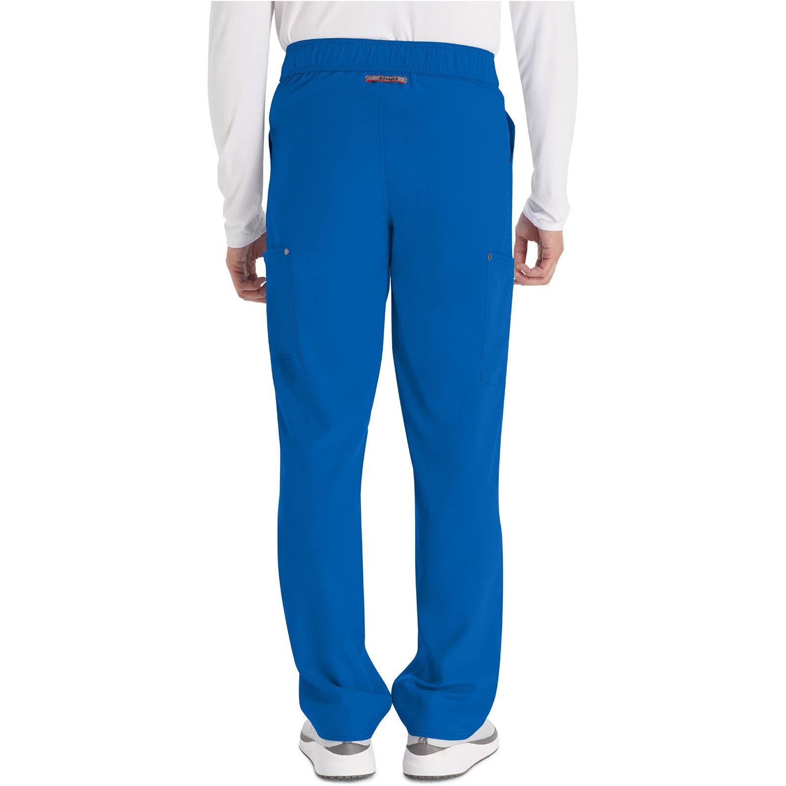 A true Men's fit pant with zipper fly, this style offers lots of pockets and functional styling. The mid rise elastic-reinforced waistband includes a drawstring for adjustability. There are six pockets for organized storage: two side entry patch pockets, two cargo pockets with pen/instrument slots, and two back patch pockets. The cargo pockets and back pockets have reverse hem trim for added detailing. Forward leg seams provide leg-lengthening style. Decorative tonal topstitching finishes this style. Straight leg, 19" opening. Inseam: 32"