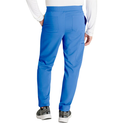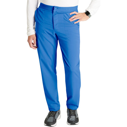 This Men's fit mid-rise pant has a zip fly with a button closure at the waist plus an interior elastic and drawstring waistband. There are five pockets: two front angled pockets, one front-entry cargo pocket, and two back patch pockets. Tapered leg, 14" opening. Inseam: 32"
