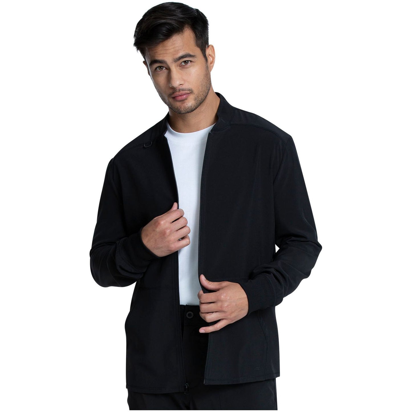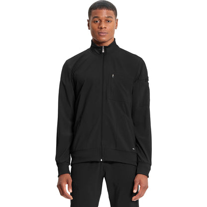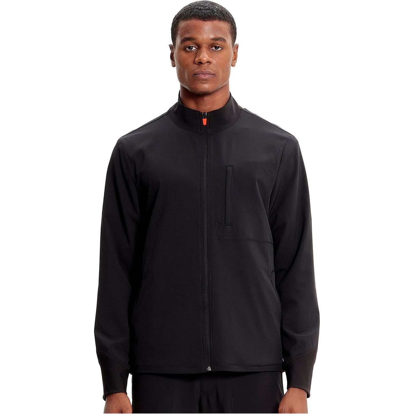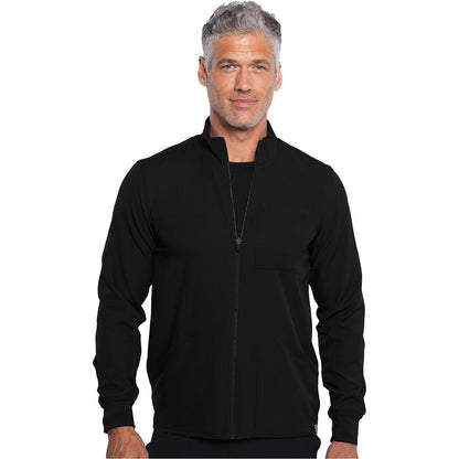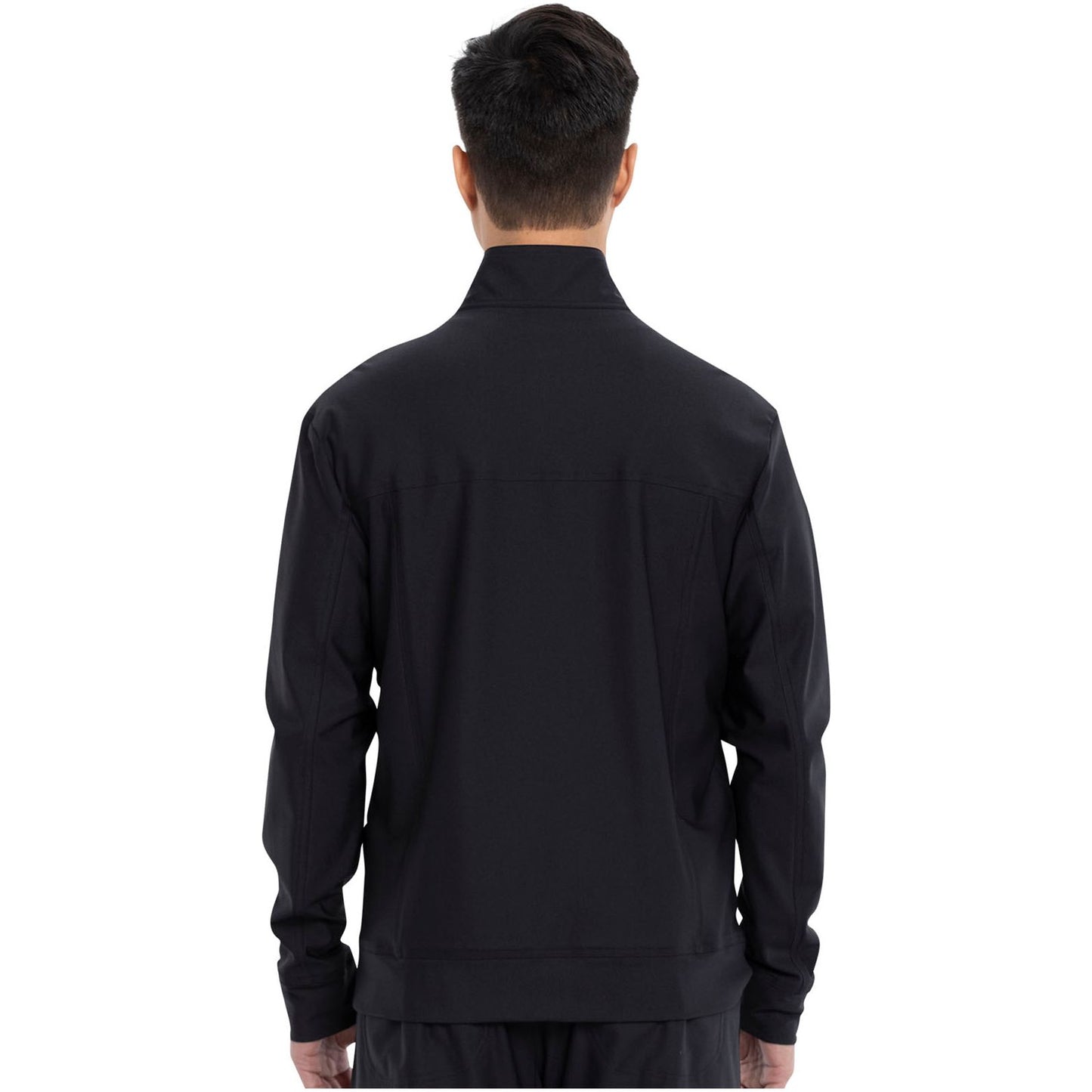 A Men's Modern fit zip front jacket features back side panels, collar, cuffs and waistband made with a stretch rib knit for extra comfort. Also featured are a logo zipper pull, front chest pocket with security zip closure, patch pockets, and an instrument loop and sectional pocket on the left sleeve. Center back length: 28" . The comfortable stretch poplin fabric and super stretchy rib knit is the perfect combo for healthcare professionals.