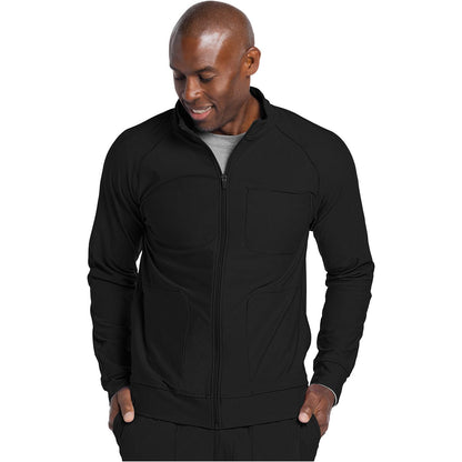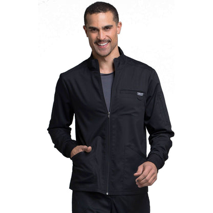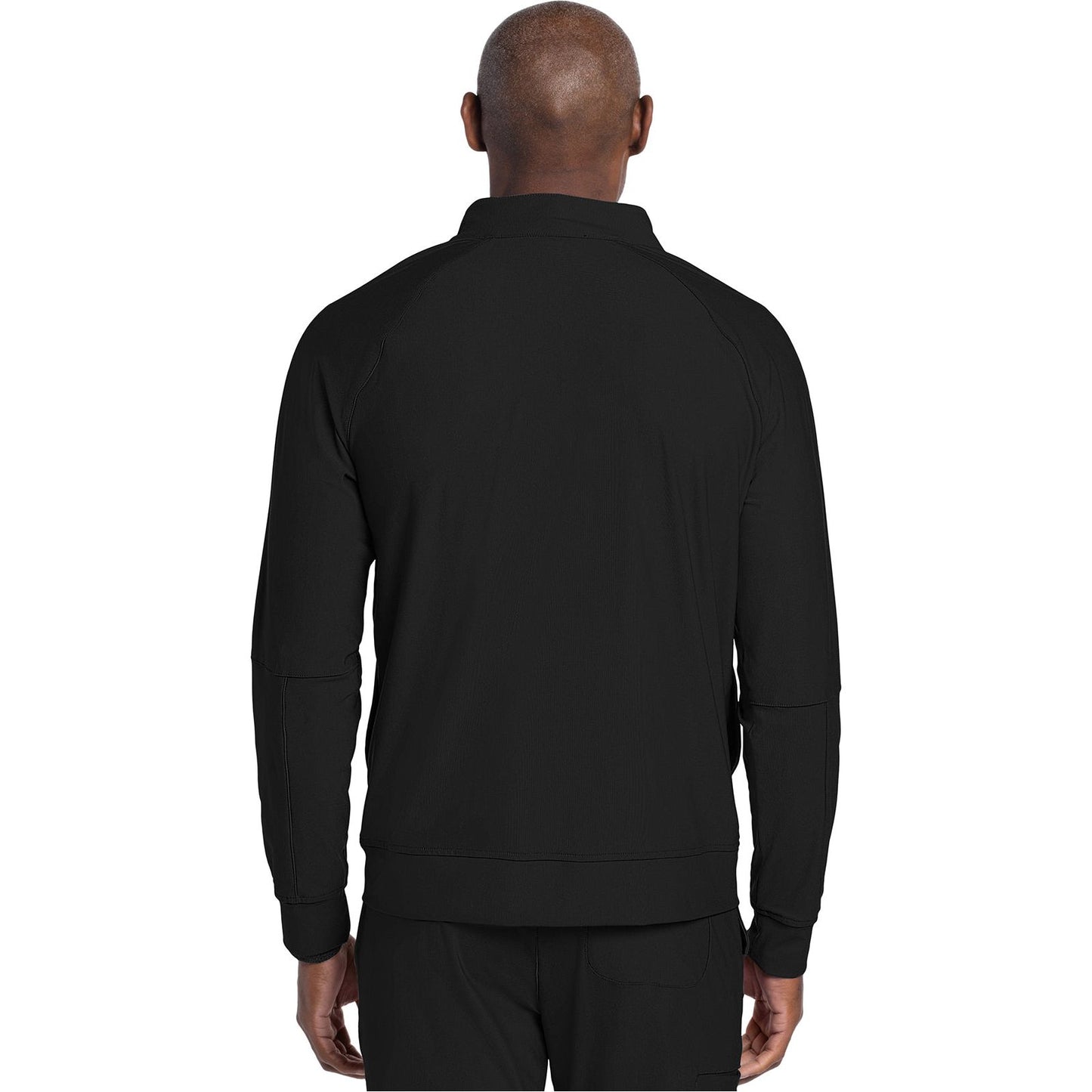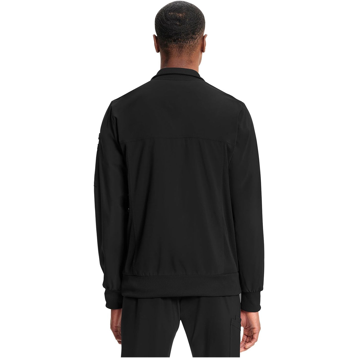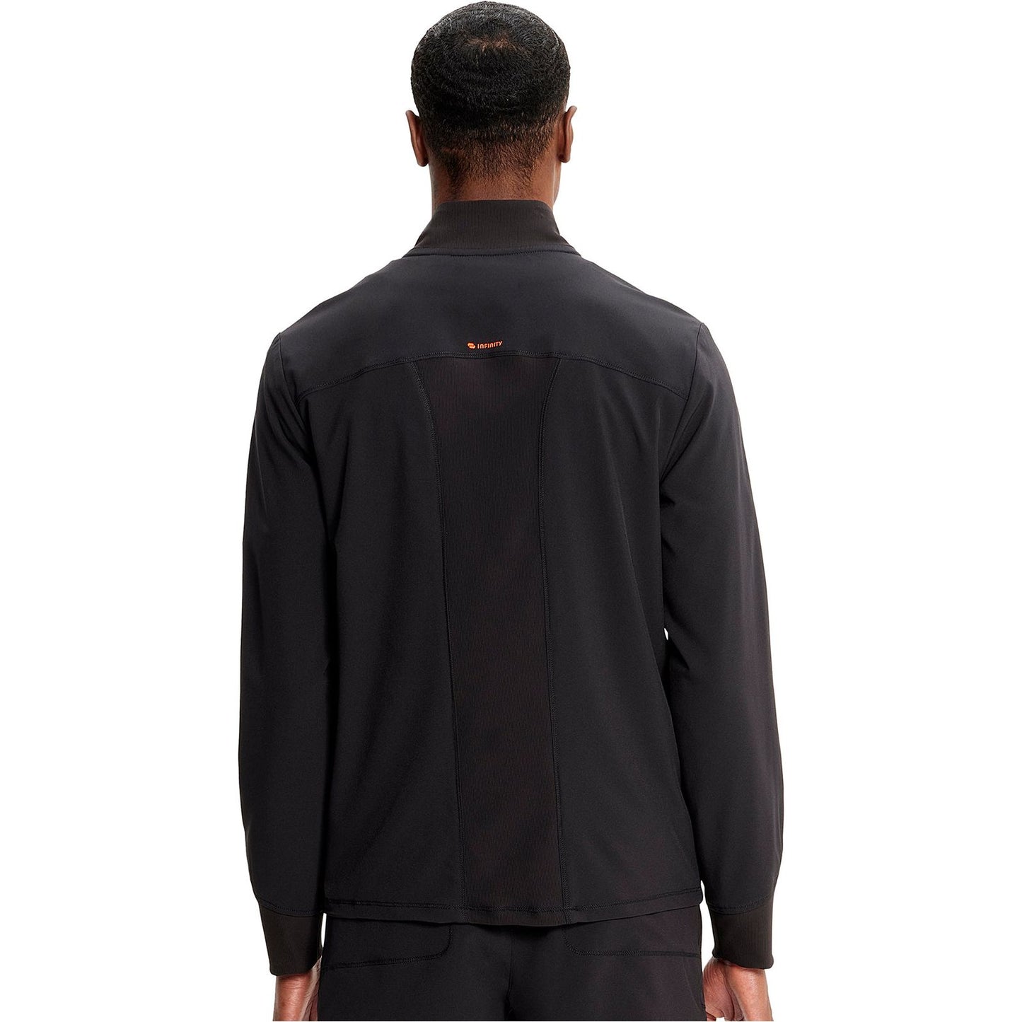 A Men's Modern fit zip front jacket features back side panels, collar, cuffs and waistband made with a stretch rib knit for extra comfort. Also featured are a logo zipper pull, front chest pocket with security zip closure, patch pockets, and an instrument loop and sectional pocket on the left sleeve. Center back length: 28" . The comfortable stretch poplin fabric and super stretchy rib knit is the perfect combo for healthcare professionals.