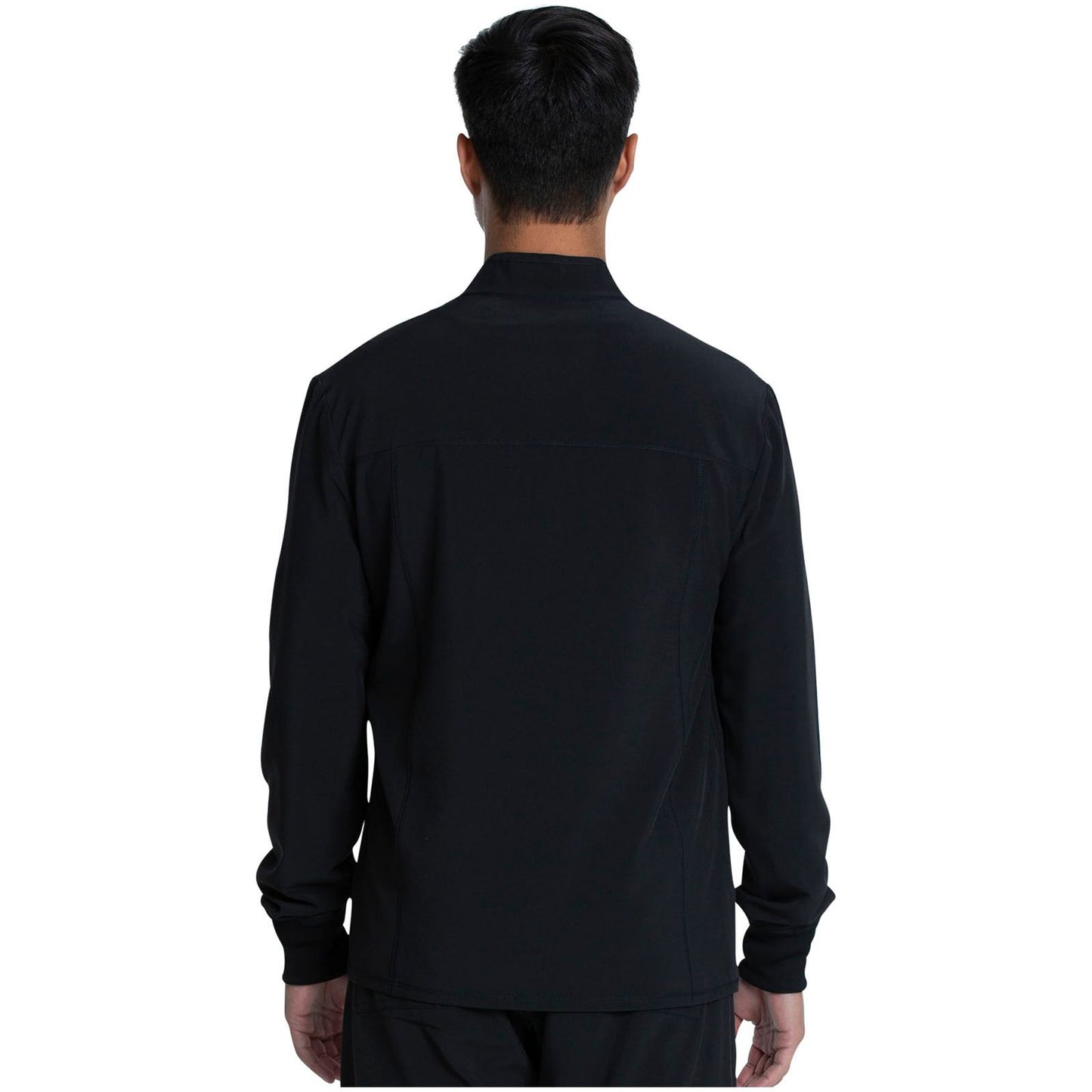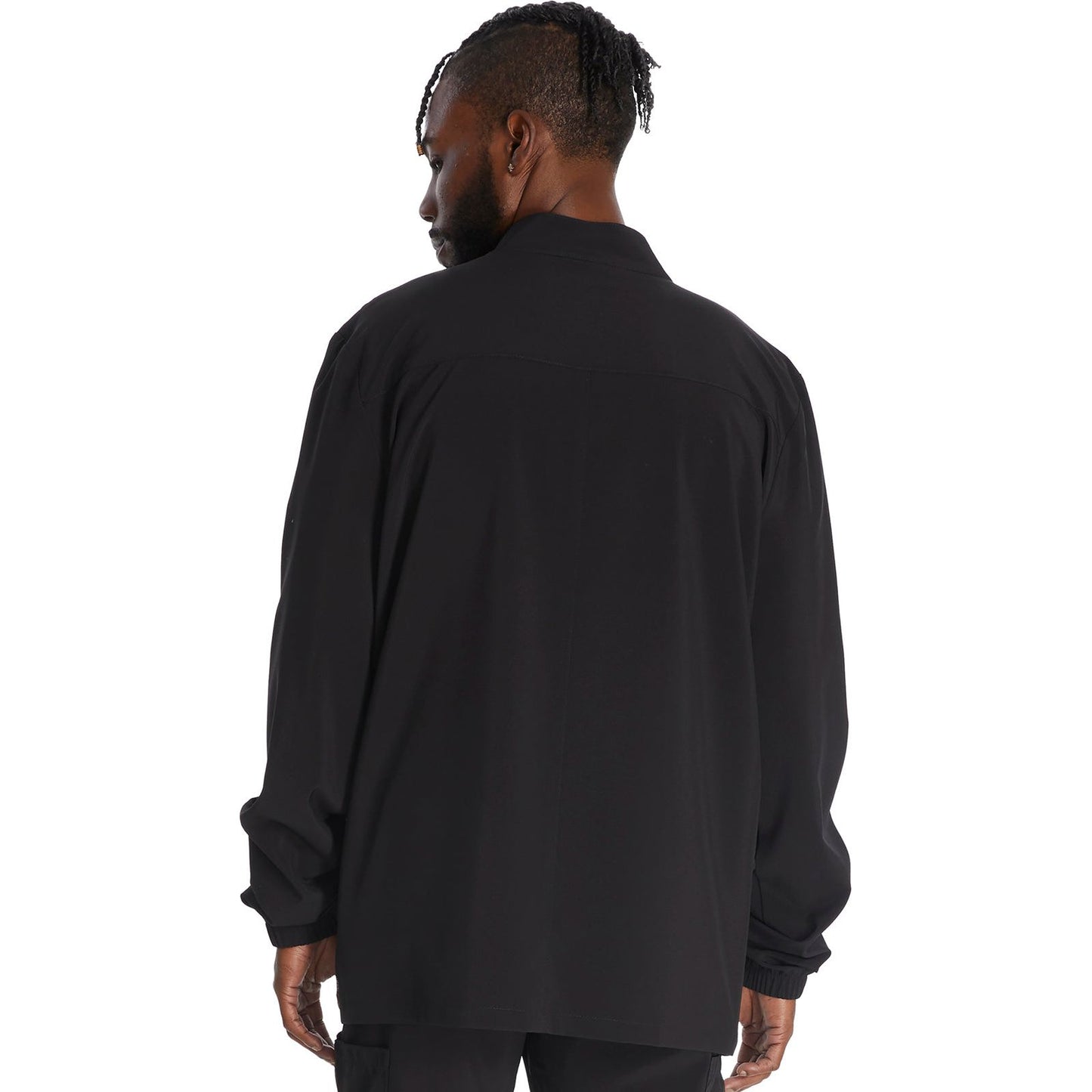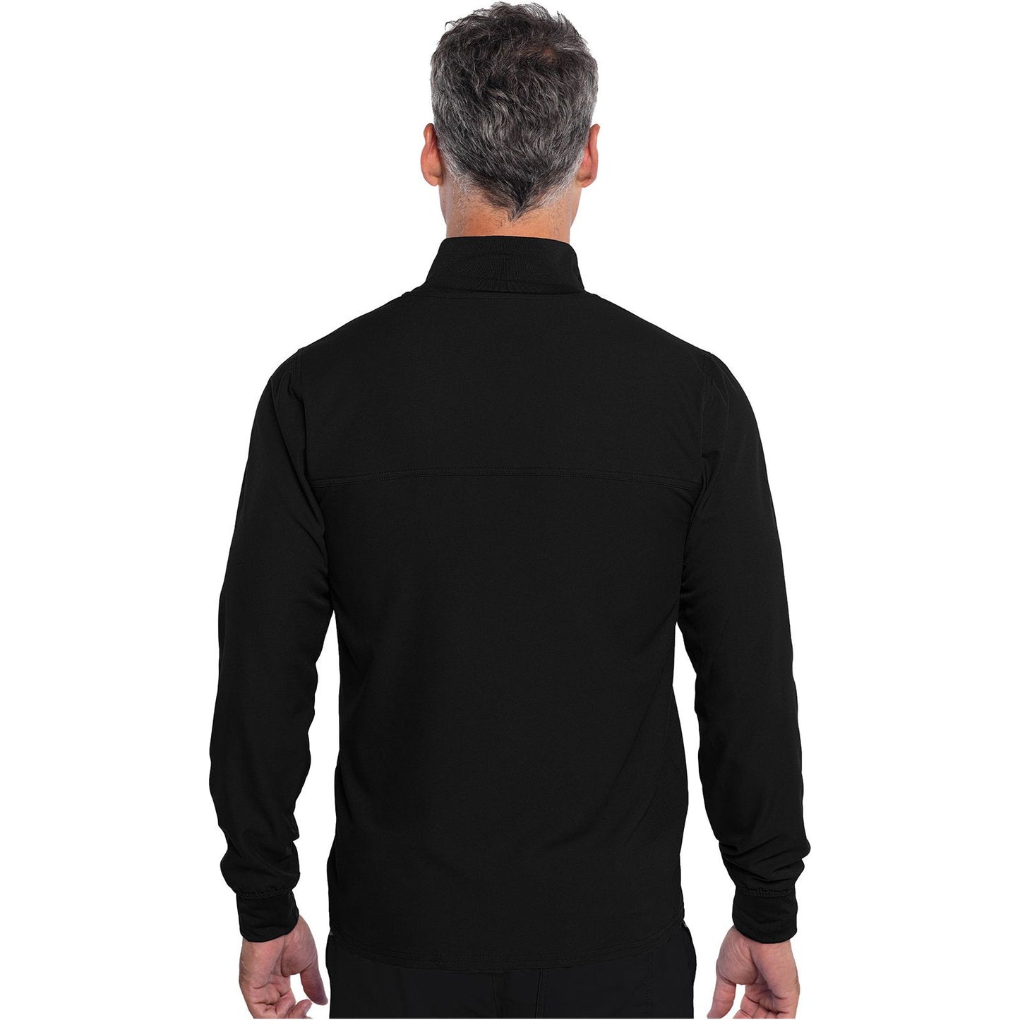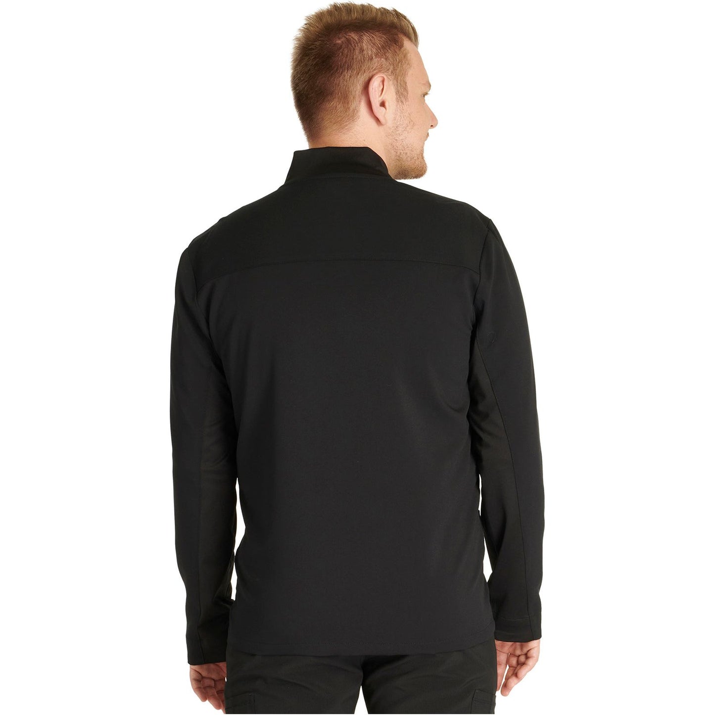 A Men's Modern fit zip front jacket features back side panels, collar, cuffs and waistband made with a stretch rib knit for extra comfort. Also featured are a logo zipper pull, front chest pocket with security zip closure, patch pockets, and an instrument loop and sectional pocket on the left sleeve. Center back length: 28" . The comfortable stretch poplin fabric and super stretchy rib knit is the perfect combo for healthcare professionals.