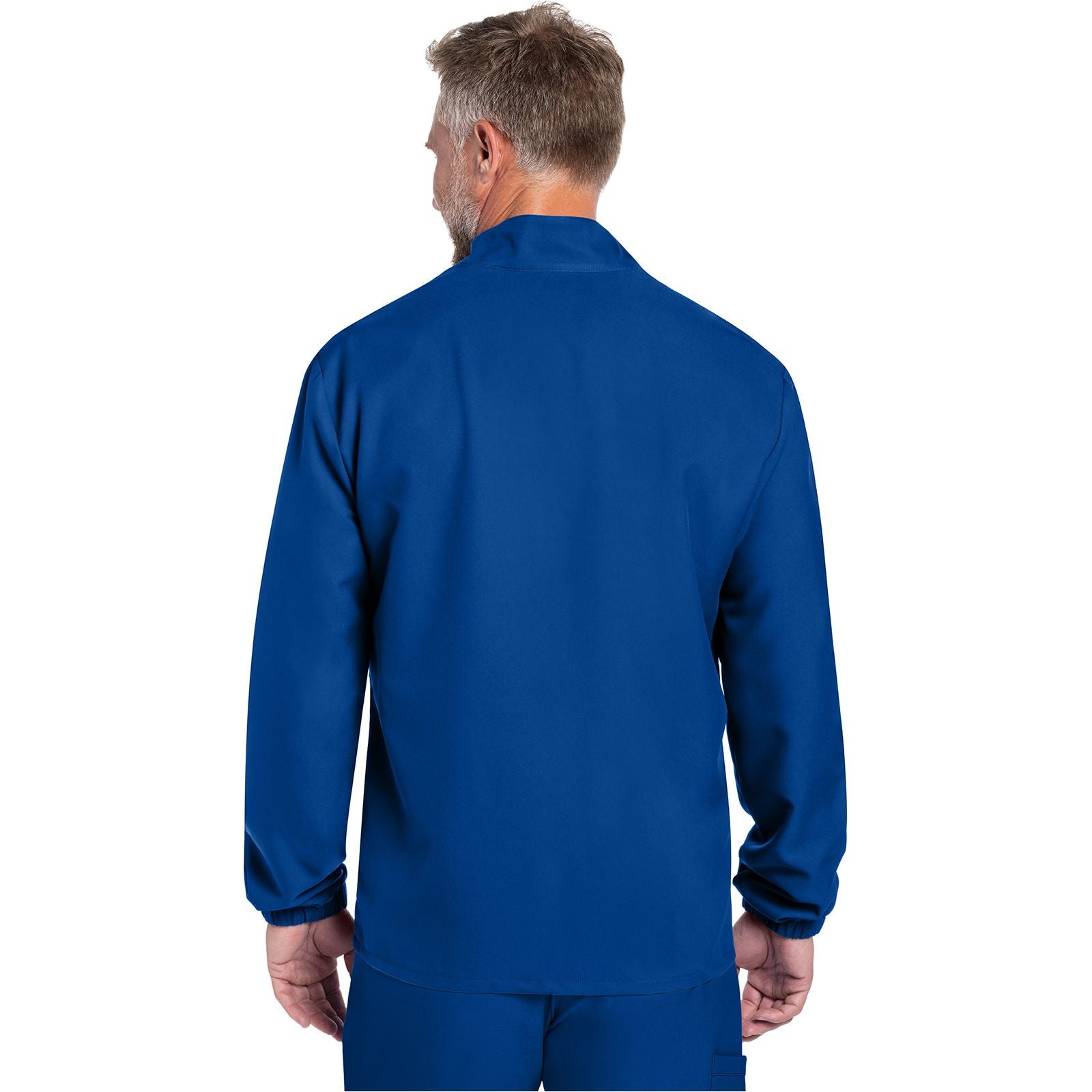 Work-to-weekend approved, this Men's zip front jacket has a stand-up collar and high-low hem. The shoulder panels include tonal triple needle stitching and a flat bungee for an ID badge on the wearer's right shoulder. There are two roomy side entry patch pockets for storage. Elasticized sleeve hems. Decorative tonal topstitching finishes this scrub jacket. Men's fit. Center back length: 28 1/2"