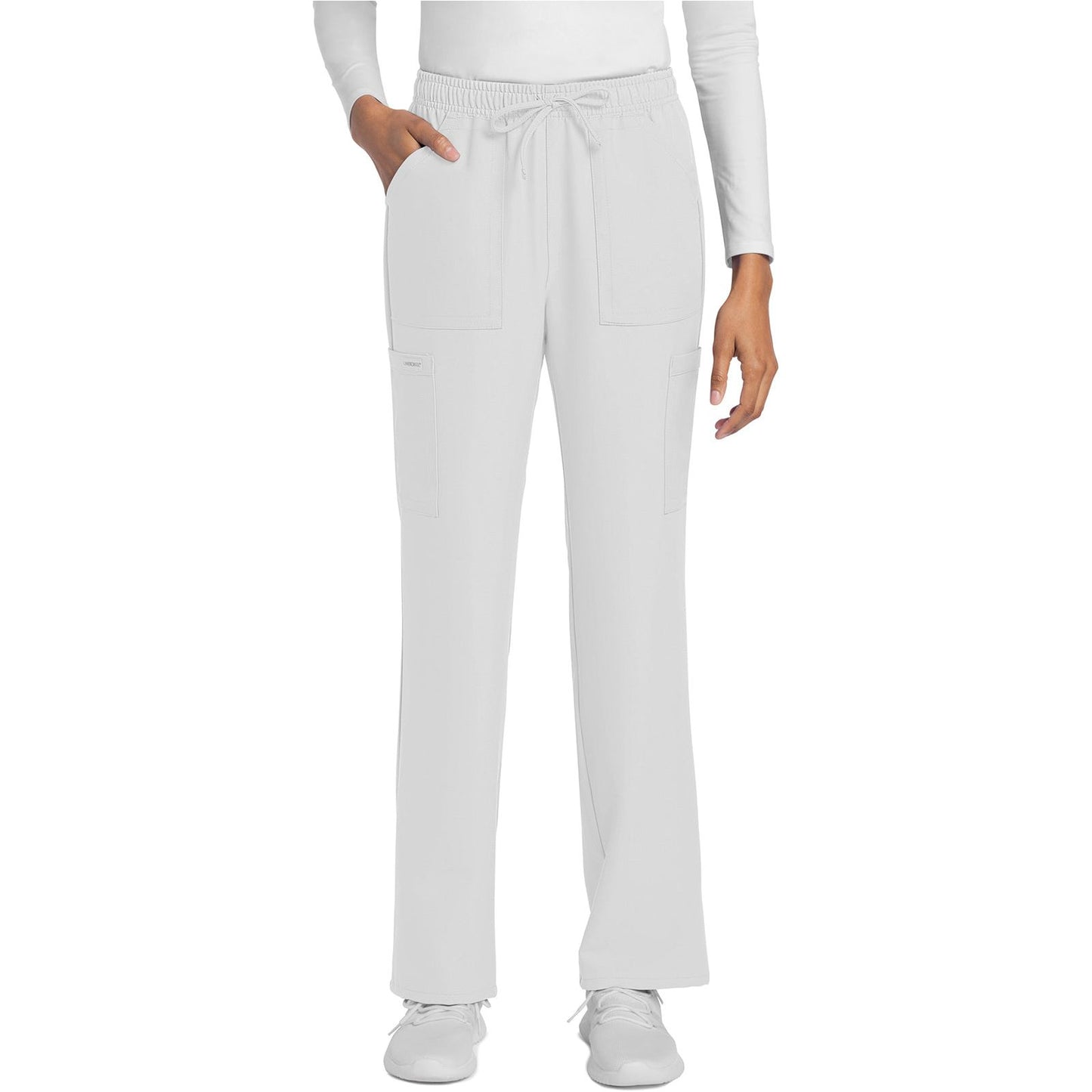 This Modern Classic fit trouser pant has a mid rise elasticized waist with drawstring. There are a total of four pockets for storage: two front patch pockets and two cargo pockets with reverse hem trim. Decorative tonal topstitching and elasticized hems finish this style. Straight leg, 18 1/2" opening. Inseam: 31"