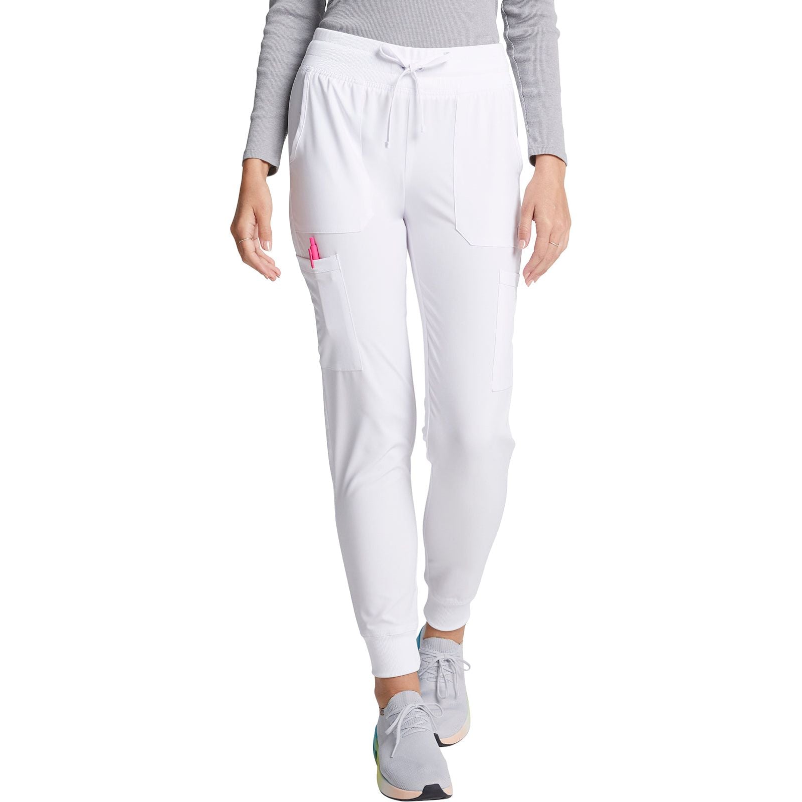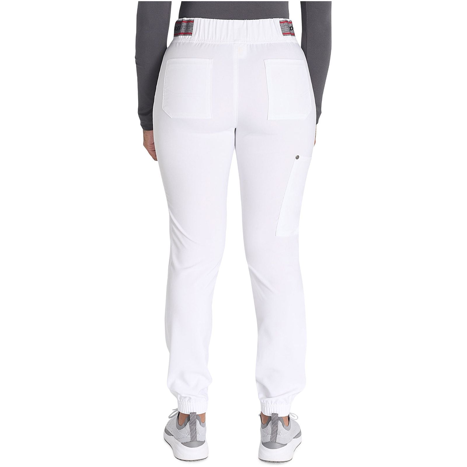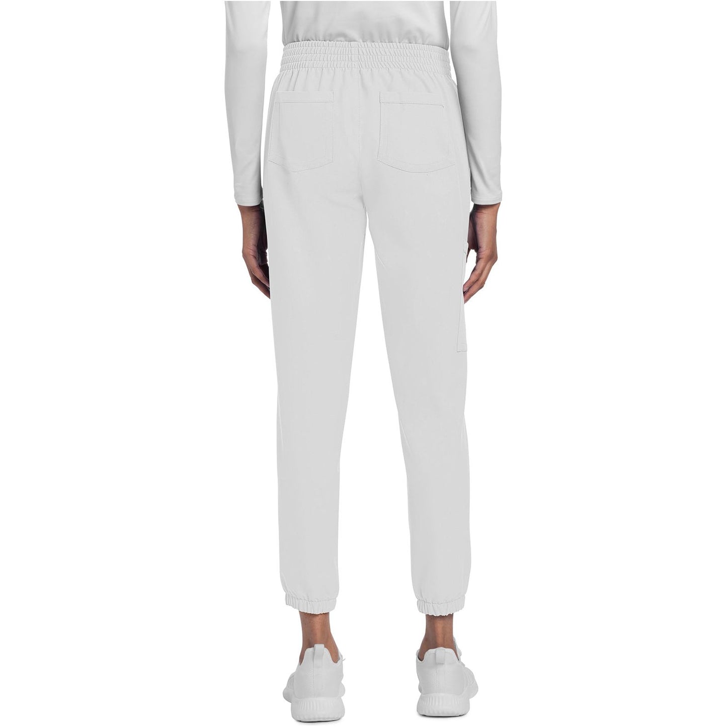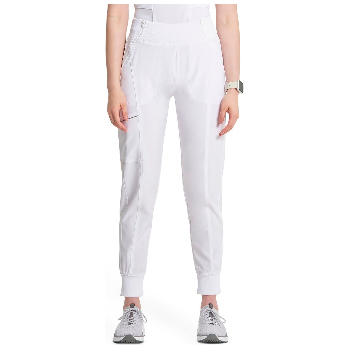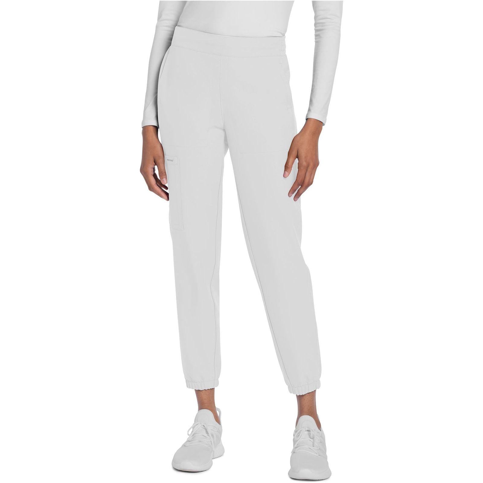 A Contemporary fit, mid rise, jogger features a rib knit elastic waistband with front angled zipper pockets, a cargo pocket with reflective tape, two back patch pockets, rib knit leg bands for adjustable length and coverstitch detail throughout. Inseam: 28 1/2". The comfortable stretch poplin fabric and super stretchy rib knit is the perfect combo for healthcare professionals.
