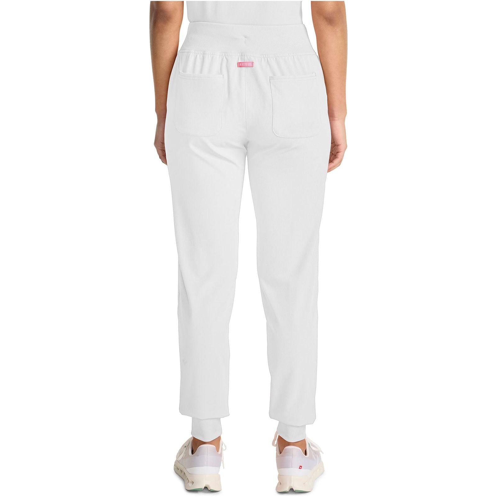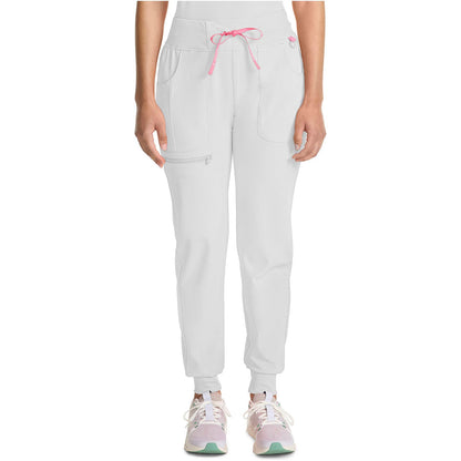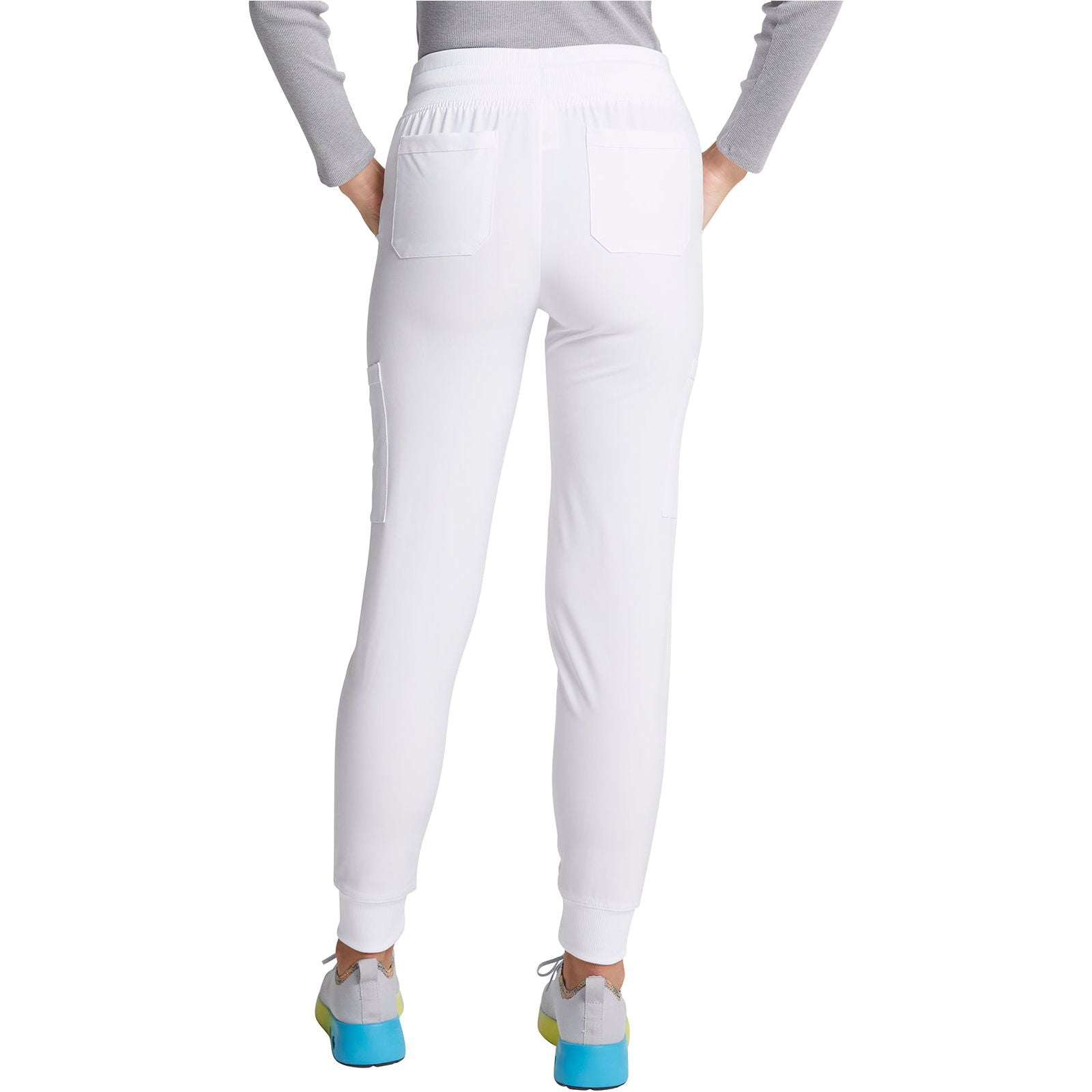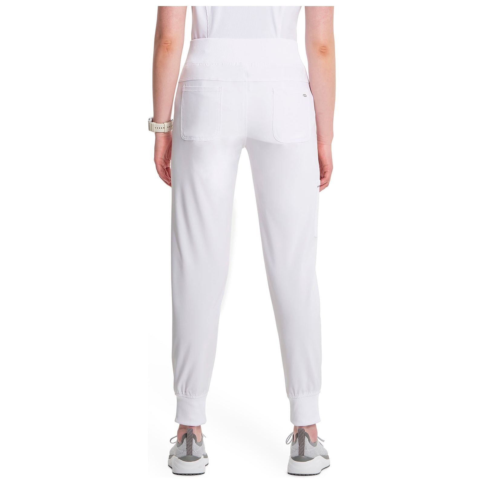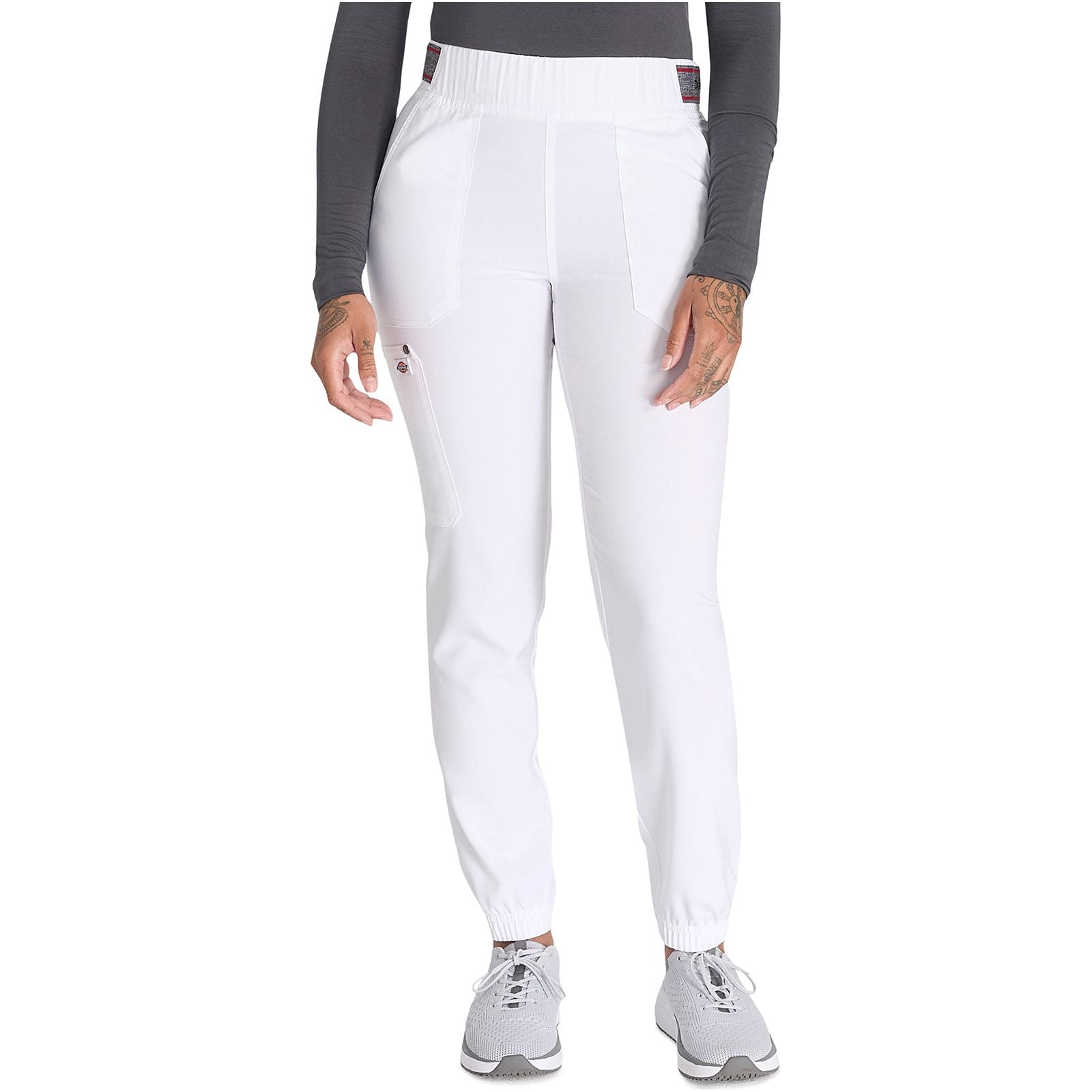 A Contemporary fit, mid rise, jogger features a rib knit elastic waistband with front angled zipper pockets, a cargo pocket with reflective tape, two back patch pockets, rib knit leg bands for adjustable length and coverstitch detail throughout. Inseam: 28 1/2". The comfortable stretch poplin fabric and super stretchy rib knit is the perfect combo for healthcare professionals.
