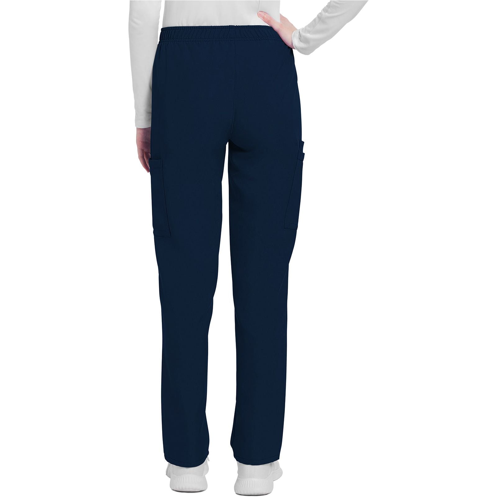 This mid rise pull-on pant has an elasticized waistband and an updated slimmer leg. There are three pockets for storage: two roomy cargo pockets and an additional accessory pocket inside the right cargo pocket. Cargo pockets include reverse hem trim. Decorative tonal topstitching for added detailing. Slim straight leg, 16" opening. Inseam: 31"