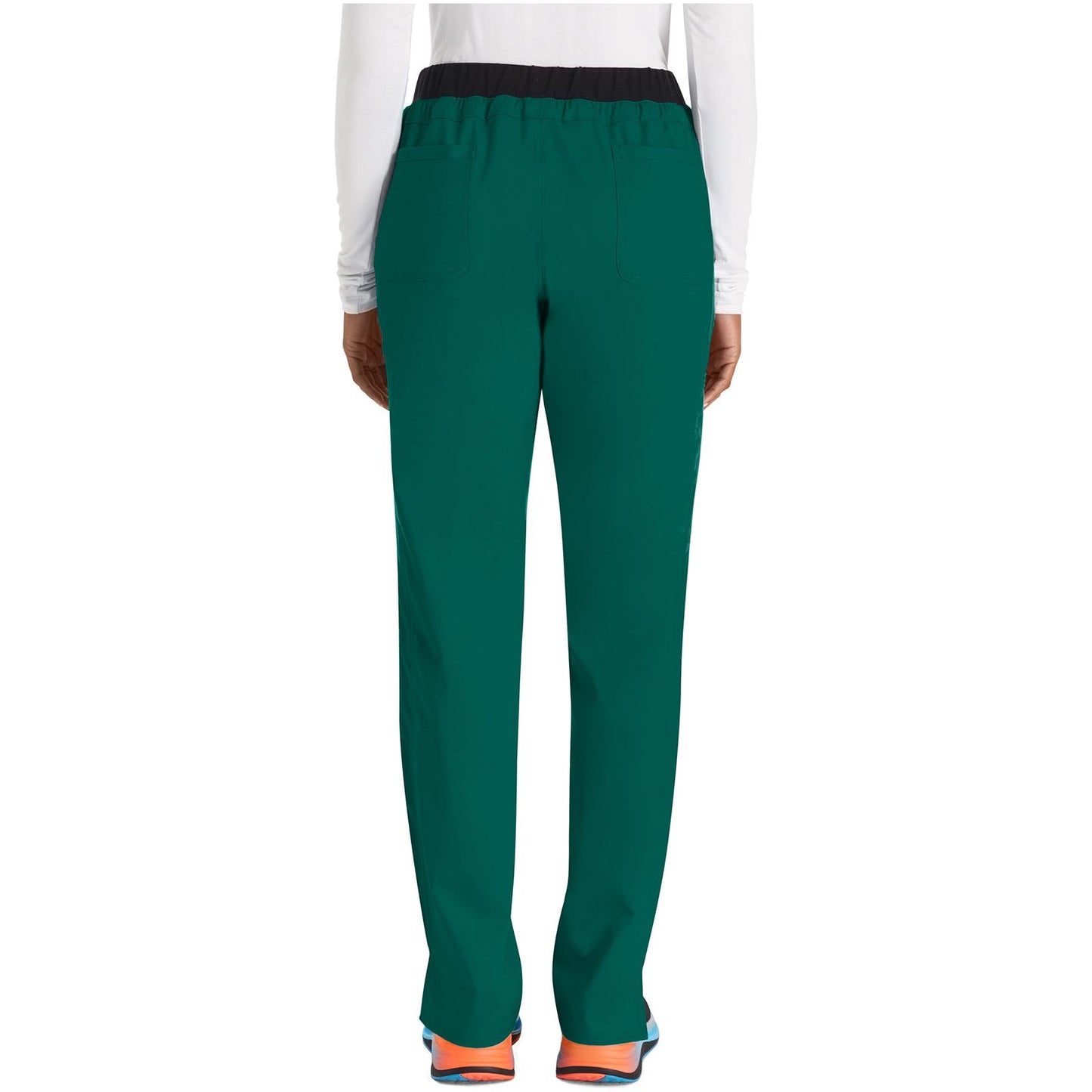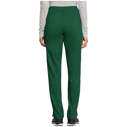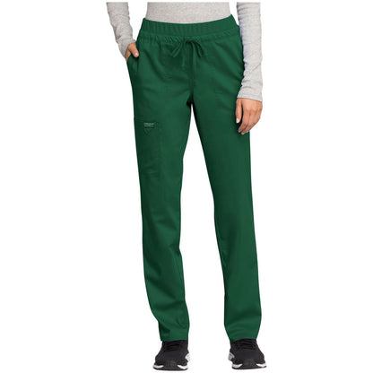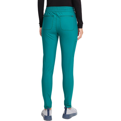 This Contemporary fit mid rise pant has a multi-needle stitched elastic encased waistband with drawstring. Drawstring includes antique copper-colored tips. There are five pockets in total: two front angled pockets, one zip cargo pocket and two zip back patch pockets. Tapered leg, 9 1/2" opening. Inseam length: 29"
