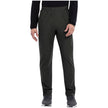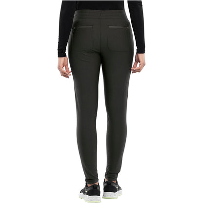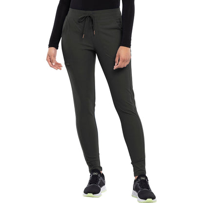 This Contemporary fit mid rise pant has a multi-needle stitched elastic encased waistband with drawstring. Drawstring includes antique copper-colored tips. There are five pockets in total: two front angled pockets, one zip cargo pocket and two zip back patch pockets. Tapered leg, 9 1/2" opening. Inseam length: 29"