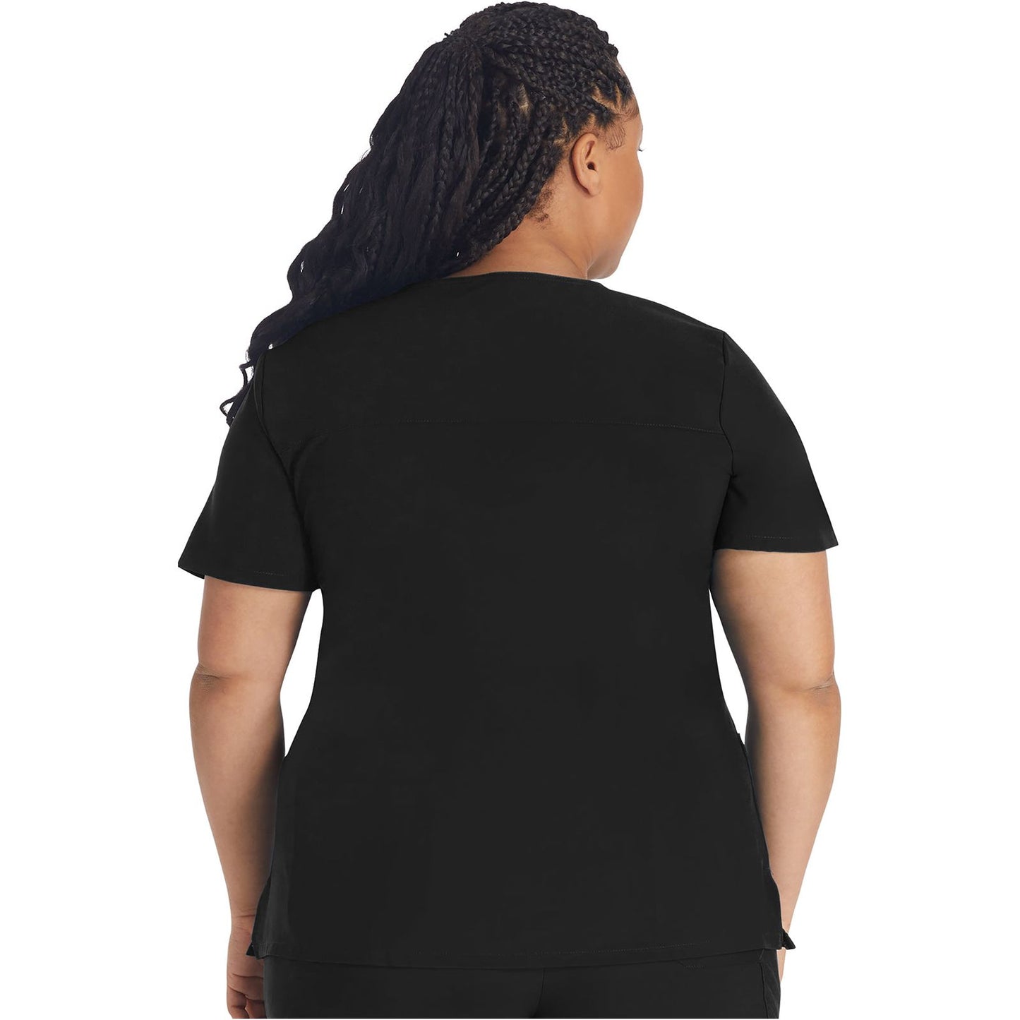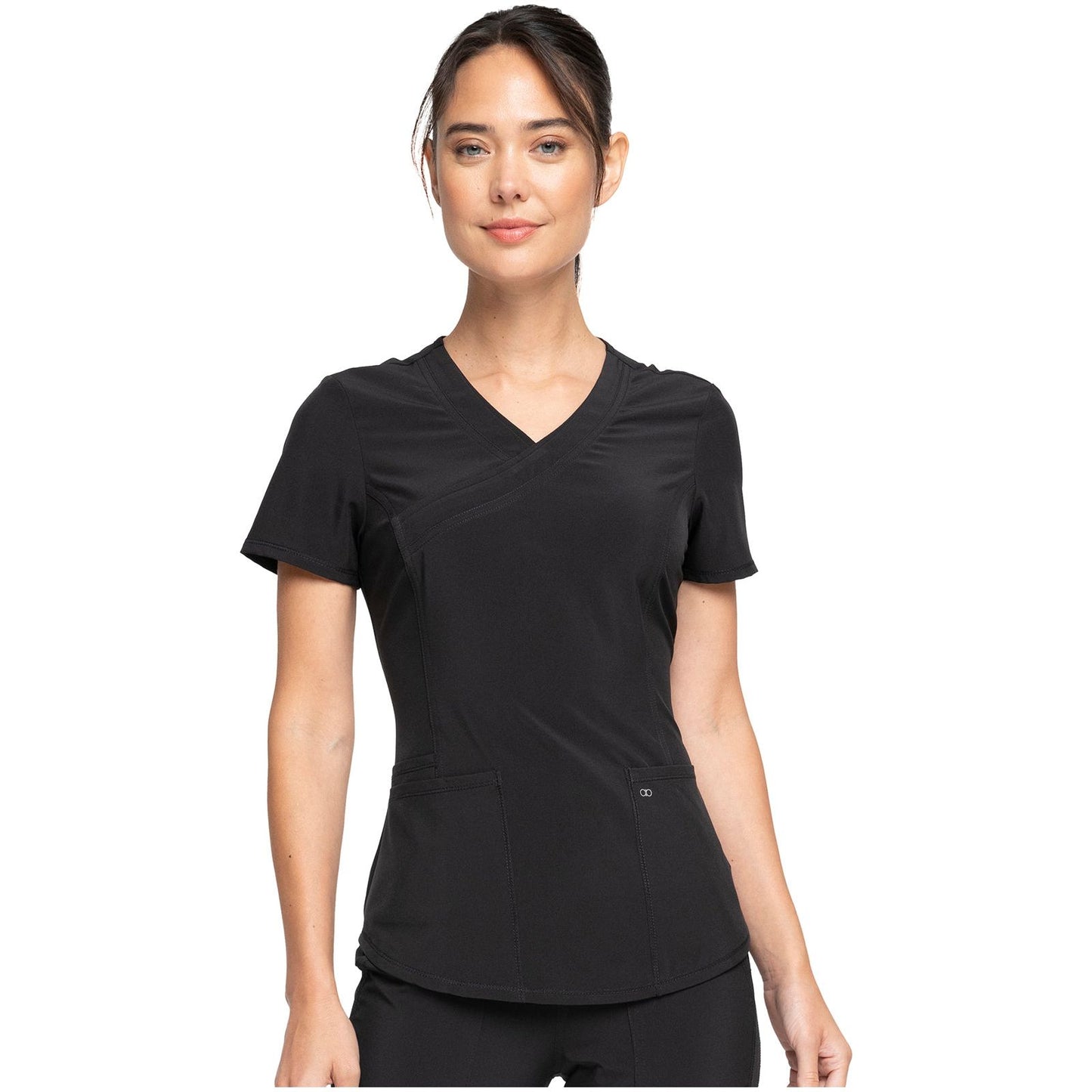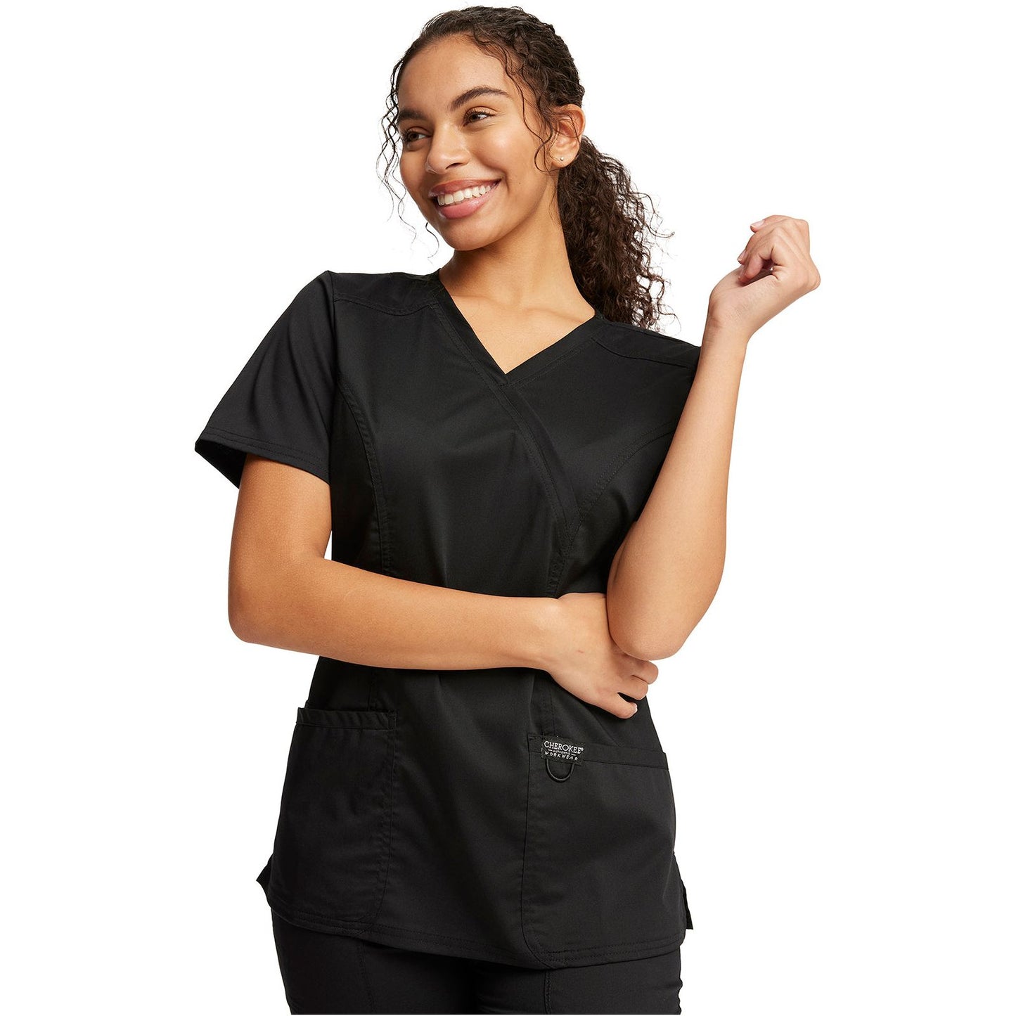 A Contemporary fit mock wrap top features two set-in front pockets, a logo O-ring above left pocket, left scissor pocket, one interior pocket, front and back princess seams, and side vents. Stretch rib knit at the center back panel gives this top its slimming shape and allows for extra movement and comfort. Center back length: 26". The comfortable stretch poplin fabric and super stretchy rib knit is the perfect combo for healthcare professionals.