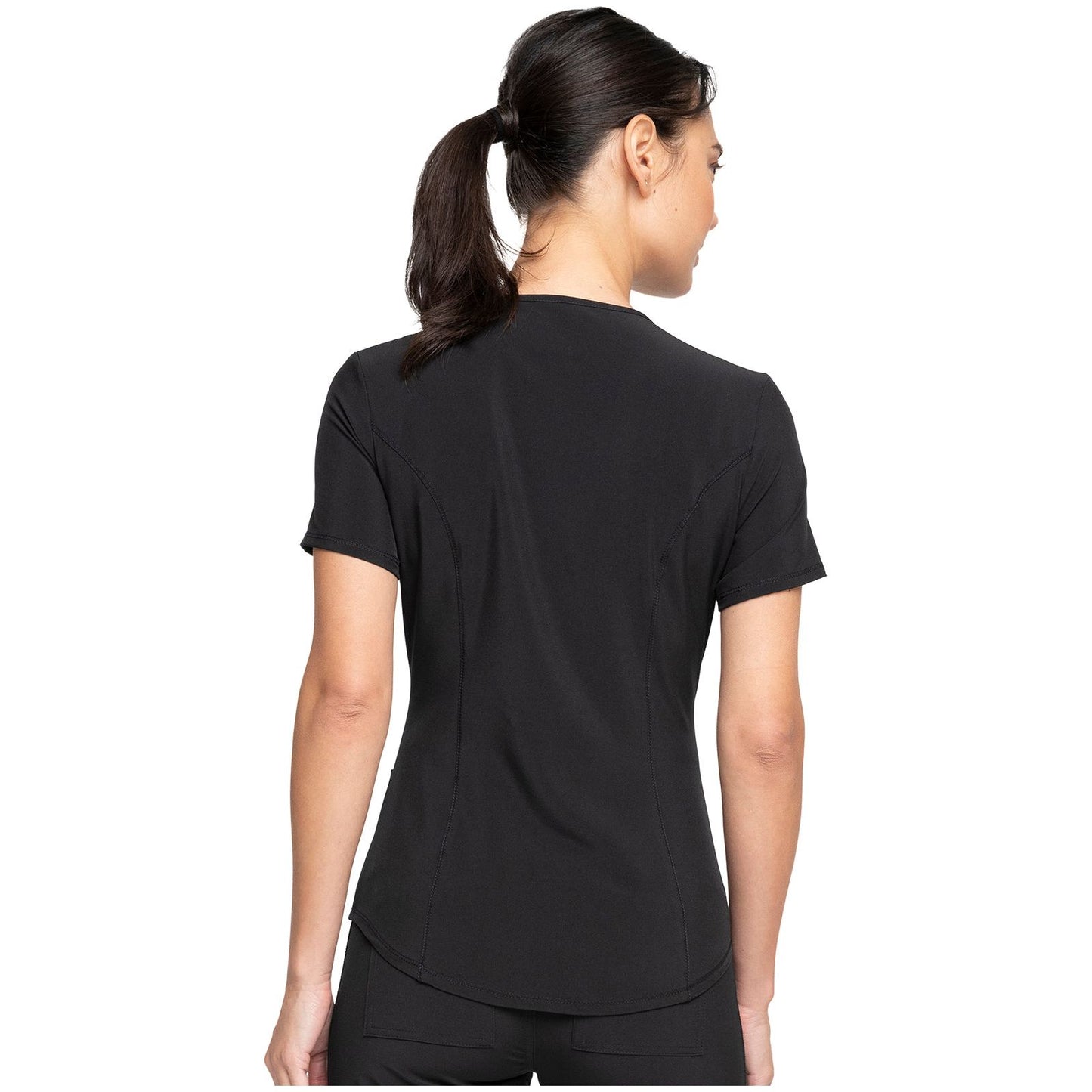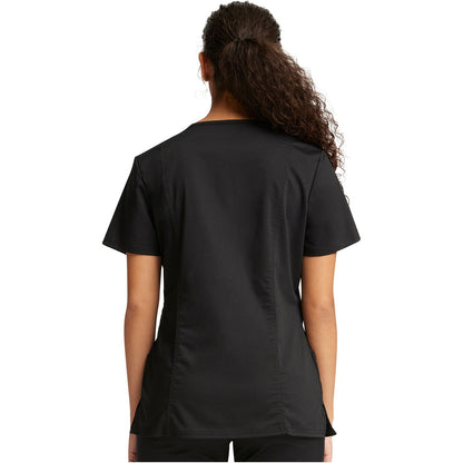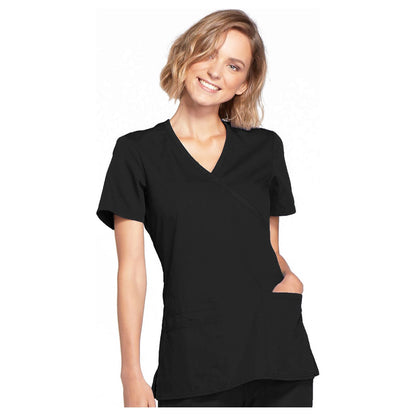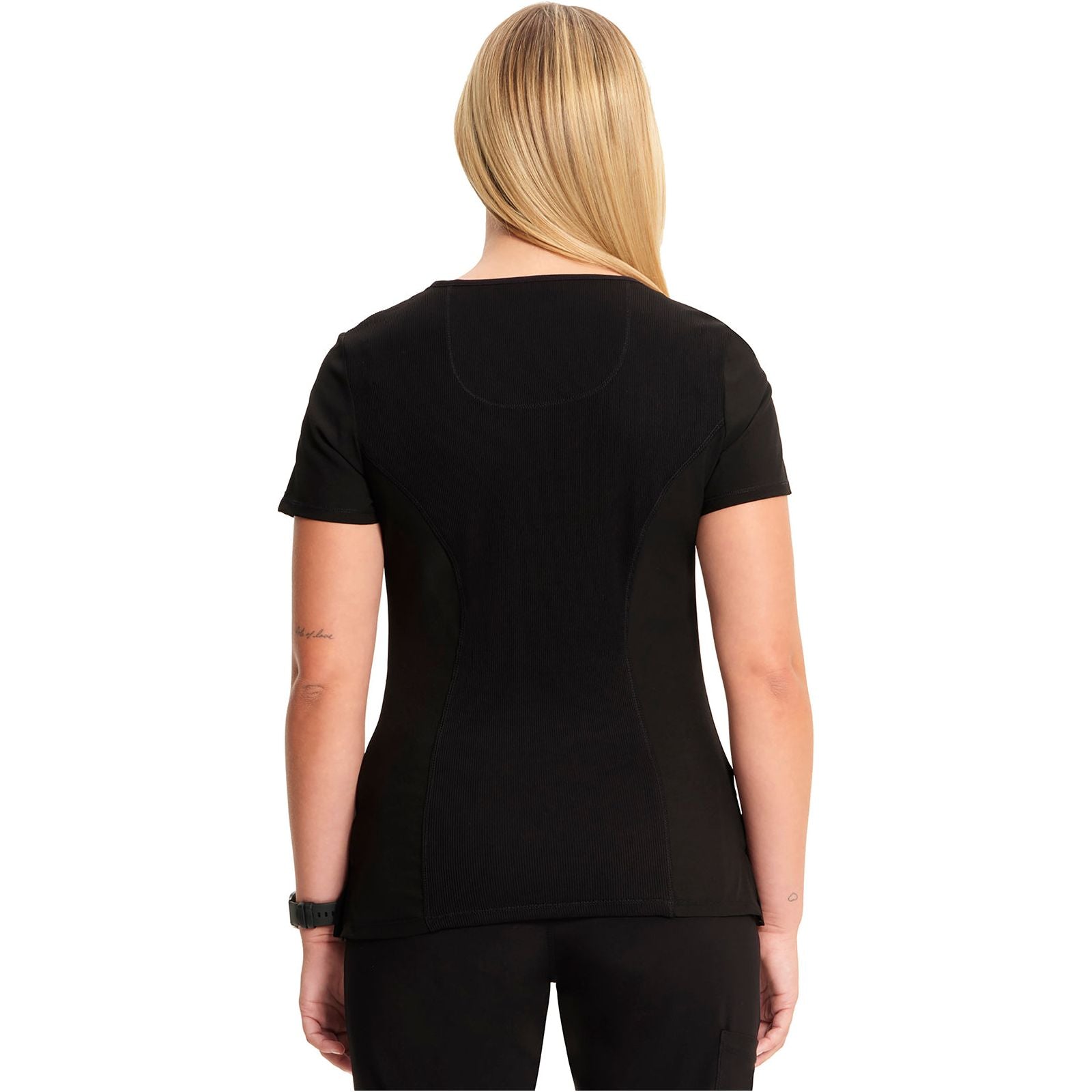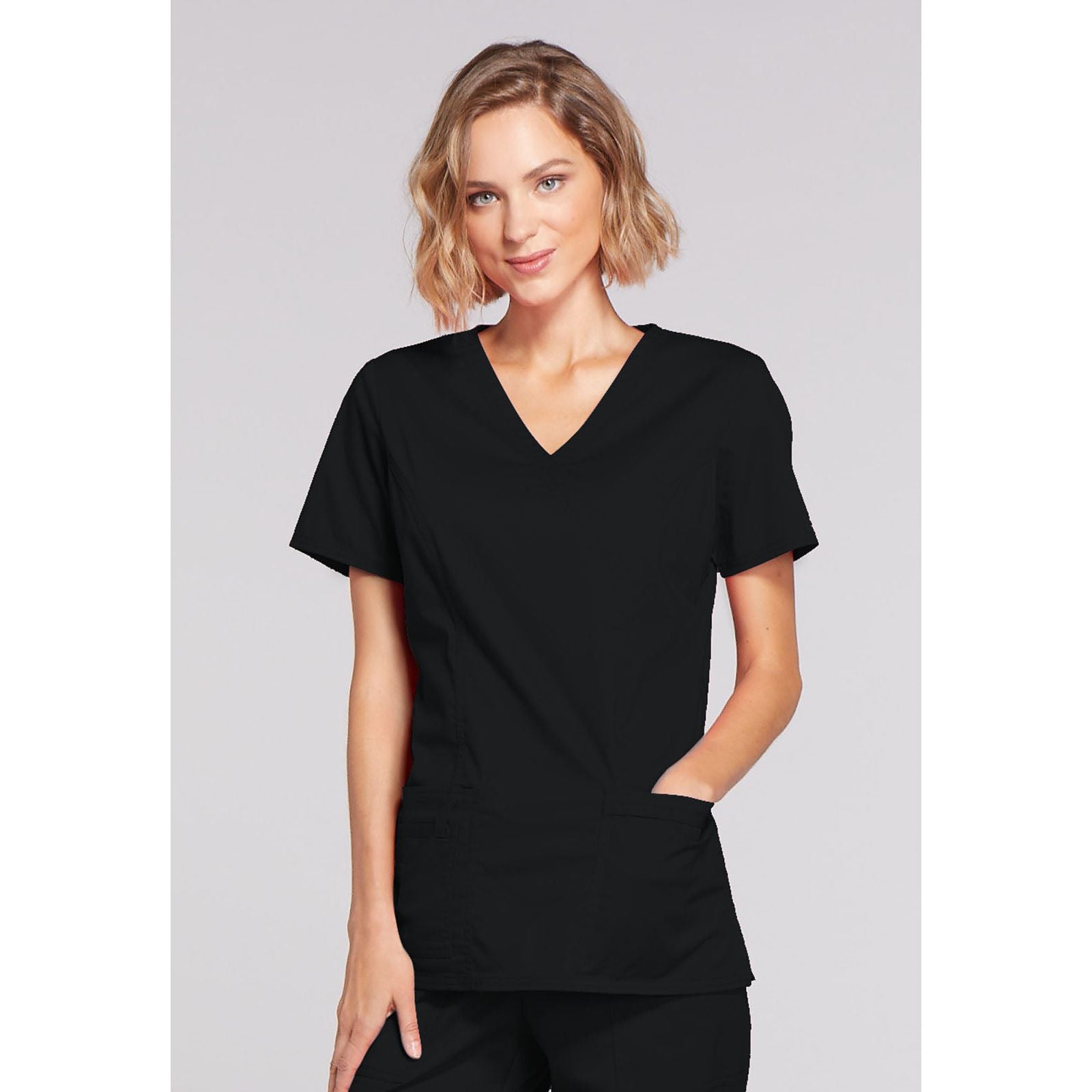A Contemporary fit mock wrap top features two set-in front pockets, a logo O-ring above left pocket, left scissor pocket, one interior pocket, front and back princess seams, and side vents. Stretch rib knit at the center back panel gives this top its slimming shape and allows for extra movement and comfort. Center back length: 26". The comfortable stretch poplin fabric and super stretchy rib knit is the perfect combo for healthcare professionals.