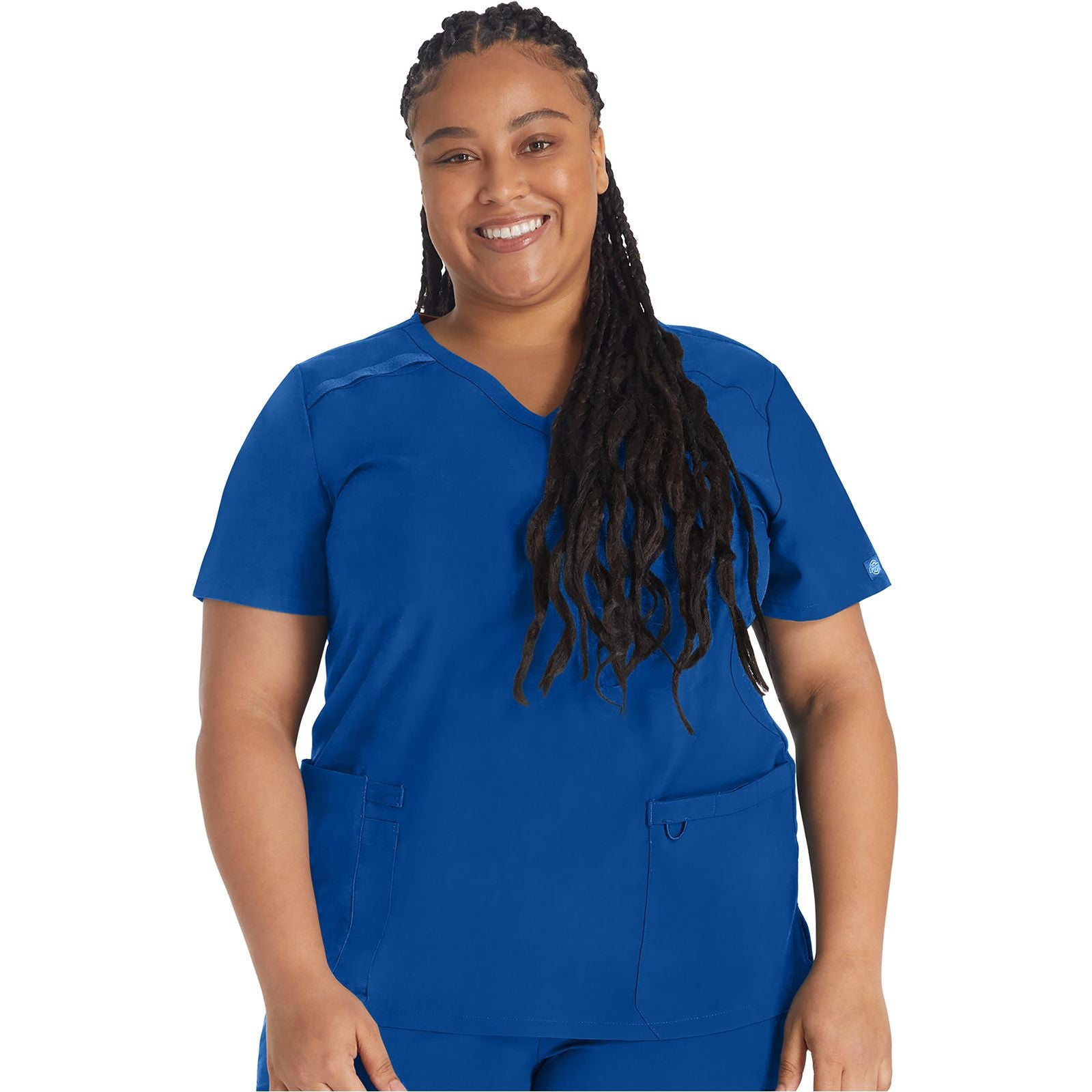 A Contemporary fit mock wrap top features two set-in front pockets, a logo O-ring above left pocket, left scissor pocket, one interior pocket, front and back princess seams, and side vents. Stretch rib knit at the center back panel gives this top its slimming shape and allows for extra movement and comfort. Center back length: 26". The comfortable stretch poplin fabric and super stretchy rib knit is the perfect combo for healthcare professionals.