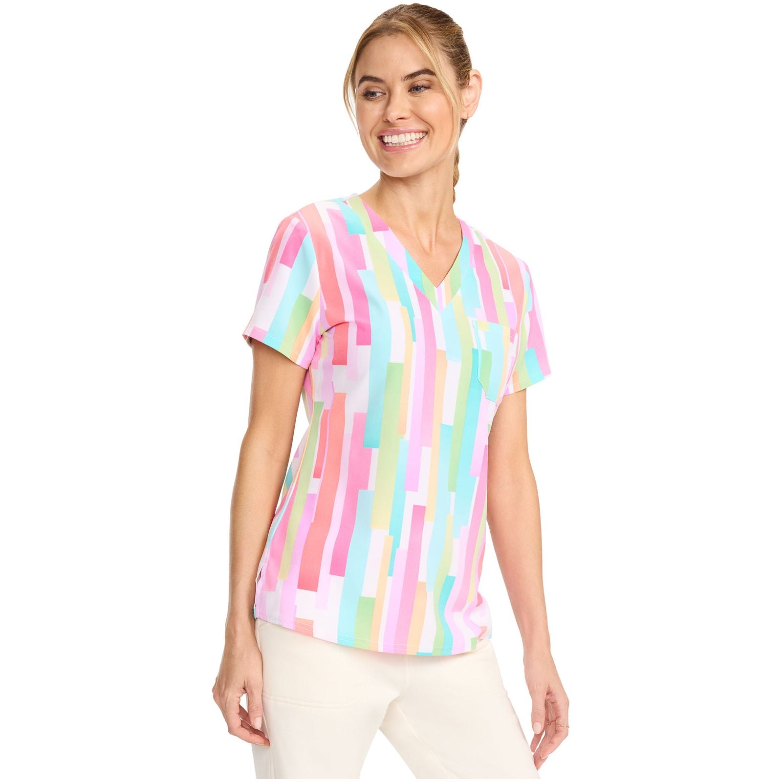 The Missy Fit V-Neck Print Top adds a vibrant touch to your wardrobe with fun, seasonal prints and a flattering silhouette. Made from Med Couture's super comfortable dobby weave fabric, it features 4-way stretch, moisture-wicking properties, and easy-care convenience. Designed with one pocket, short sleeves, side vents, and a curved hem, this top perfectly balances style, performance, and all-day comfort. CBL: 26".