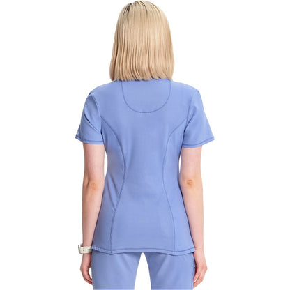 A Contemporary fit round neck top with a rib-knit inset at the front neckband also features shoulder yokes, a bungee ID badge loop on the right shoulder, front and back princess seams, two patch pockets, one interior pocket, and side vents. Stretch rib-knit at the center back panel gives this top its slimming shape and allows for extra movement and comfort. Coverstitch detail throughout. Center back length: 26". The comfortable stretch poplin fabric and super stretchy rib-knit is the perfect combo for healthcare professionals.